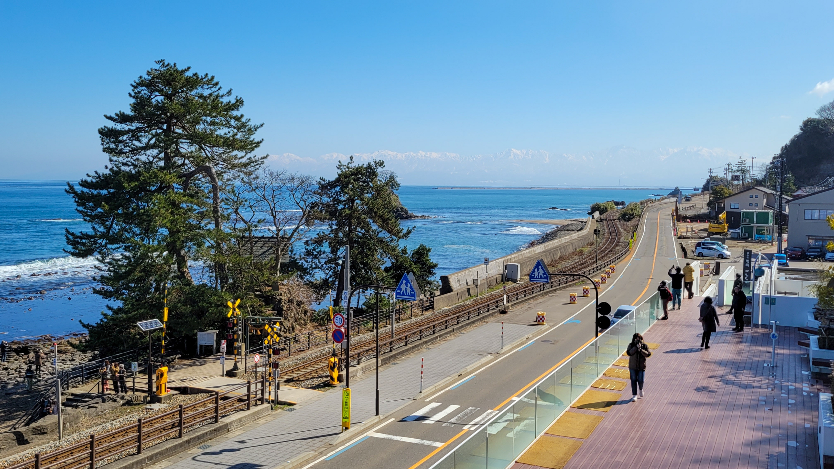 道の駅の2階、3階のテラスからの眺望も良く、特に氷見線と立山連峰を撮るには絶好のスポットみたいです。三脚を立てて待っている人が多くいたので、自分も手持ちですが待ってみました。