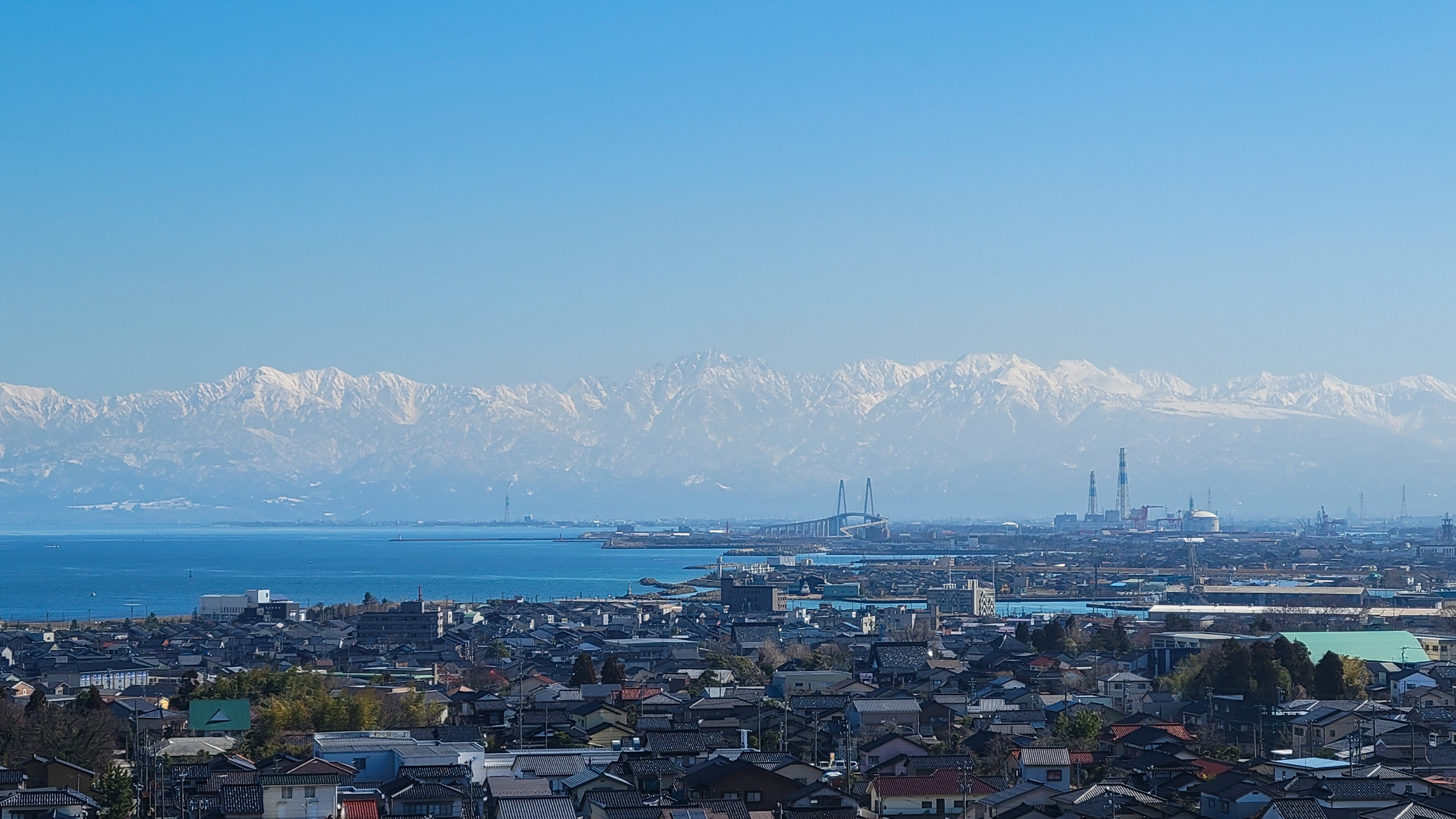 眼下に伏木の町並み、富山港湾の風景と新湊大橋、そして立山連峰。