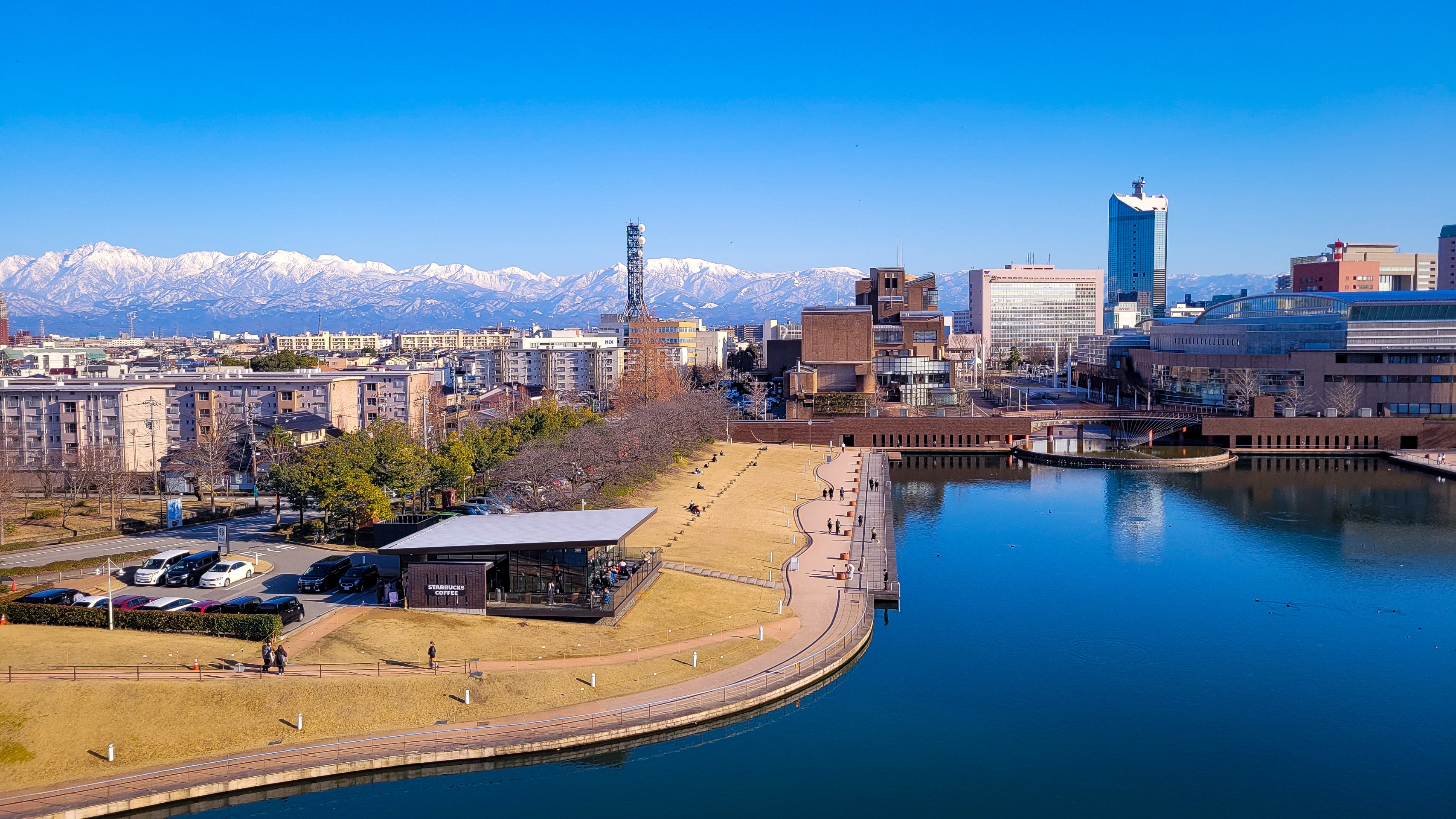 世界一美しいスターバックスと称されることもあるスターバックス富山環水公園店。後ろには桜並木があるので、桜が咲く頃には最高の景色となりそうです。