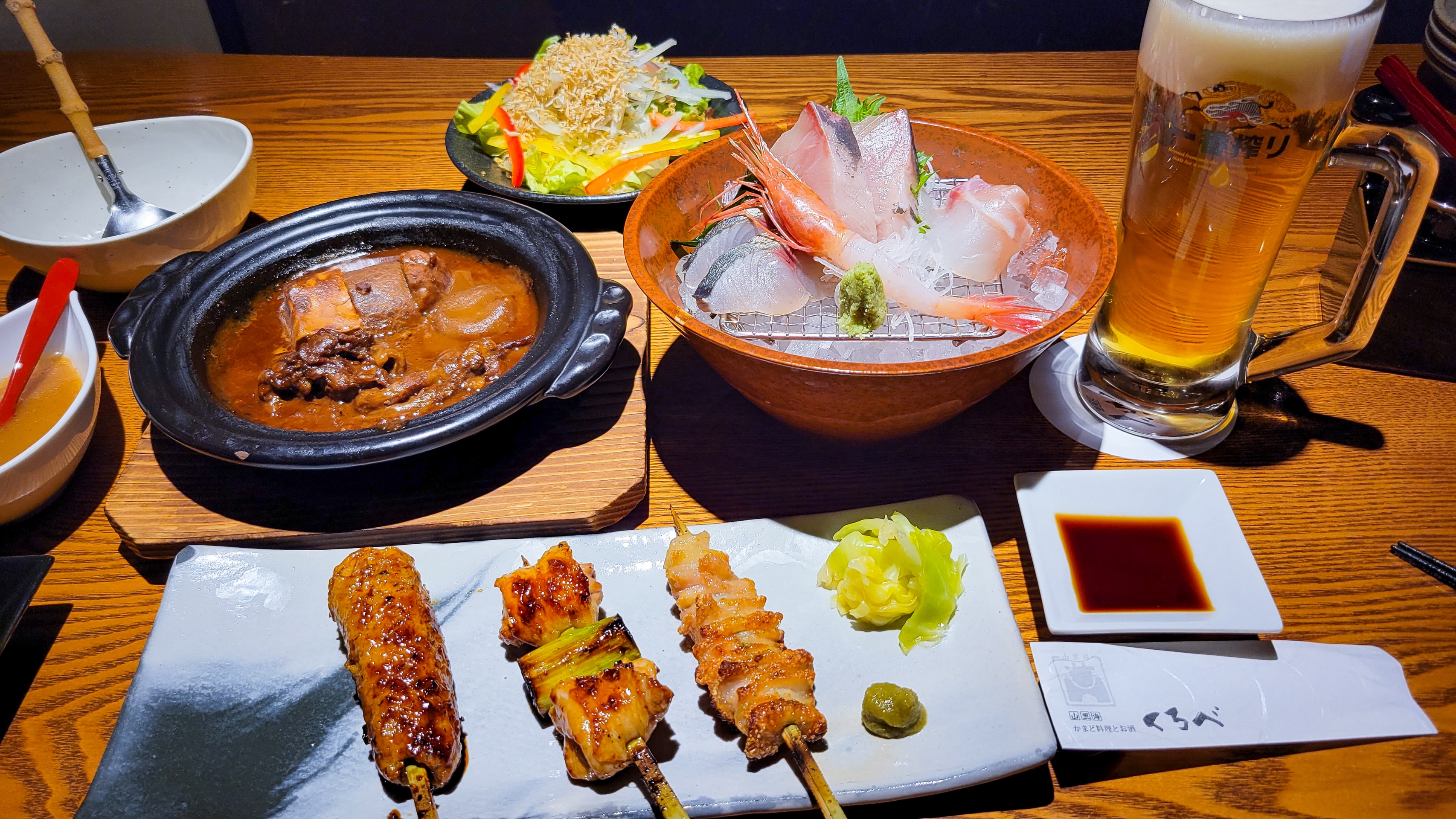 じゃこサラダ、刺身盛り合わせ、おでん盛り合わせ、飛騨地鶏の焼き鳥