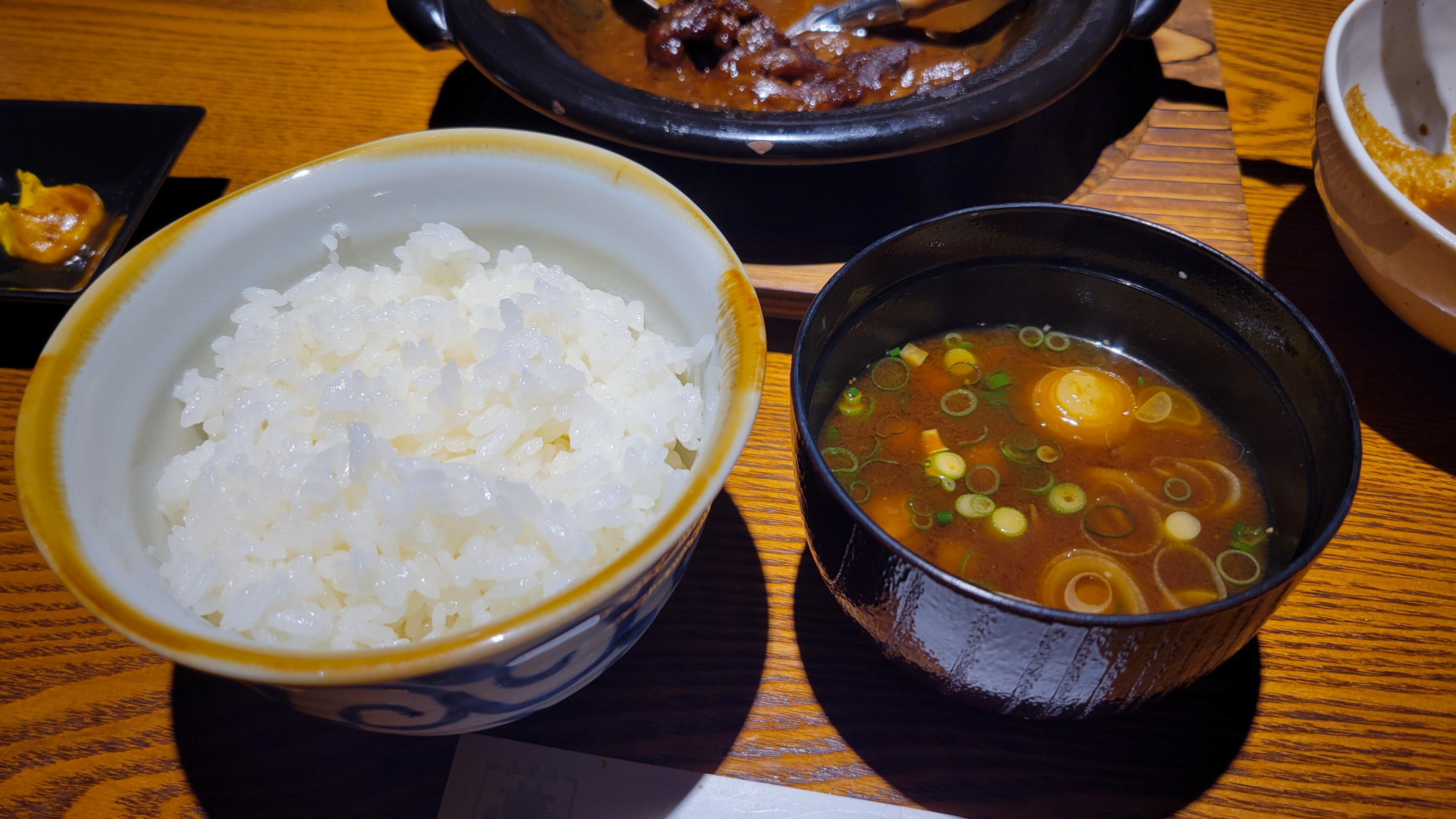 〆の白ご飯とみそ汁を持ってきて頂きました。