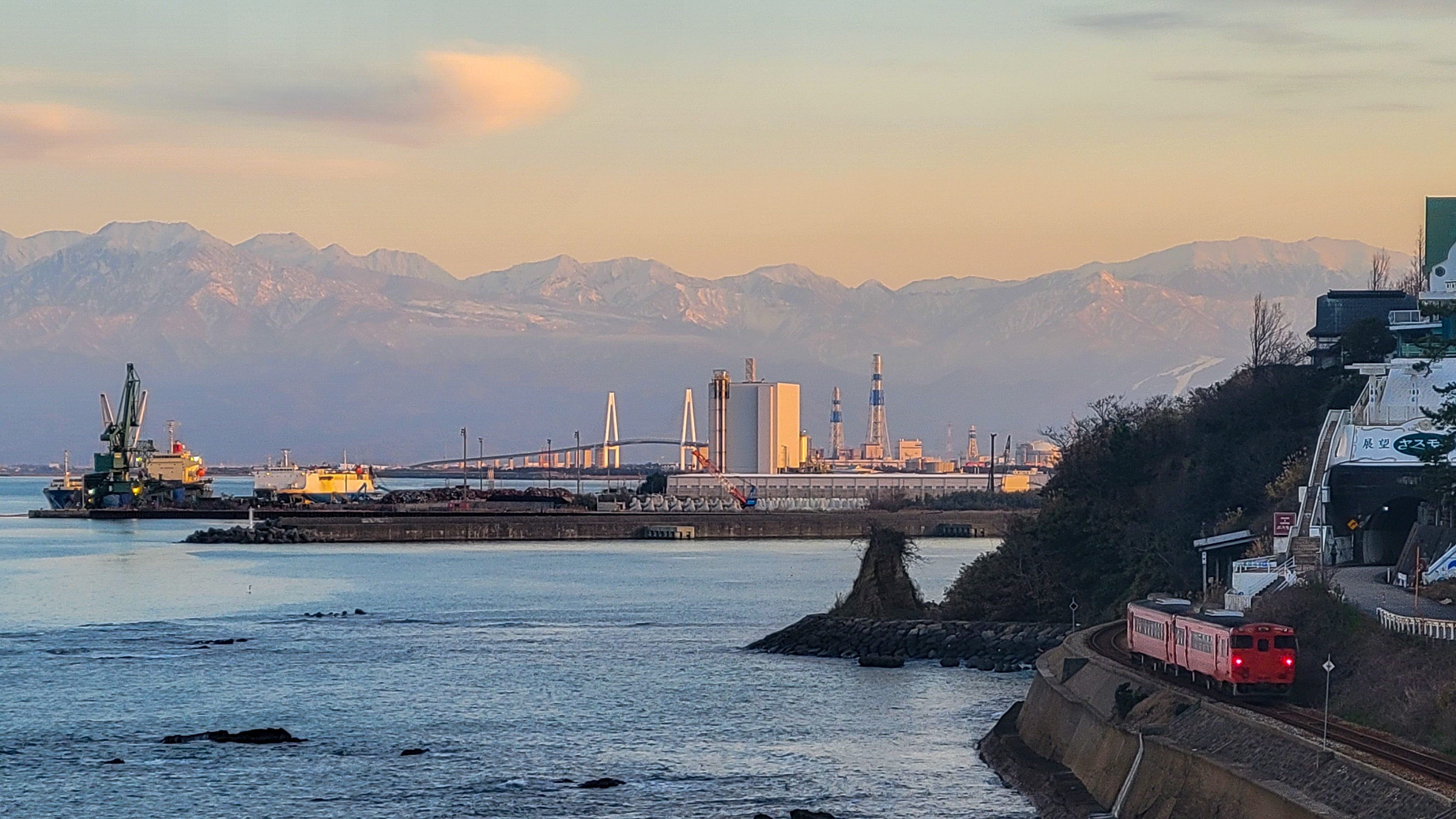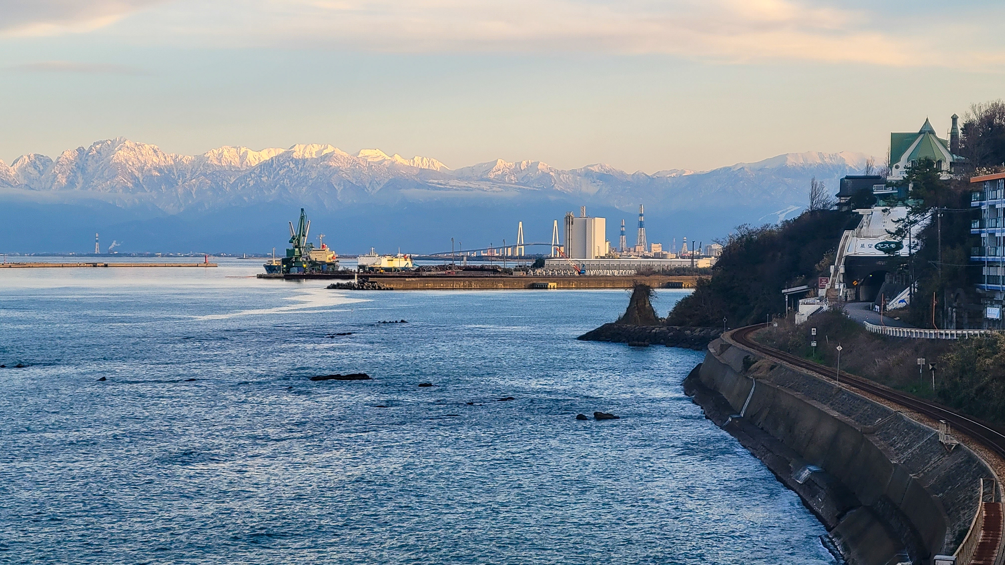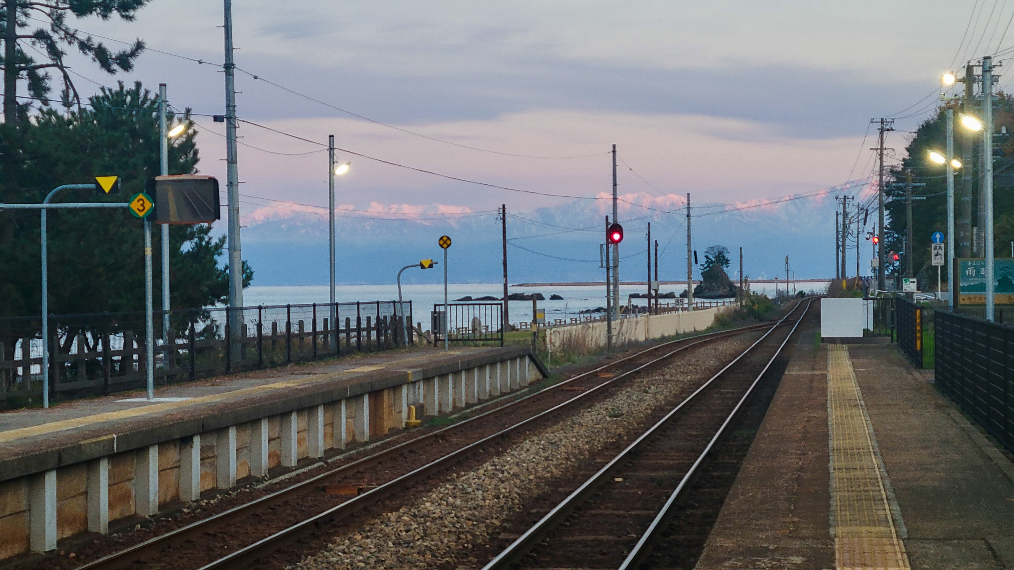 残念ながら氷見線が通るころには立山連峰に日差しが届かなくなってました。