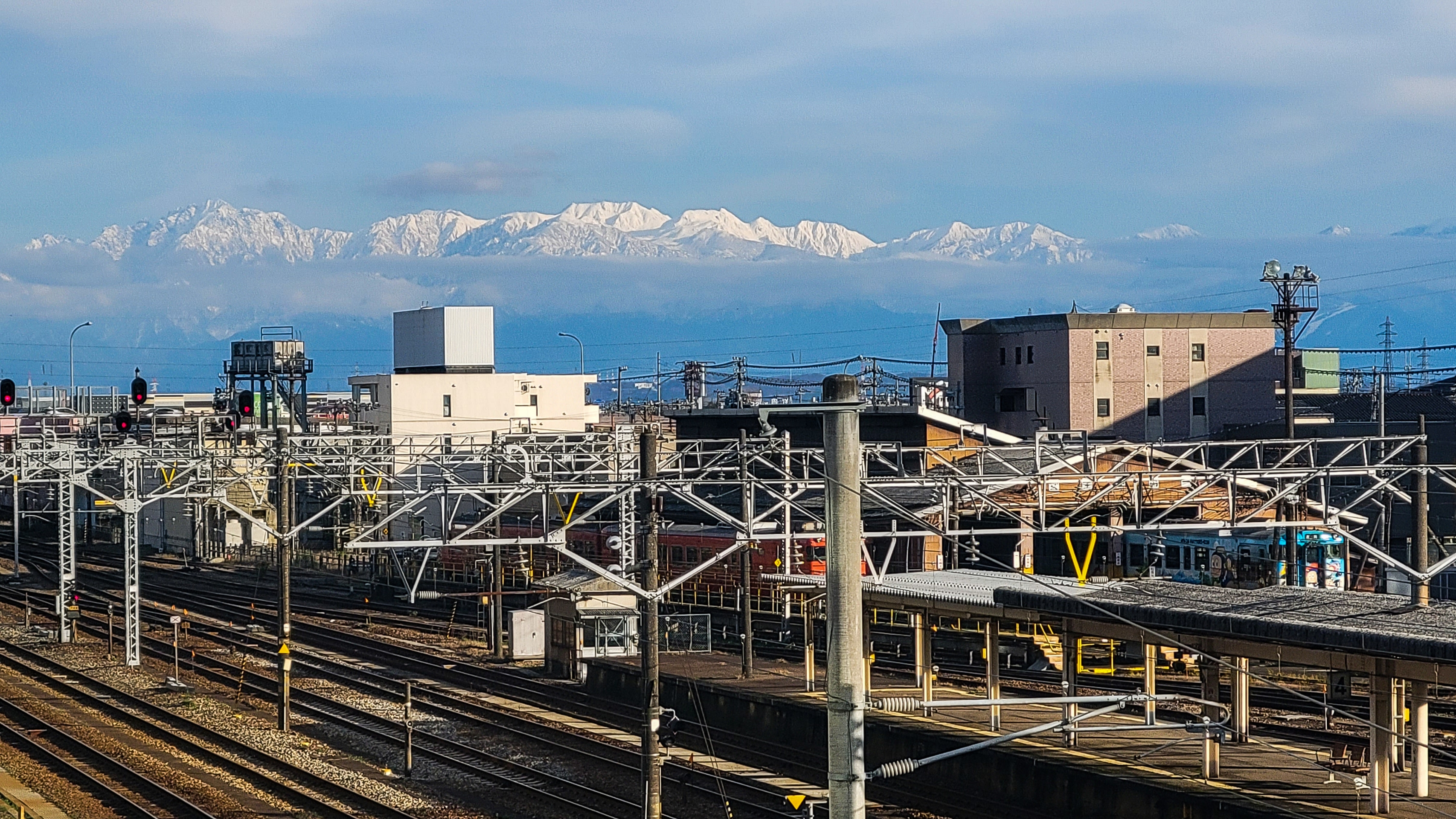 高岡駅の橋上部分から立山連峰が綺麗に見えています。