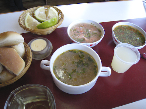 サーモンのセビッチェに、魚介のスープがつきます。