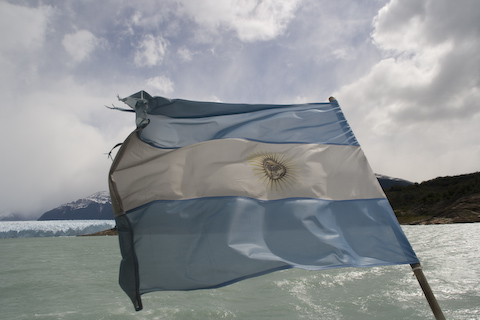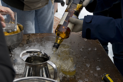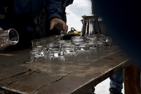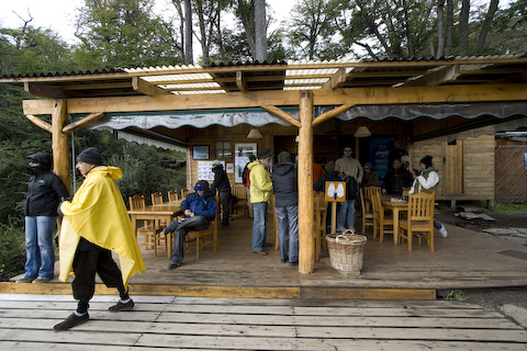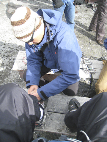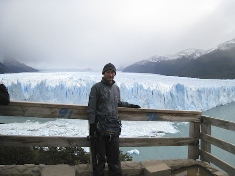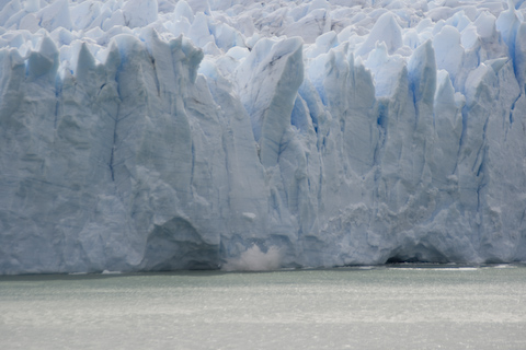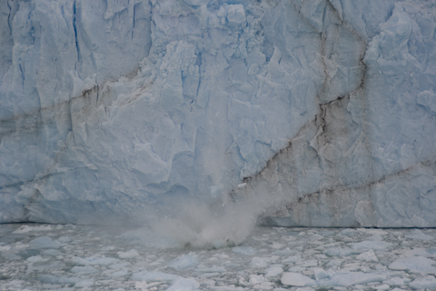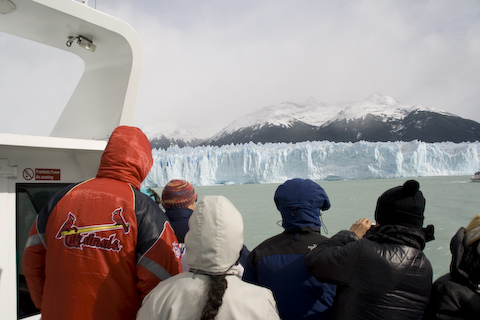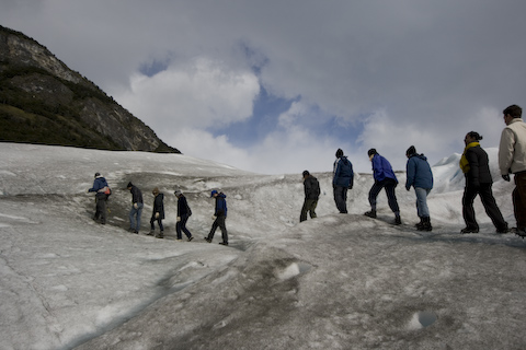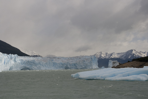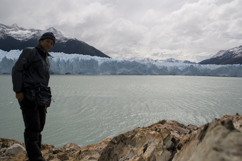 氷河が見える場所で強風に耐えながら、崩落待ち。
