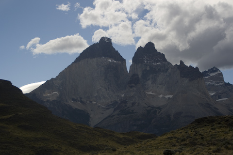 山の右側にそびえたつトーレス・デス・パイネ。氷河の浸食によって形成された、垂直にそそり立つ3つの岩峰で形成されて、高いものは2,850mもあります。