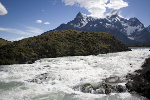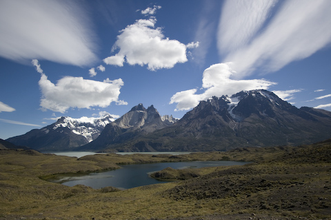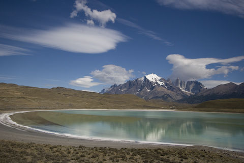 アマルガはスペイン語で「苦い」という意味で、湖水の塩分濃度が高いためこの名前が付けられたそうです。湖に生息するプランクトンの影響で緑がかって見えます。パイネ国立公園の象徴的な山々であるトーレス・デル・パイネの壮大な景色を背景に、美しい風景が広がります。