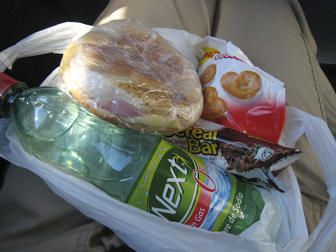 バーガー、スナック菓子2袋、ミネラルウォーター。