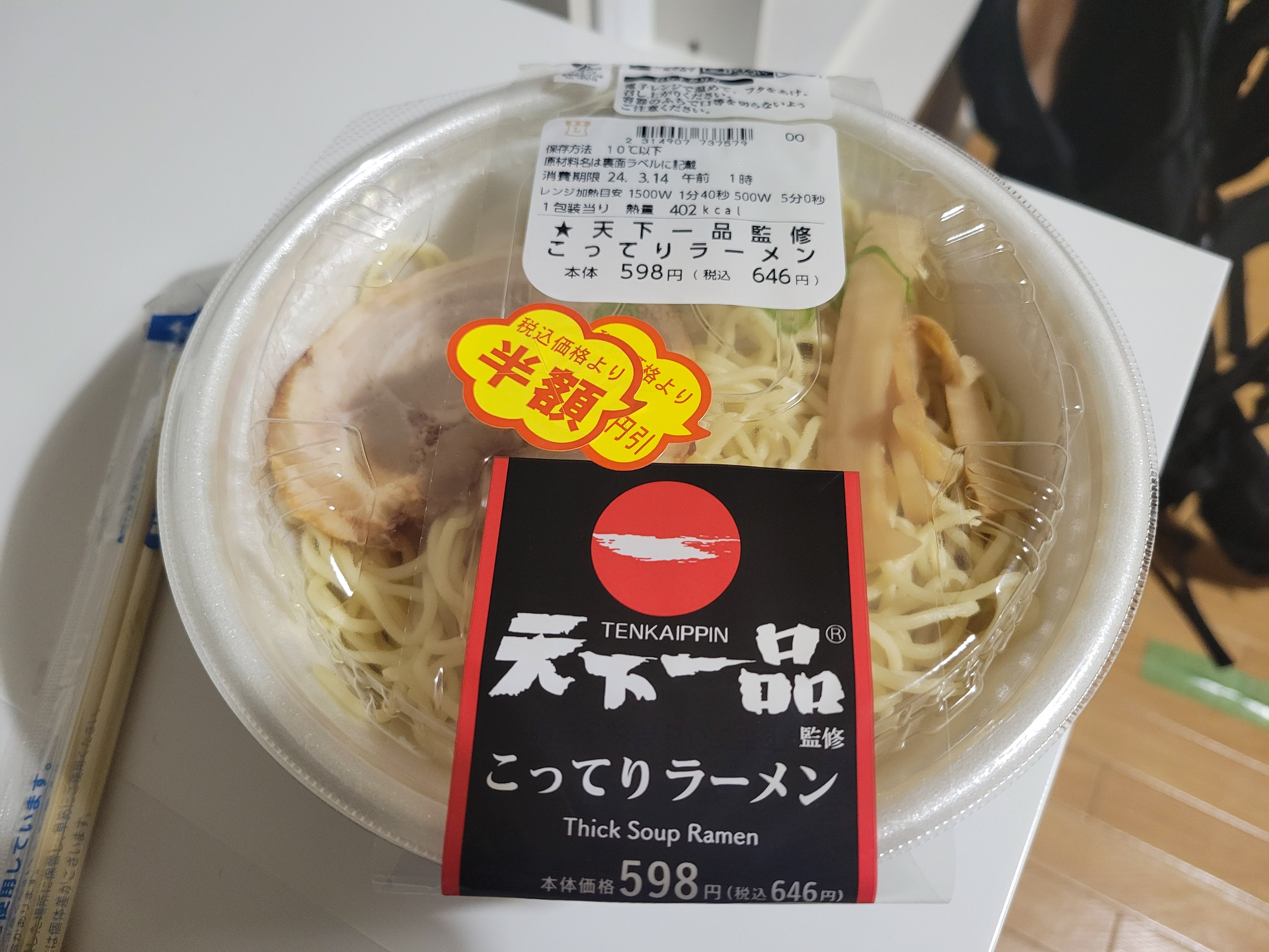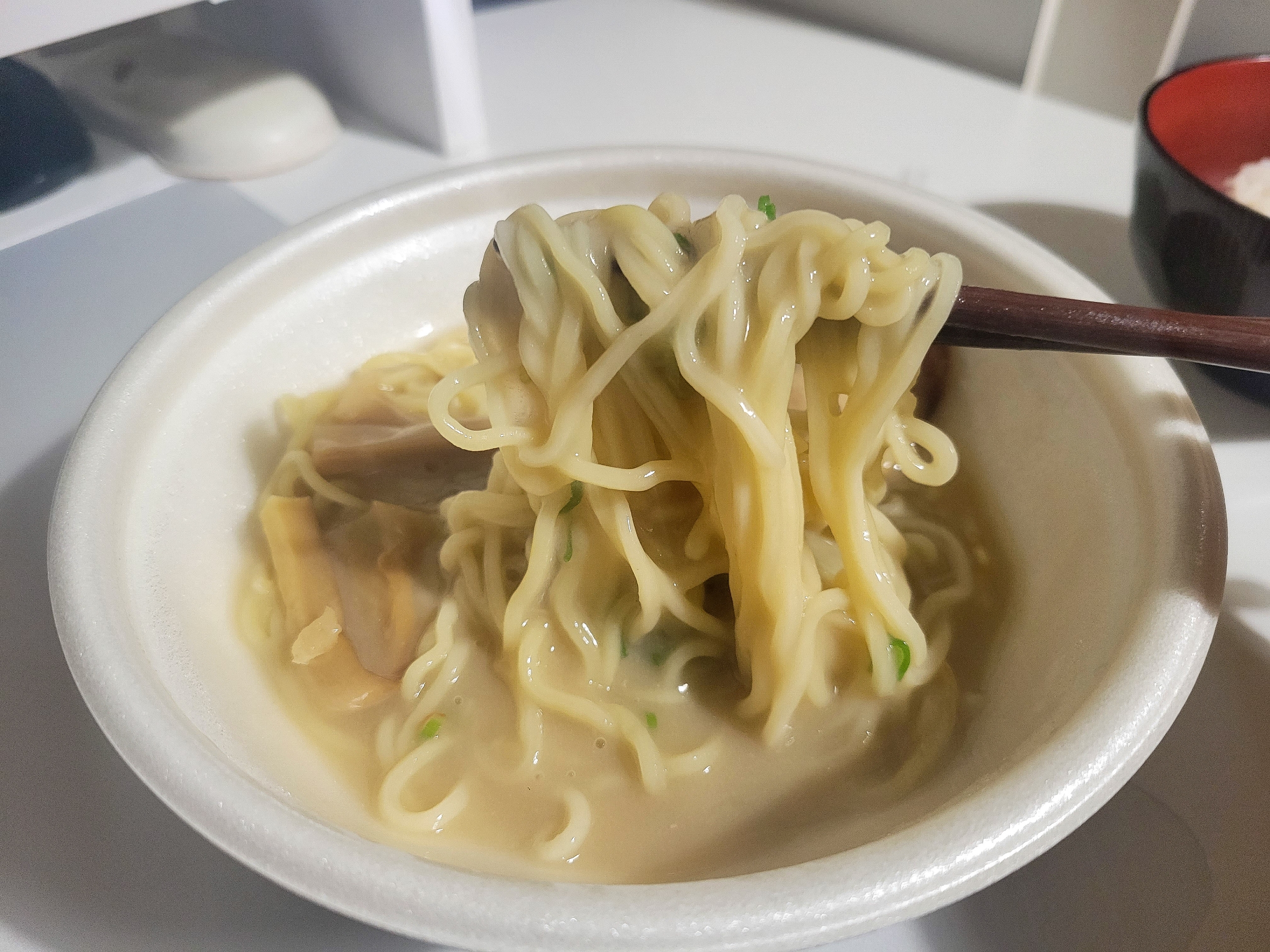 よくできてるとは思うけど、定価646円払うんだったら店に食べにいくかなというレベル。個人的はこってりスープも好きだけど、硬めのストレート麺も好きなんで。