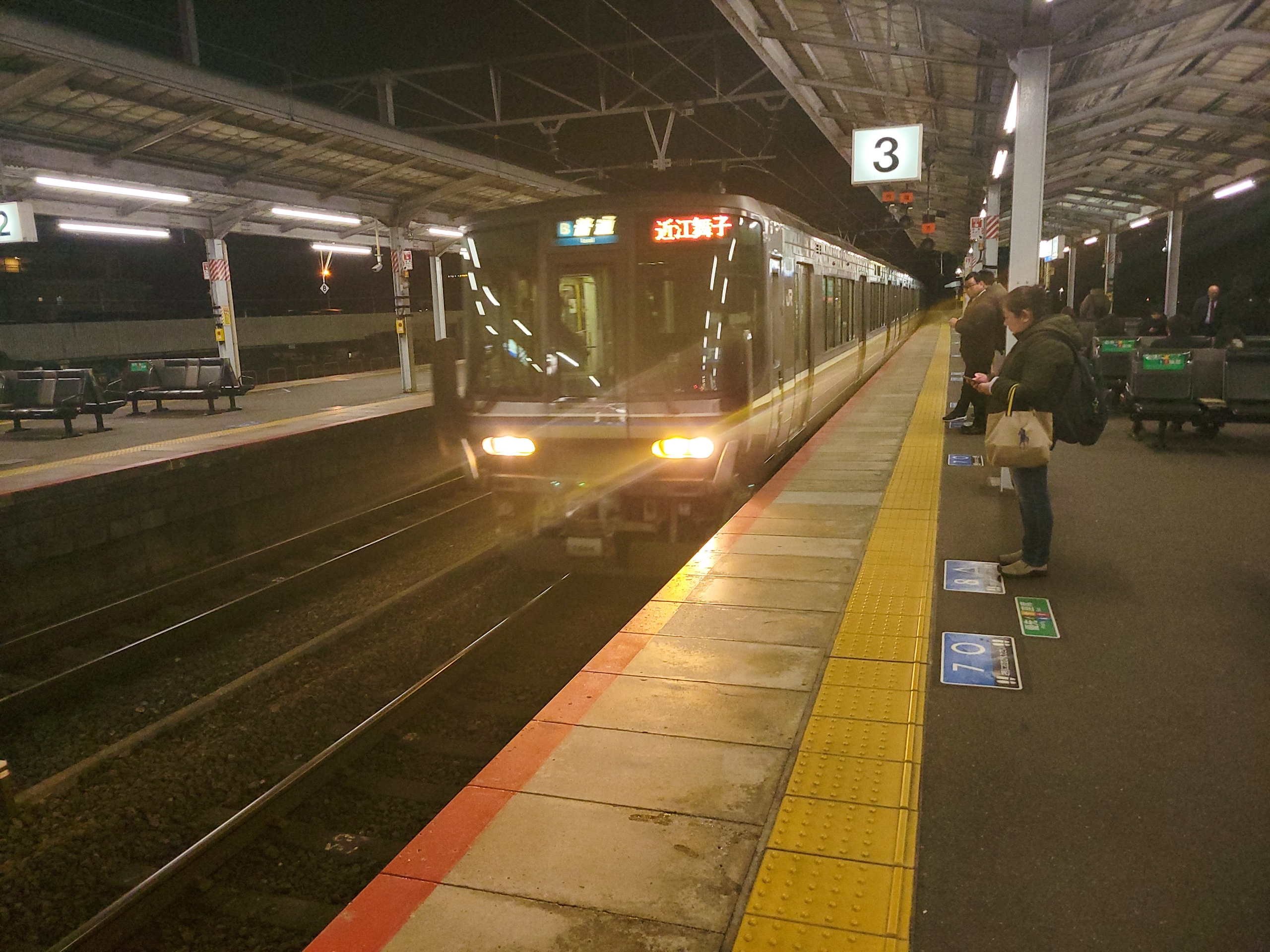 新快速需要は高く、草津駅から満席になりました。また山科駅での待ち時間が寒かった。
