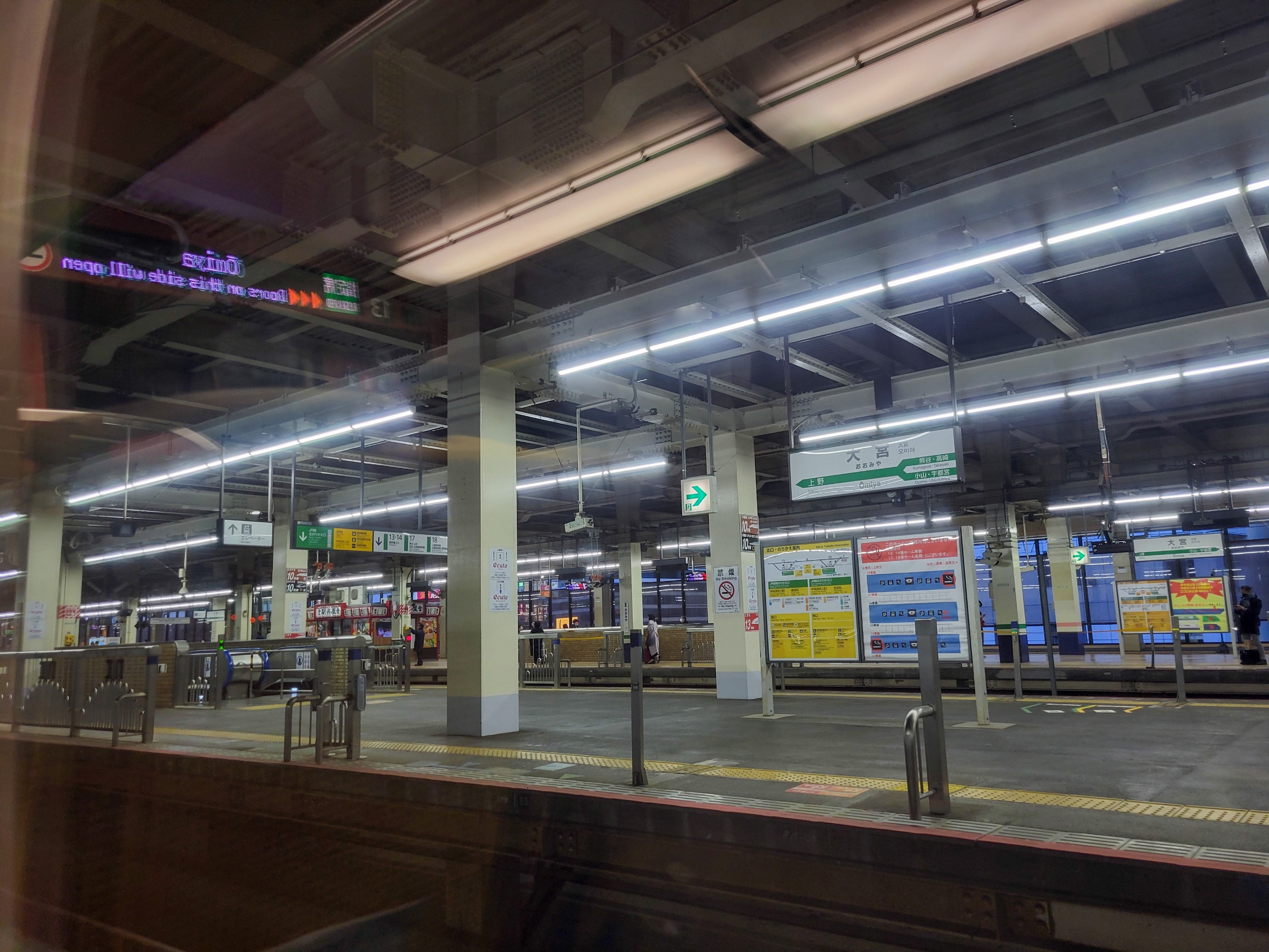 21時半。まだ東京方面のホームにはたくさんの人が待っています。キュンパスがあれば東京駅までまだ行けるけど、景色の見えない夜の無駄な移動は疲れるだけですね。