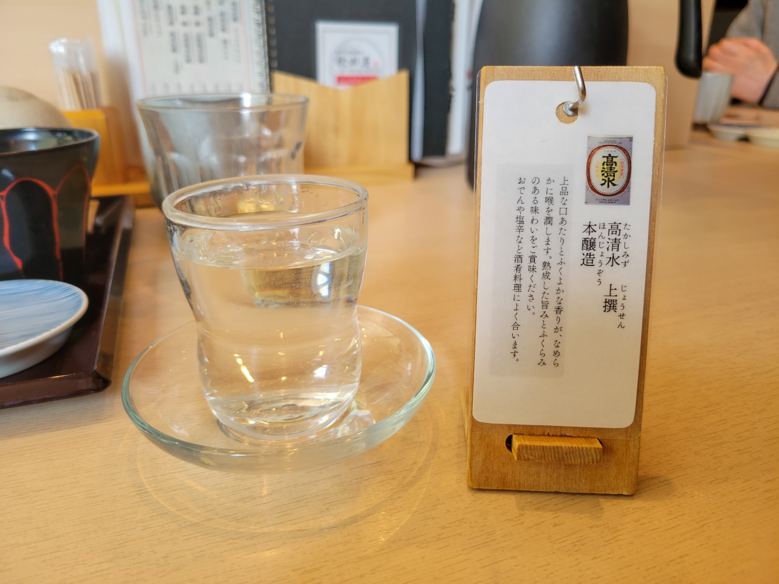 高清水は有名ですね。本醸造の上撰って、いわゆる呑兵衛が毎日飲むお酒で、まさに日本酒っていう酒でした。苦手な醸造アルコールが入ってるけど冷やだったので、まあ飲めました。