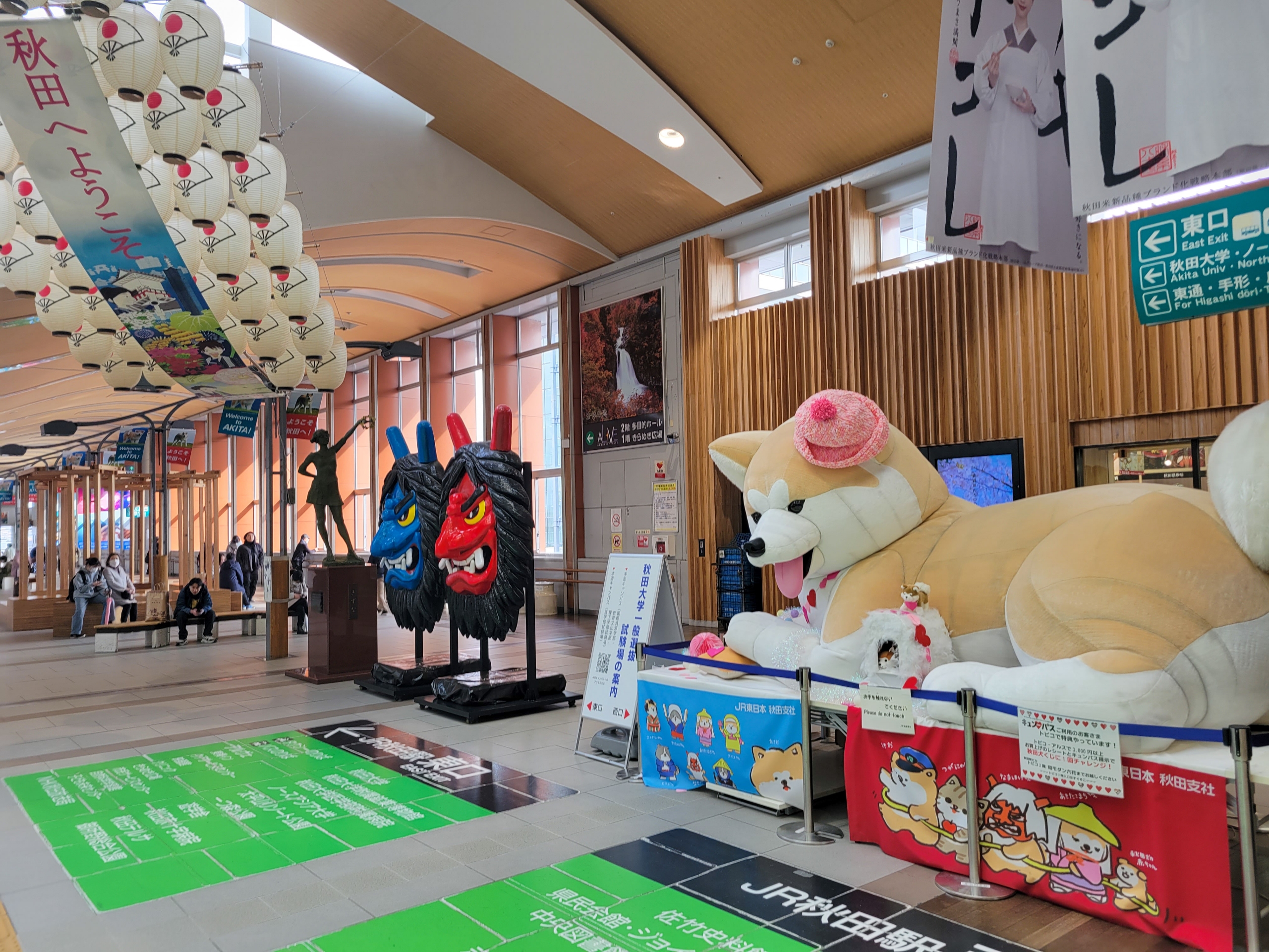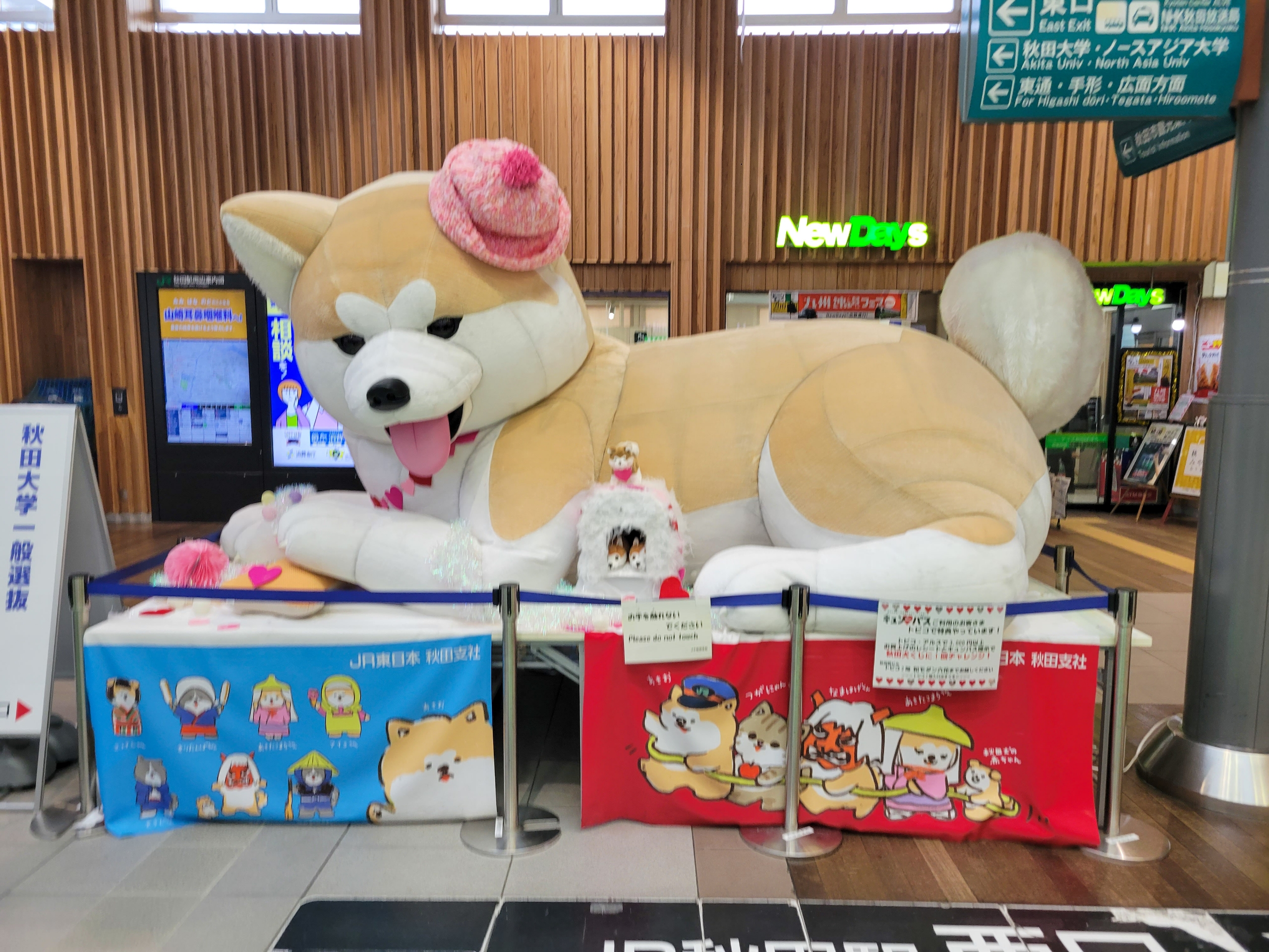新幹線改札前で出迎えてくれるのは、巨大な秋田犬のぬいぐるみ。