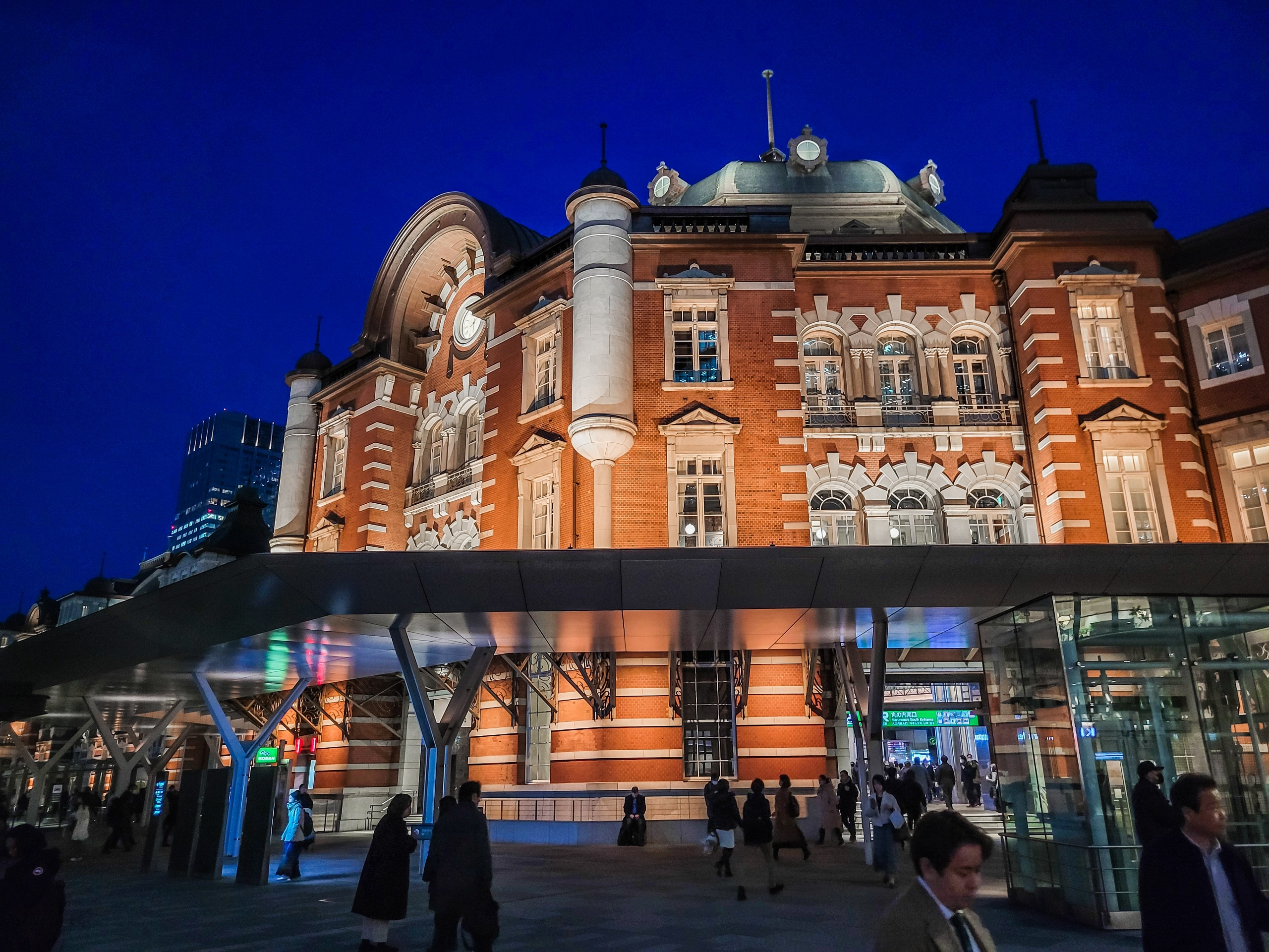 夜は観光地化する東京駅。写真撮影する人がとても多いです。