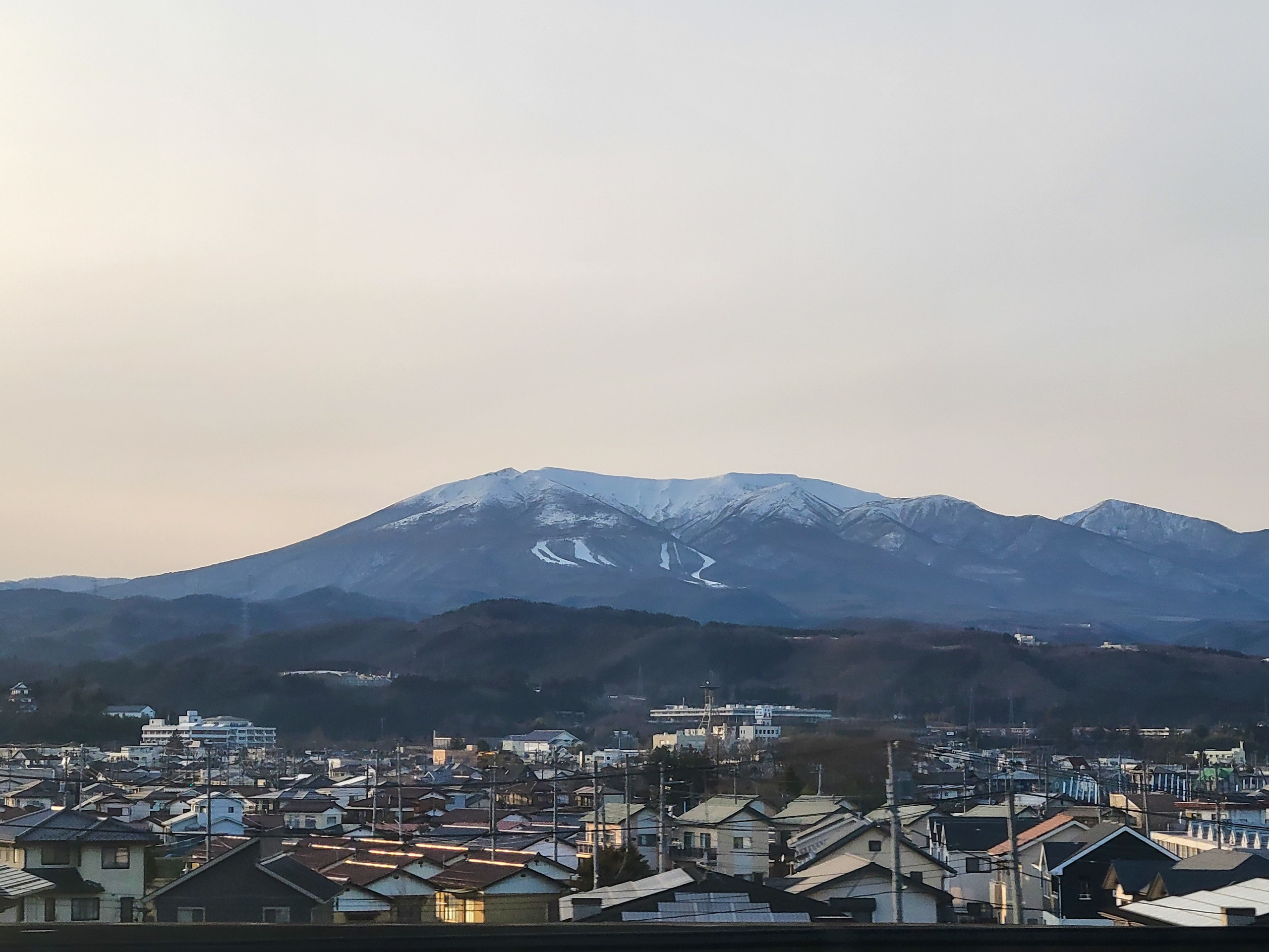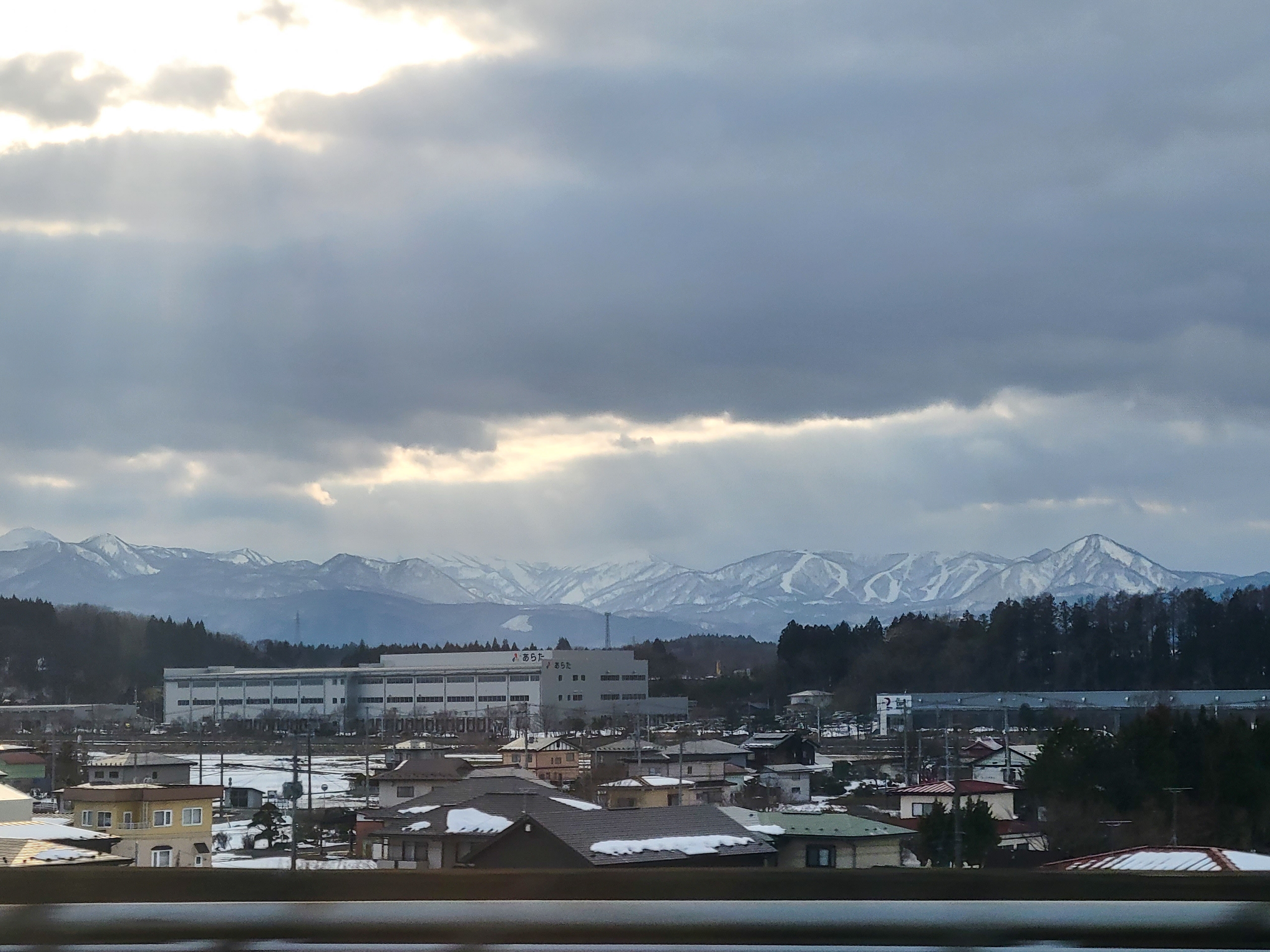 白石蔵王駅付近。行きに見過ごした蔵王連峰。今年は暖冬でスノーモンスターが途中で消えたらしい。