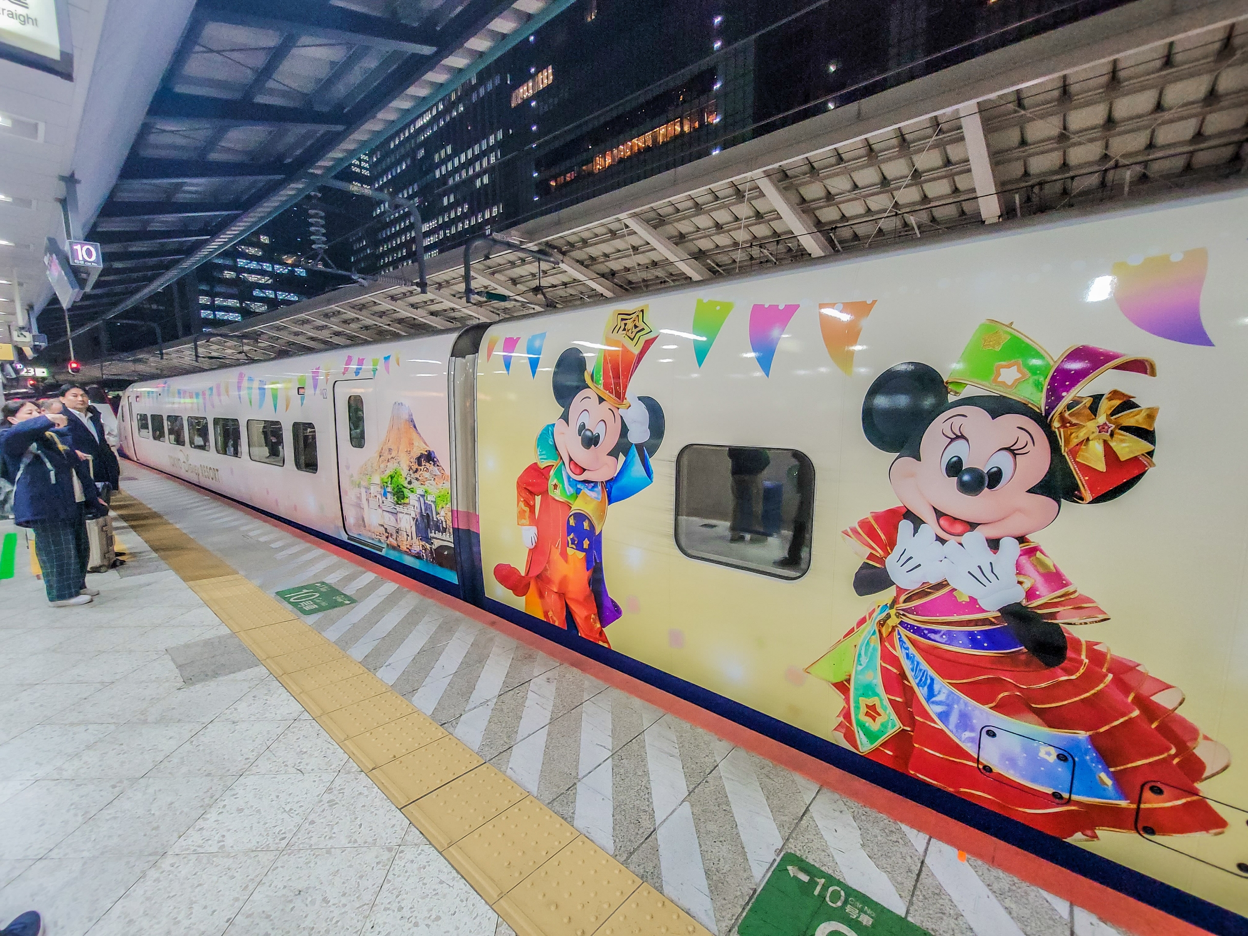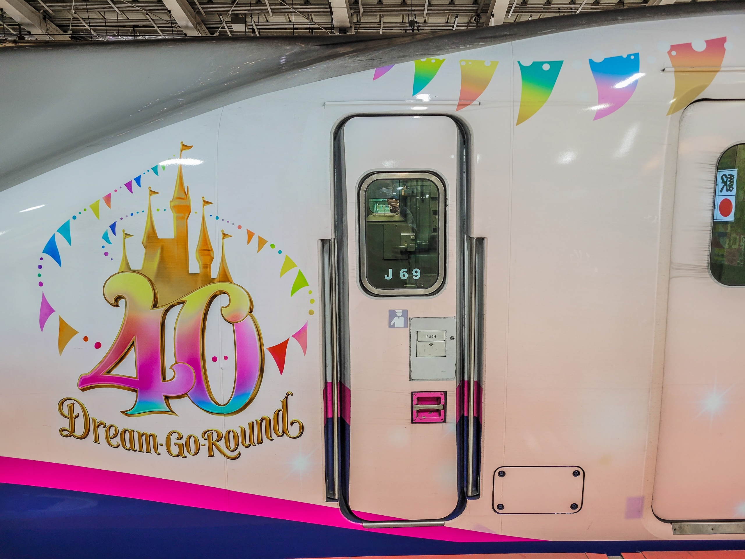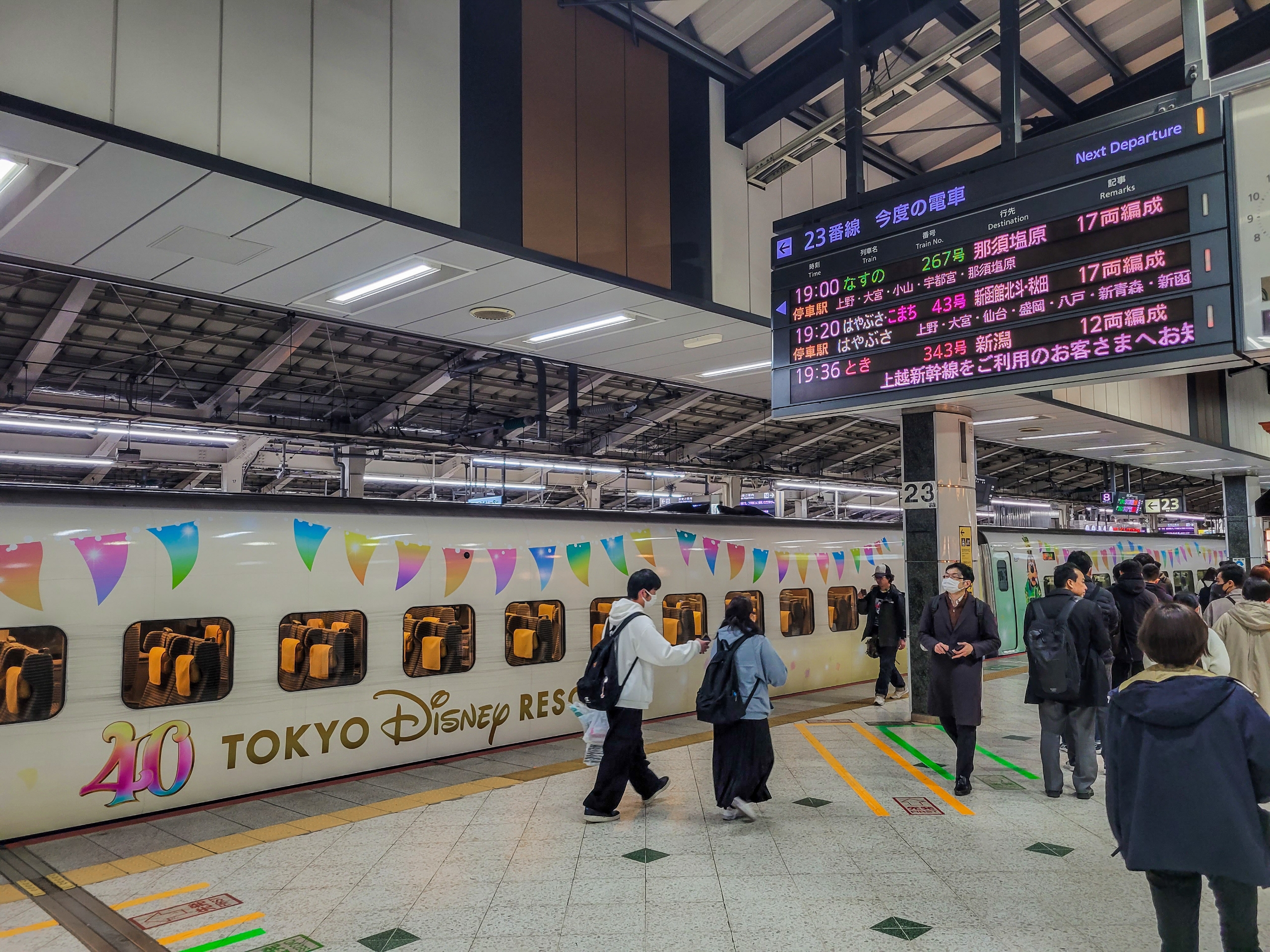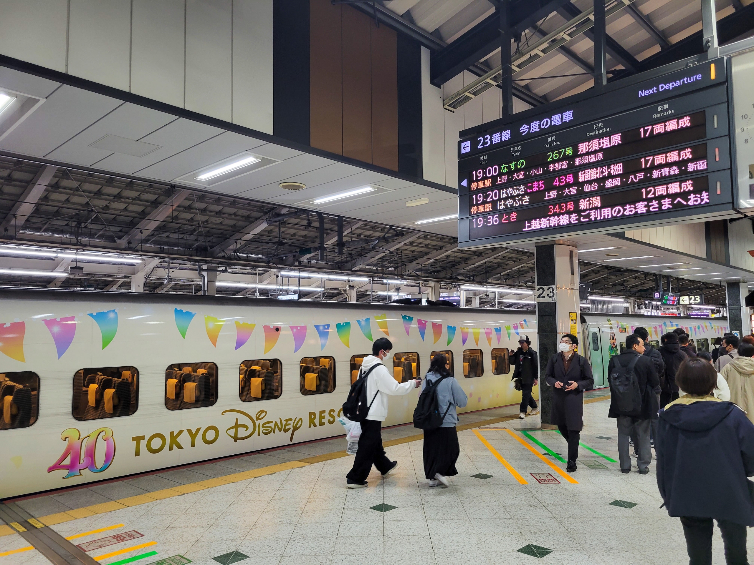 乗車予定のなすの号。ディズニーラッピングのE2系。珍しいのか、写真撮影している人が多いです。前方にはE3系のつばさ号も連結してましたが、せっかくなのでディズニー新幹線側にのります。