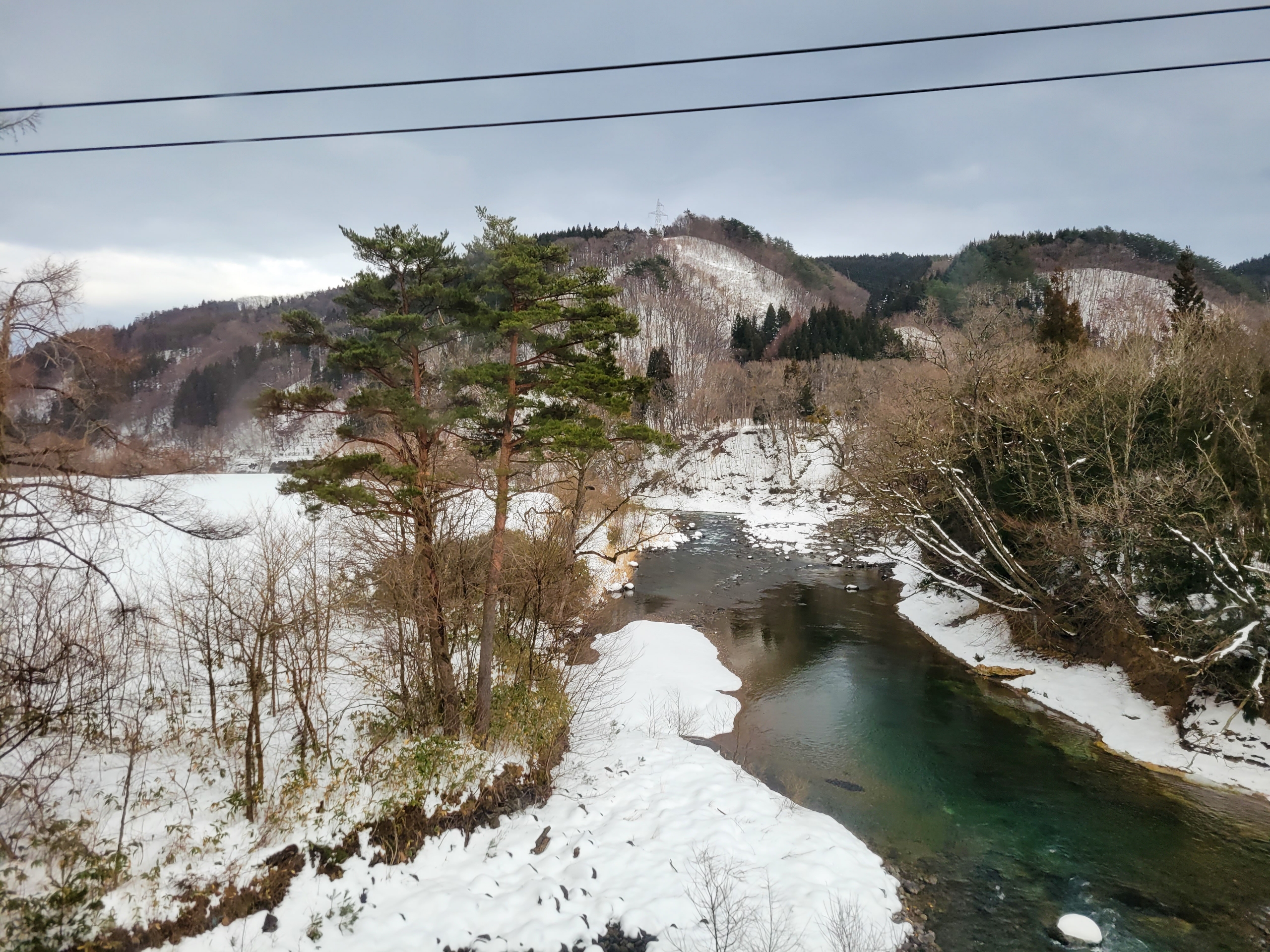 行きに降ってた雪が木に積もっていて綺麗ですね。