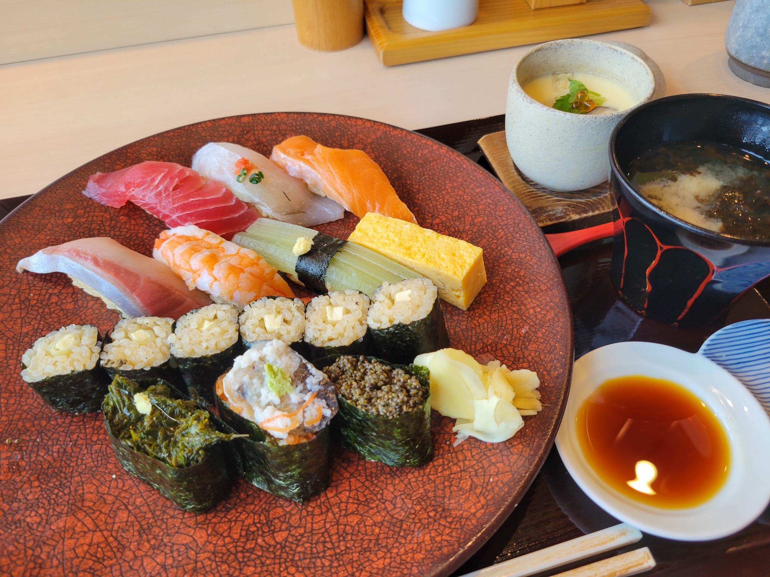 お得なランチメニュー。駅ナカなのに値段も手頃だと感じました。秋田港大漁ランチと、日本酒飲み比べにしようと注文したら、飲み放題をすすめられました。