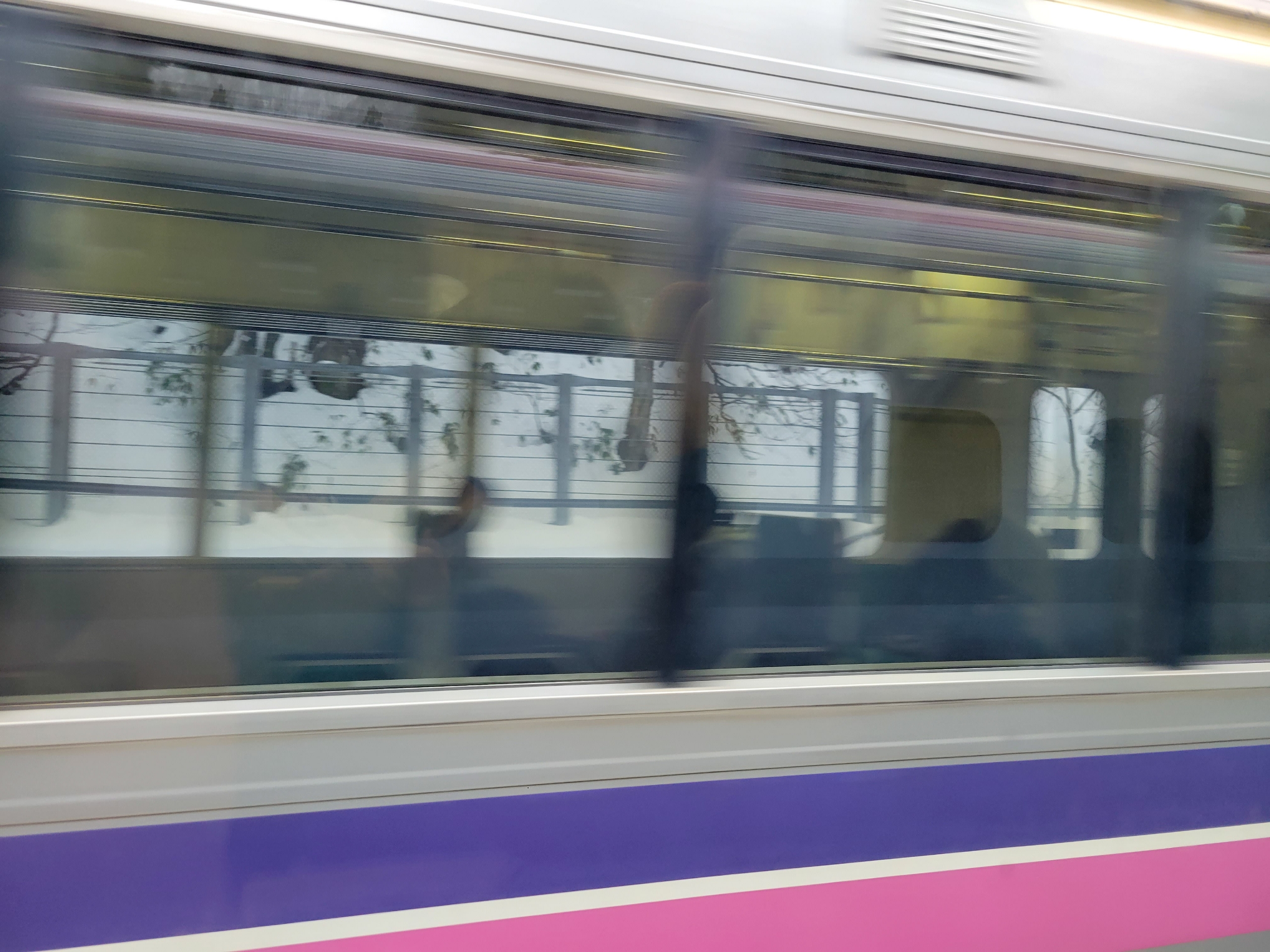 ホーム中ほどの車両は結構混雑していて、窓側の座席はほぼ埋まっています。後方の車両へ歩いていきます。