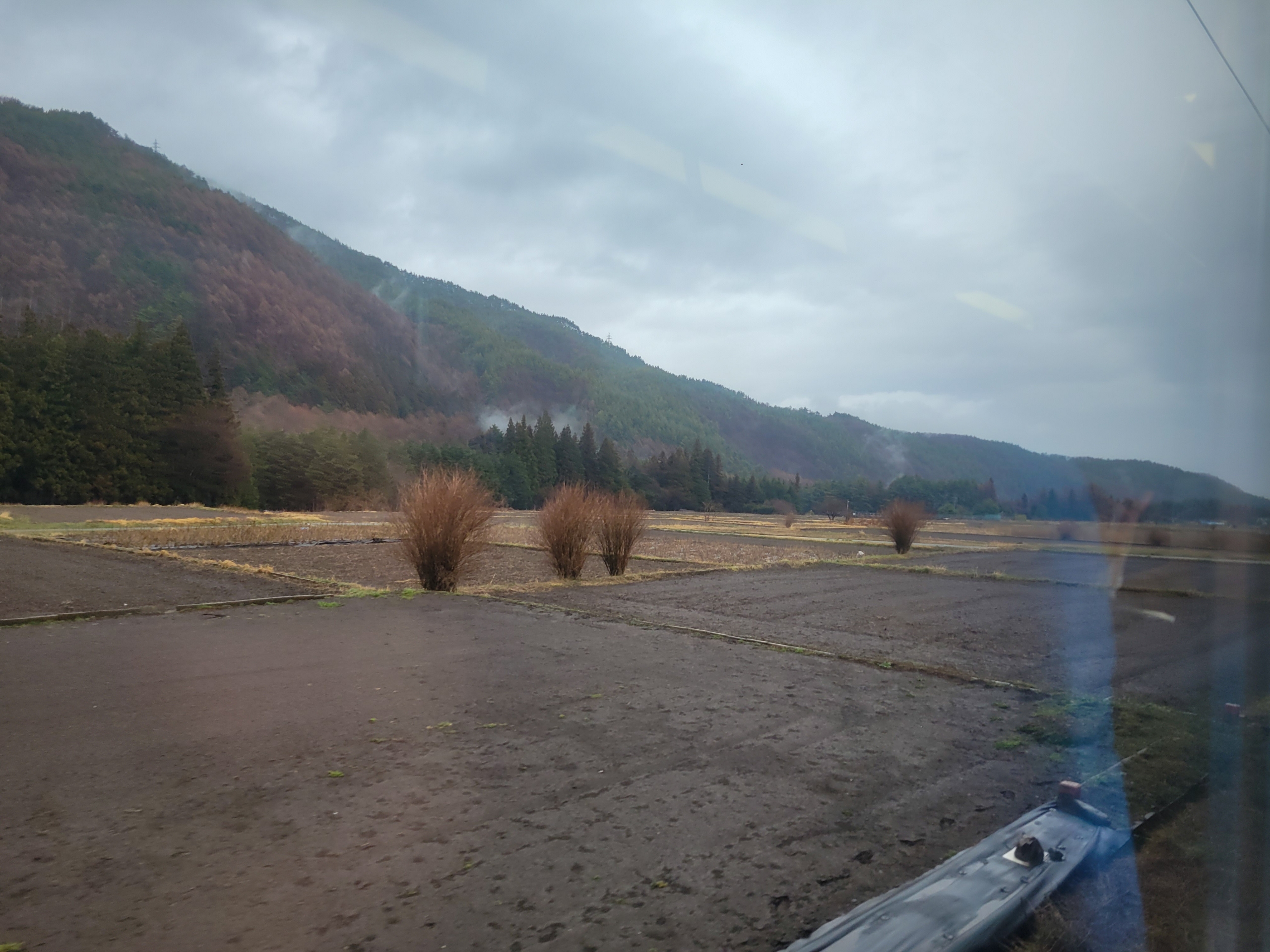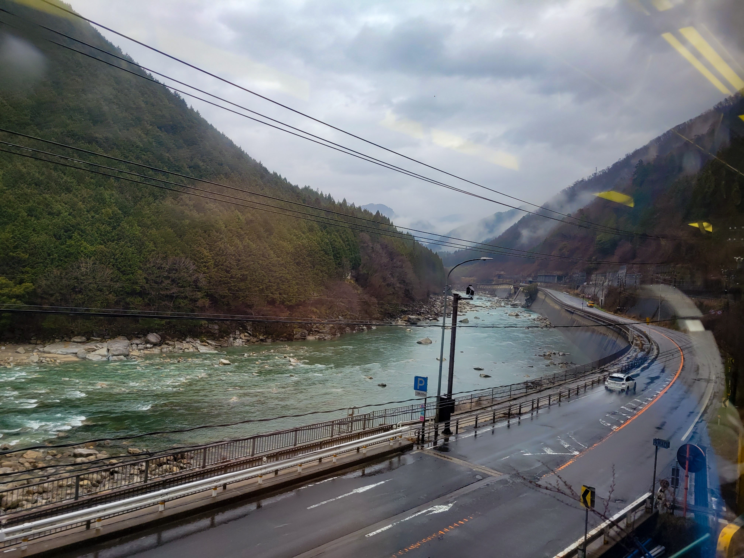 中津川が近くなると視界が開けて、右方向に恵那山が見えるポイントだが、やはりこの天気だと山は見えない。