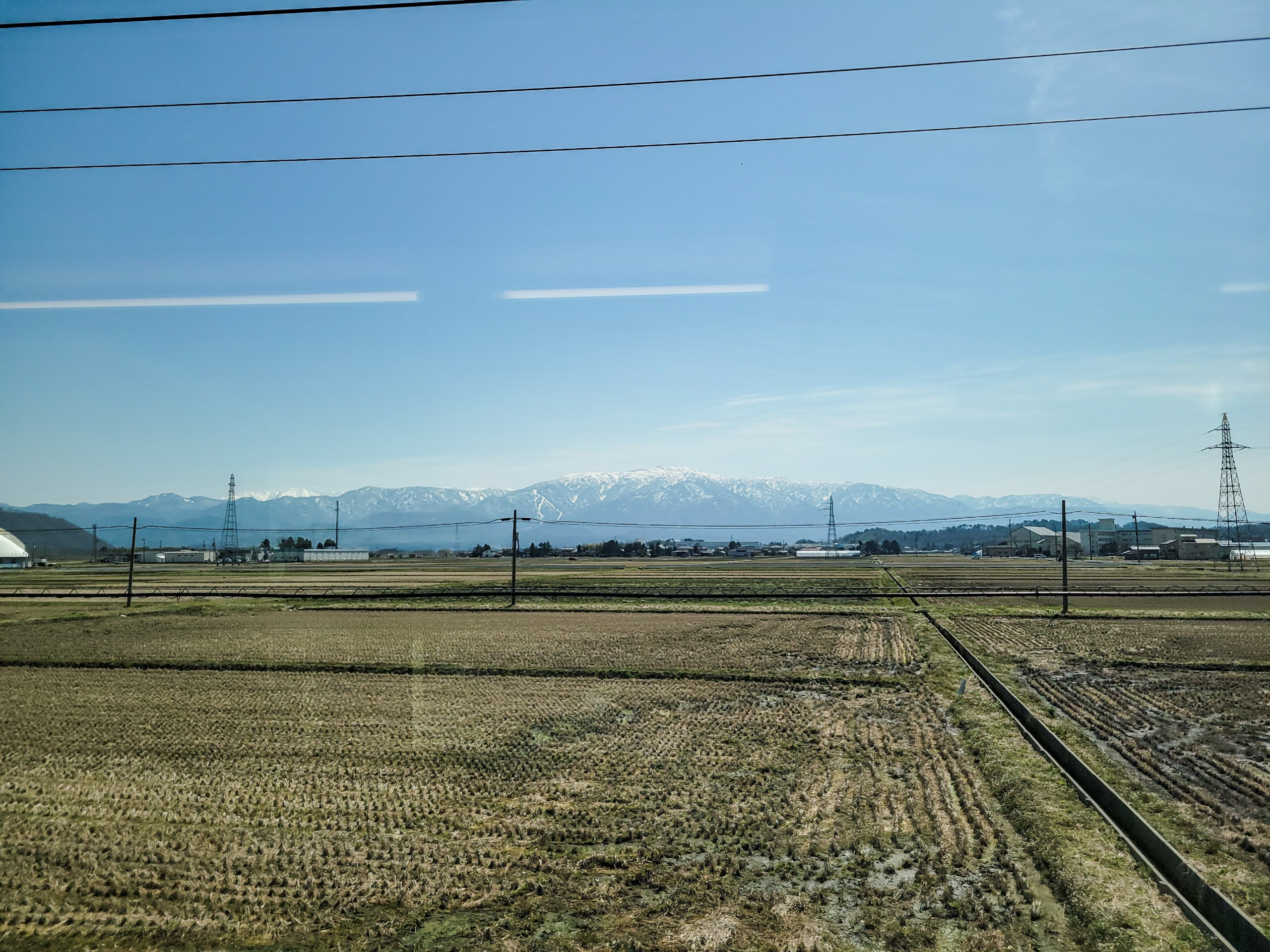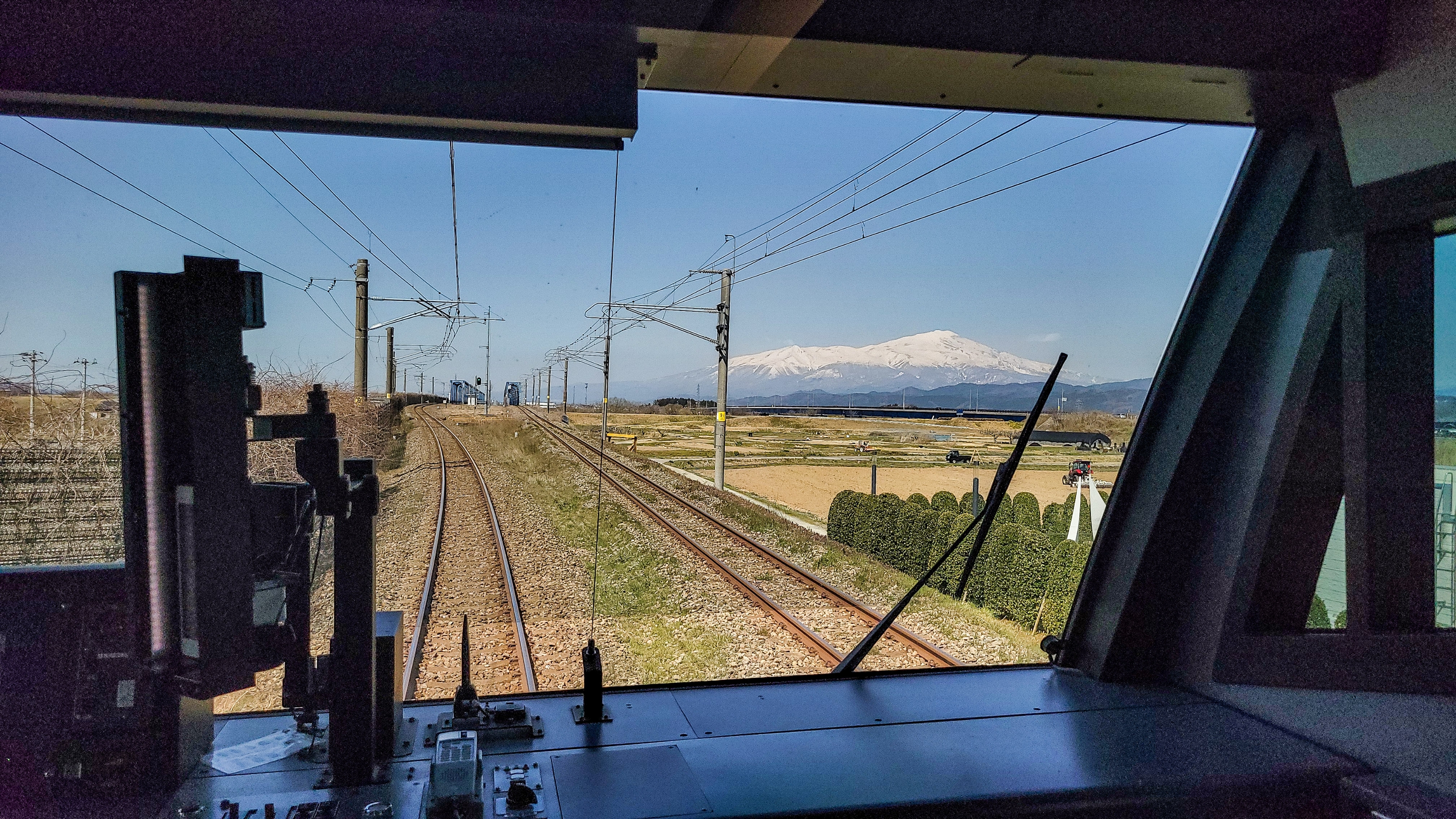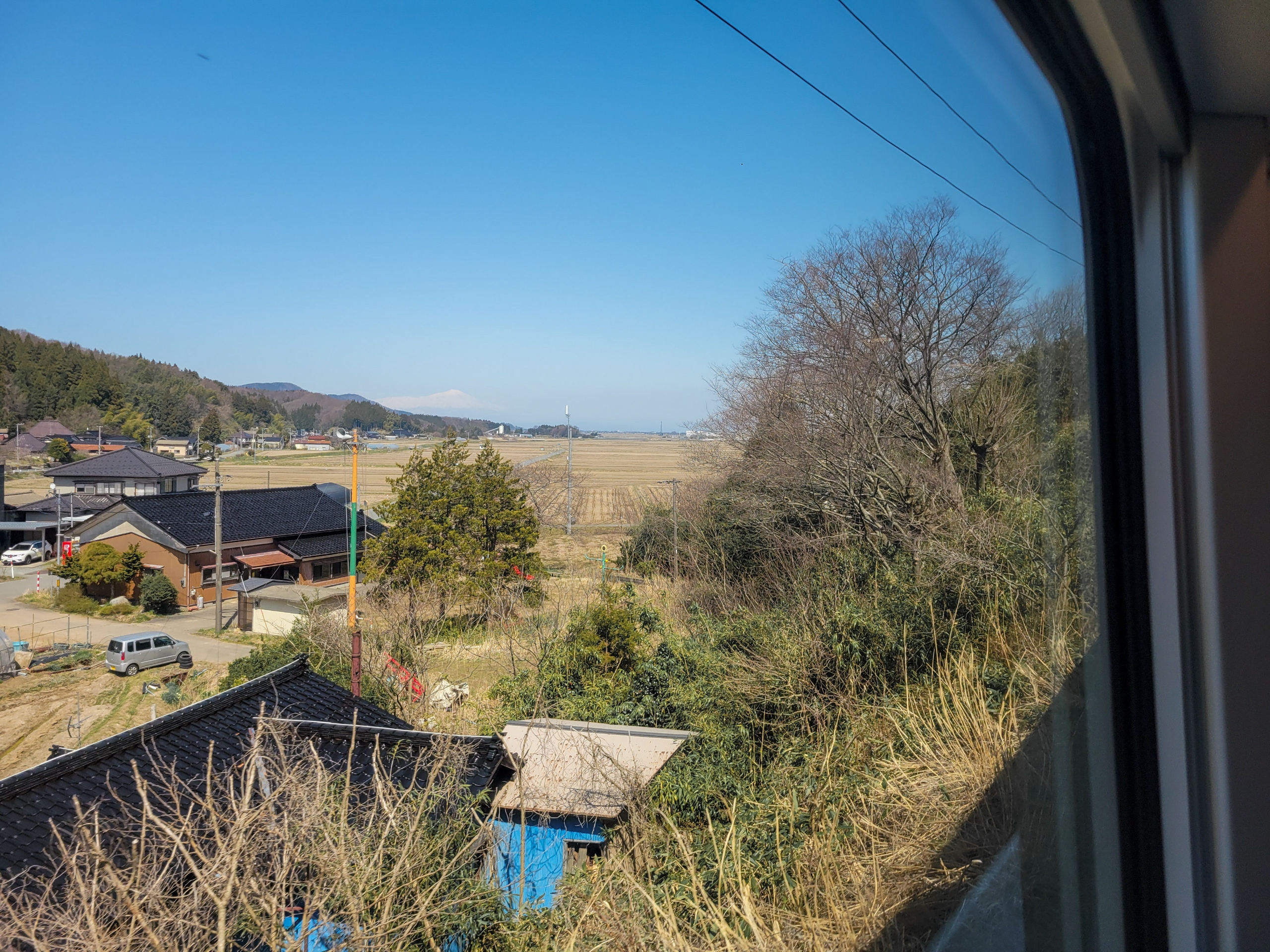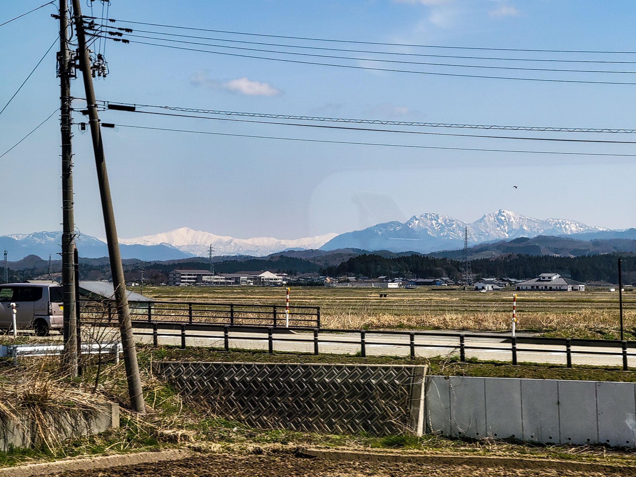 続いて前方に鳥海山(2,236m)が見えるようになりました。庄内平野には田んぼだけで遮るものがないので、周囲の山がよく見ることができます。この日は春霞も少なく綺麗に見えてほんと恵まれていました。