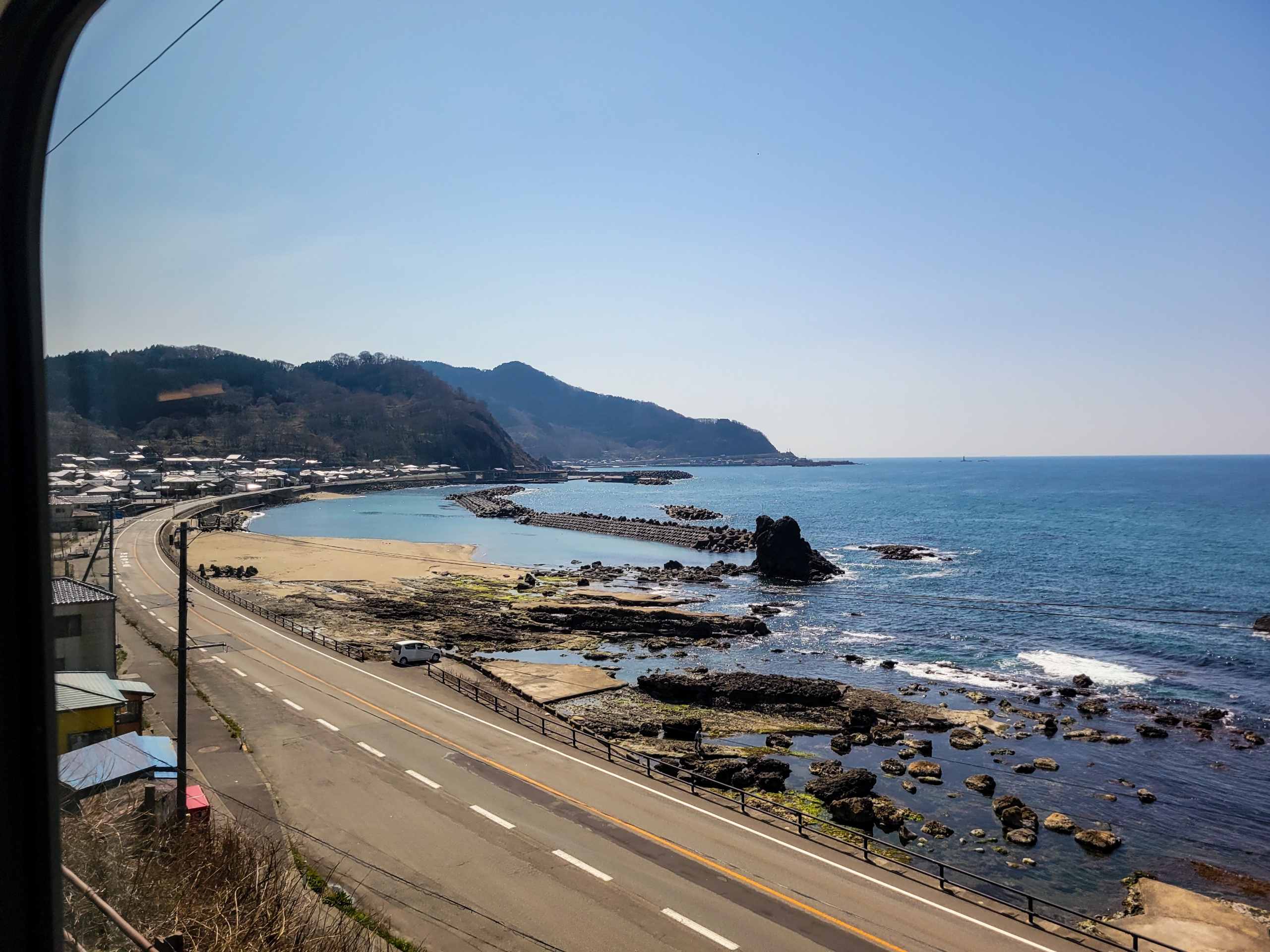 ほんと道路があるので、それほど海の近くを走っている感じがないのは残念です。リゾートしらかみの運行する五能線のほうが海が近く絶景でしたね。