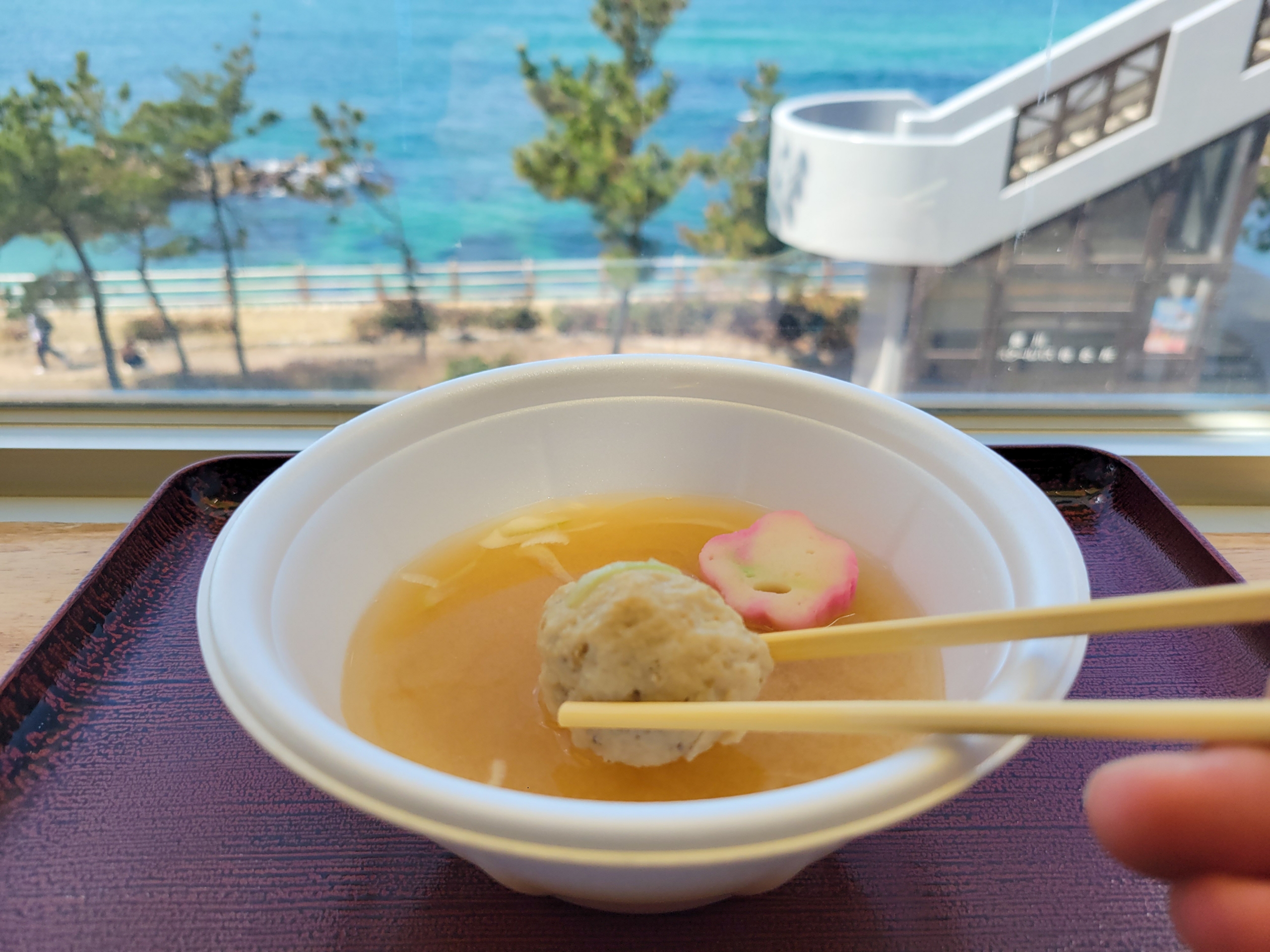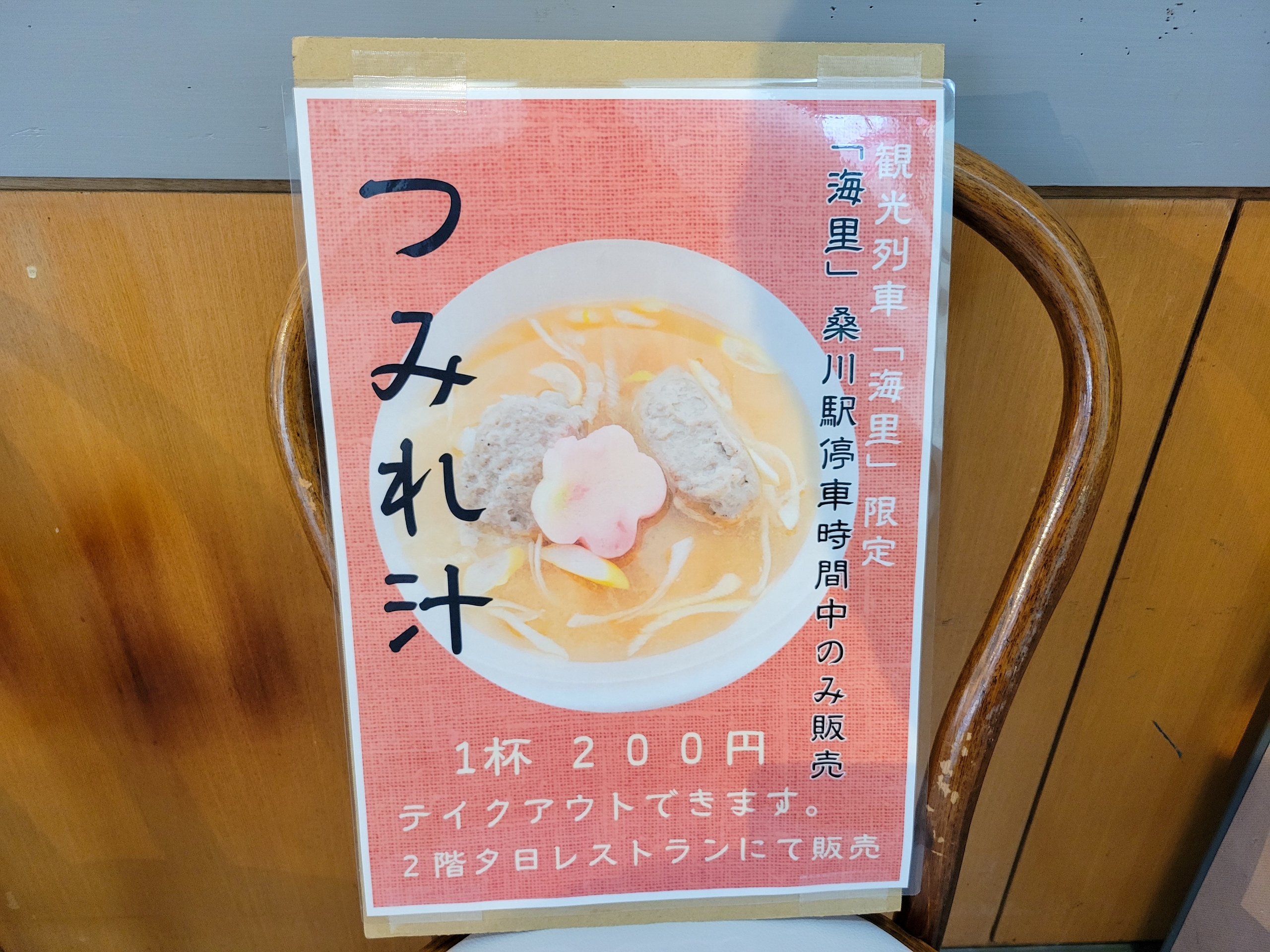 車内でも案内がありましたが、海里の時間帯のみつみれ汁を販売しているとこのとで、購入します。時間があるのでレストラン内で頂くことにしました。