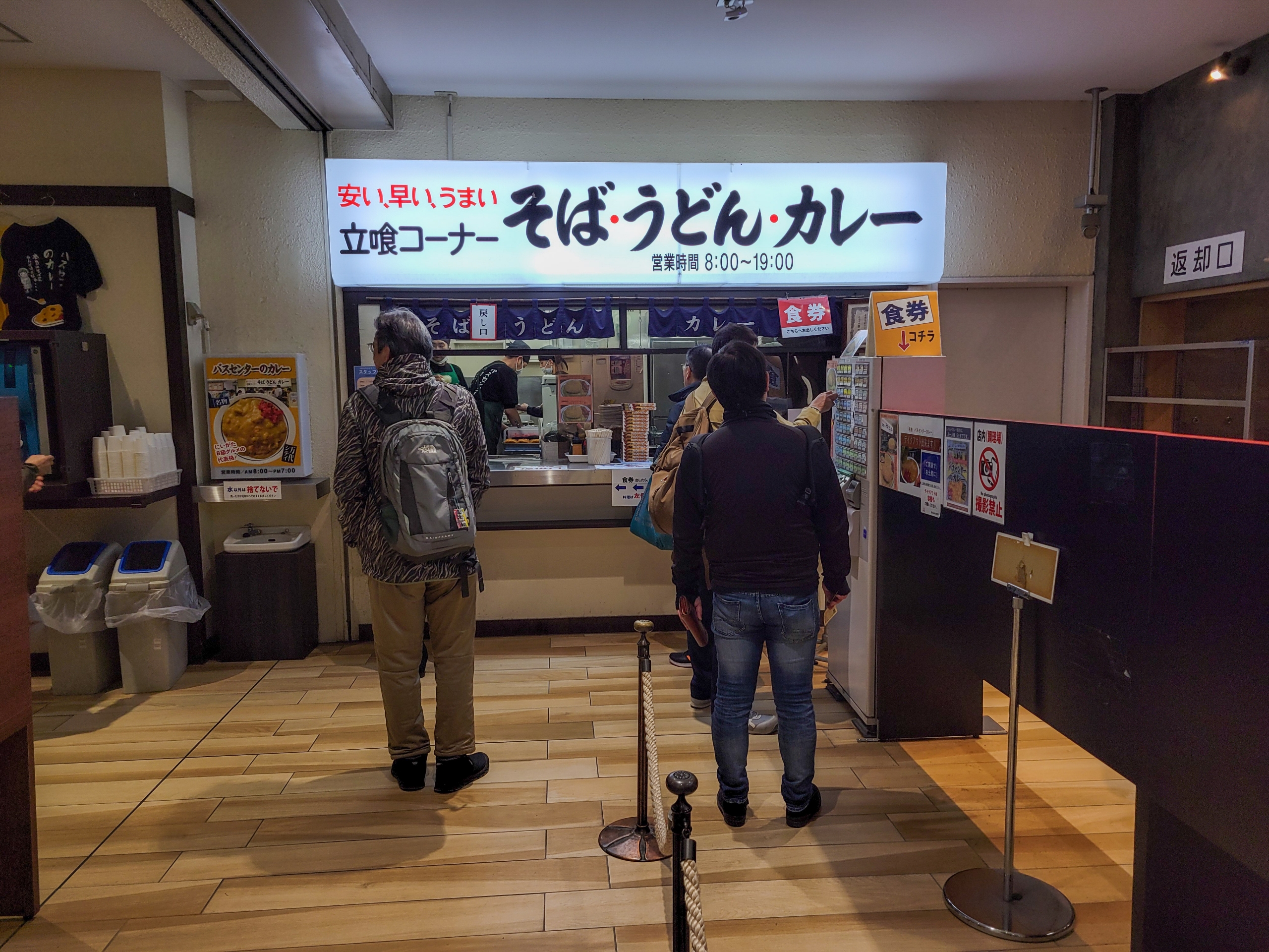 お店の名前は「万代そば」ですが、今やカレーの方が有名になり、食券機でもそばよりカレーが上に配置されています。しかし、全員がカレーを注文するわけではなく、朝という時間帯もあってか、2~3割ほどの人はそばを注文しているようでした。