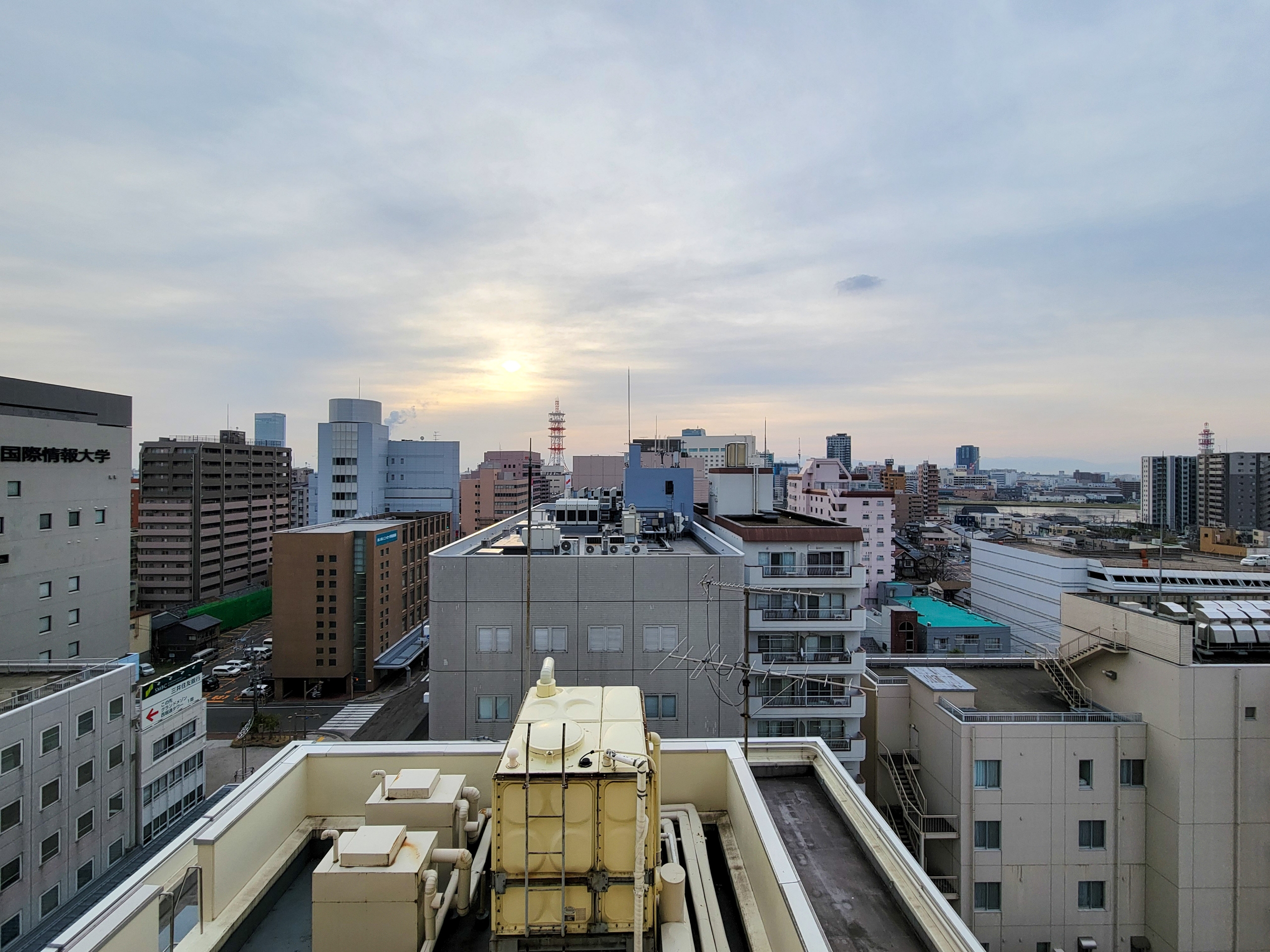宿泊しているカントリーホテル新潟は14階建ての立派な建物で、写真の通りぷらっと本町という商店街に面しています。目の前の大通りには新潟駅方面へのバスが頻繁に運行しているため、駅から距離はあるものの、公共交通機関でのアクセスは良好です。