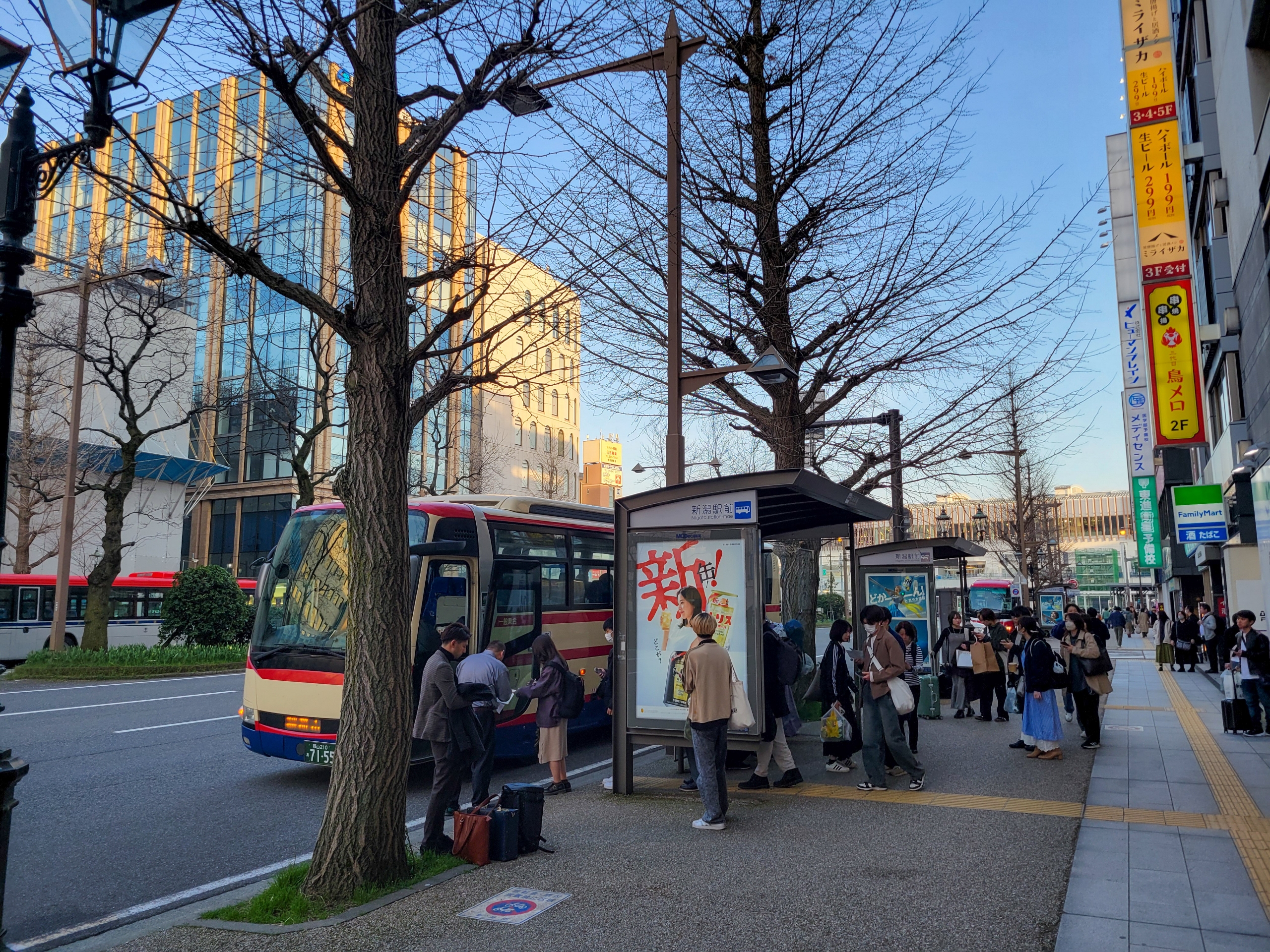 大通りのカーブする左にある大きな建物が、アパホテル&リゾート新潟。2022年にオープンしたばかりで客室数1000を超えるメガホテルで大浴場やプールも完備。興味が湧いたので予約してあって、明日泊まることになっています。