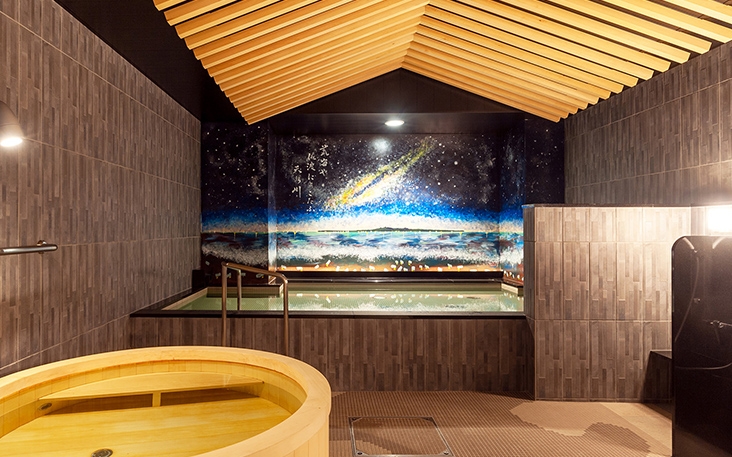 壁に描かれた日本海と佐渡島、そして天の川銀河。
