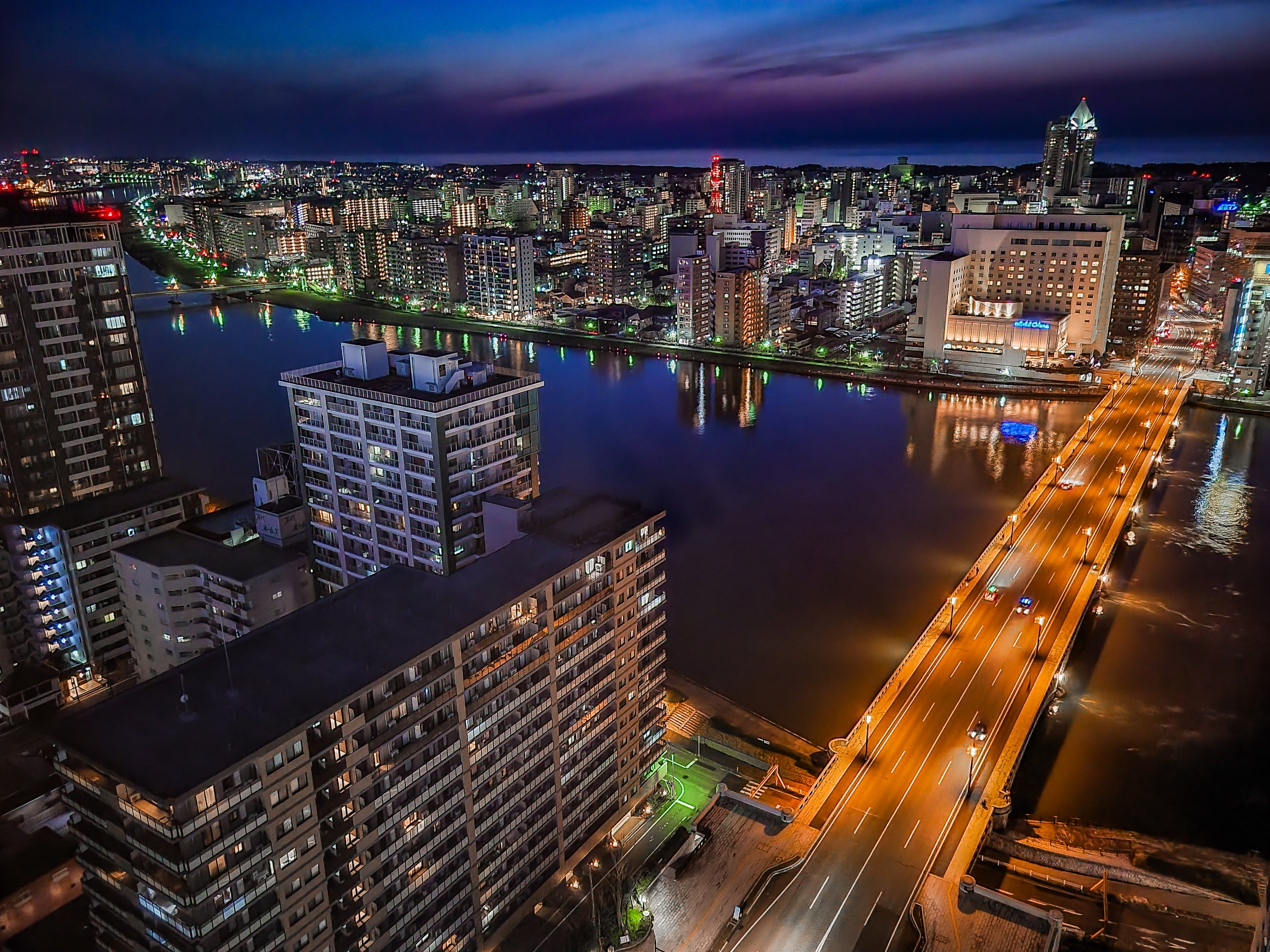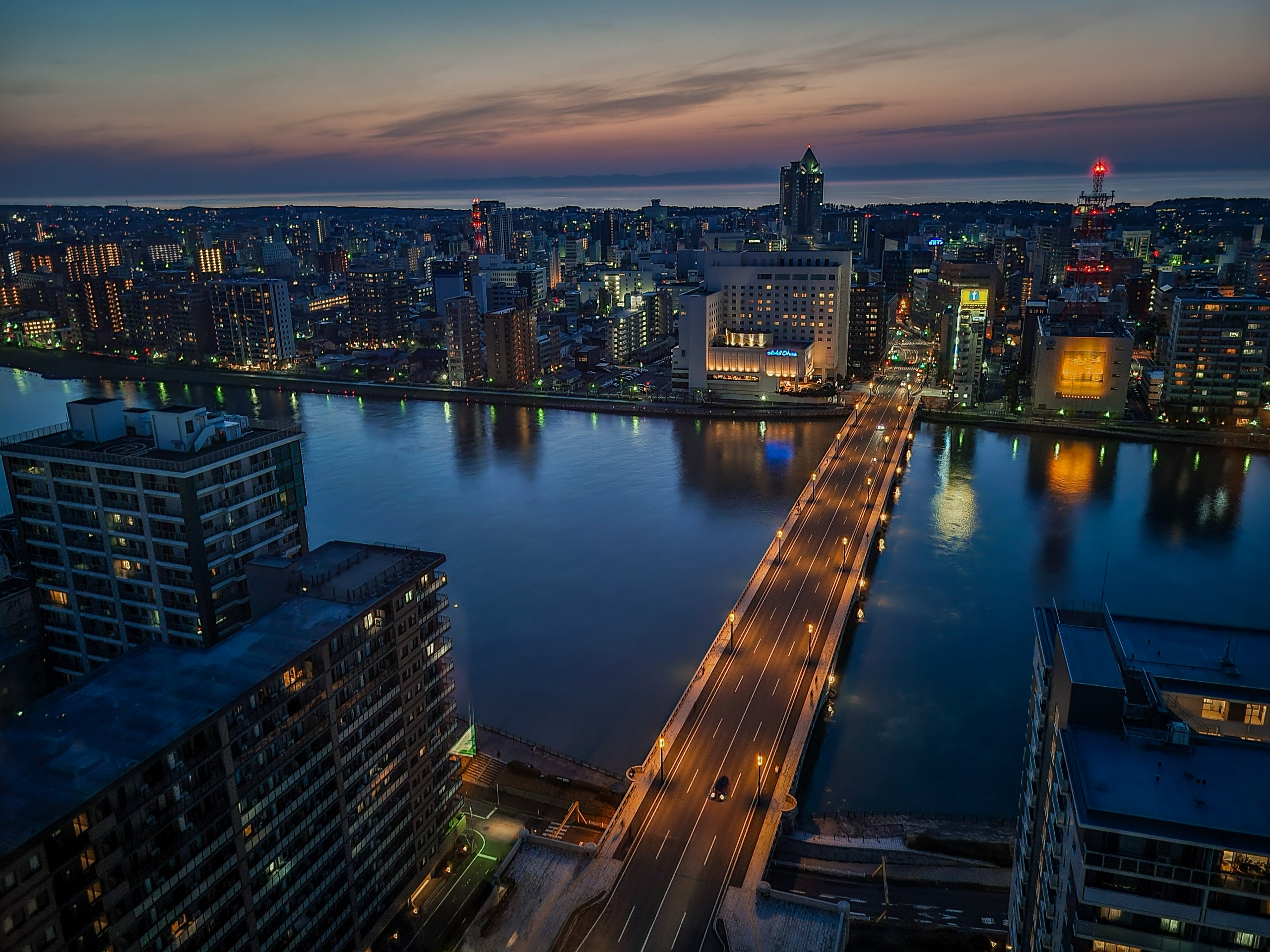 マジックアワースタート。信濃川の水面に写る灯りが綺麗。
