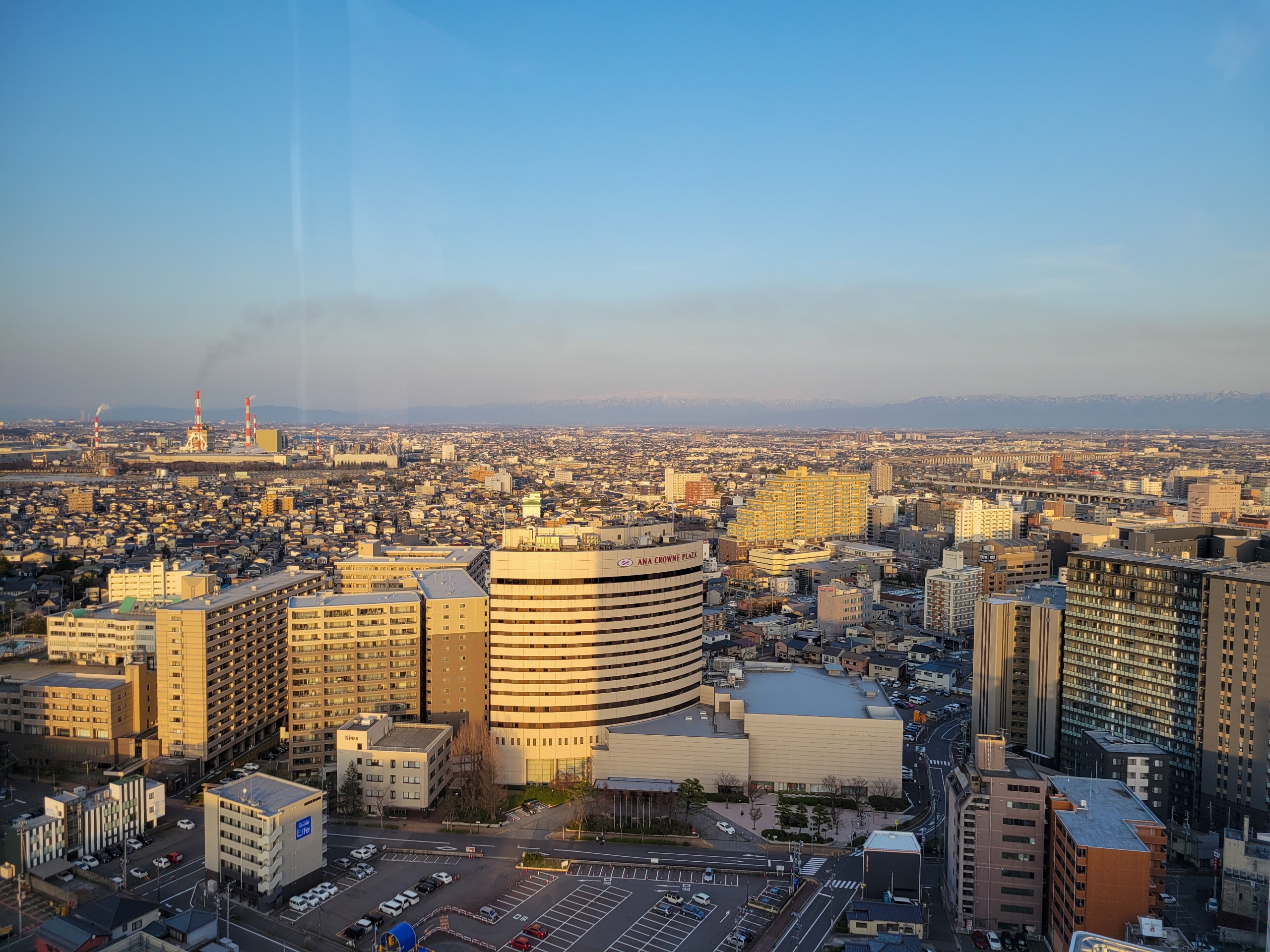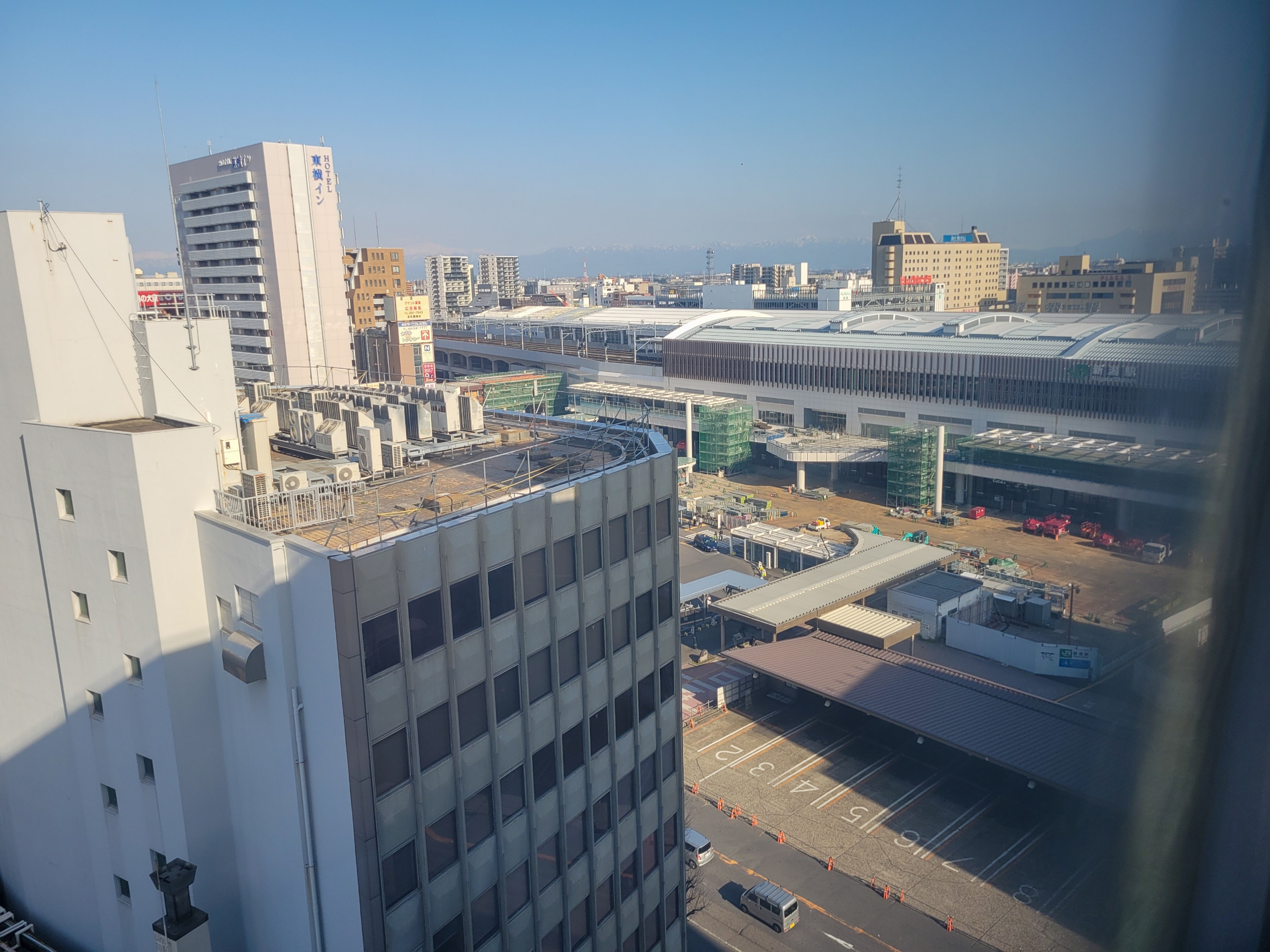 新潟駅と万代口バスターミナル跡が見下ろせます。ただ正面側ではなかったのと、二重窓ガラスで曇りぎみだったのが残念。窓がまったく空かないので、換気には難がありました。