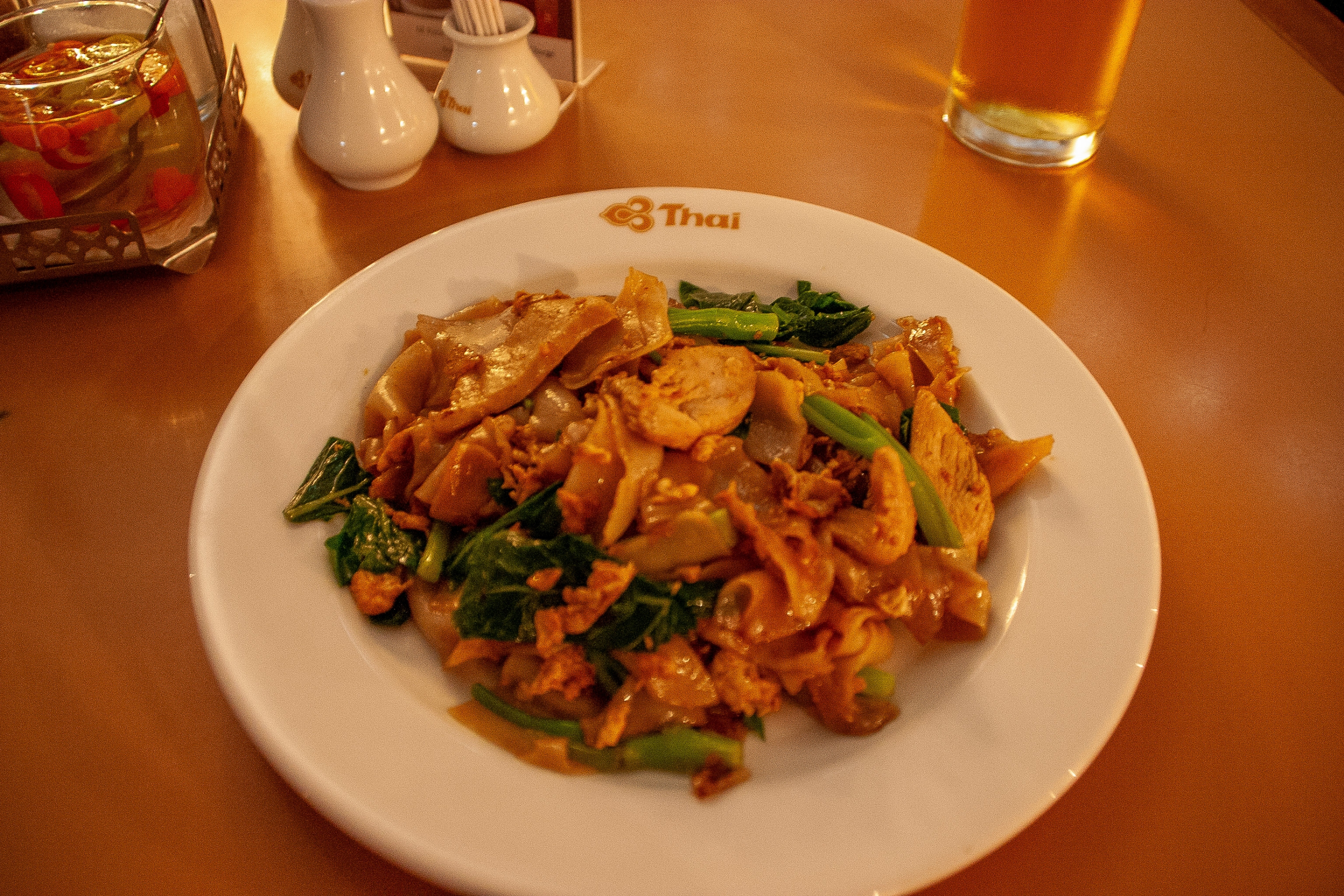 レストランでビールと太麺のパットシィーユーをたいらげて、