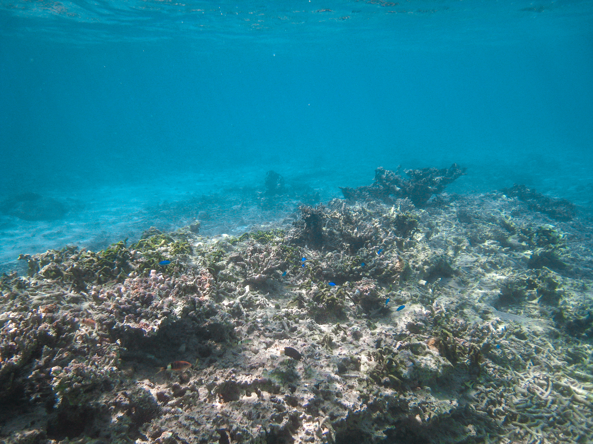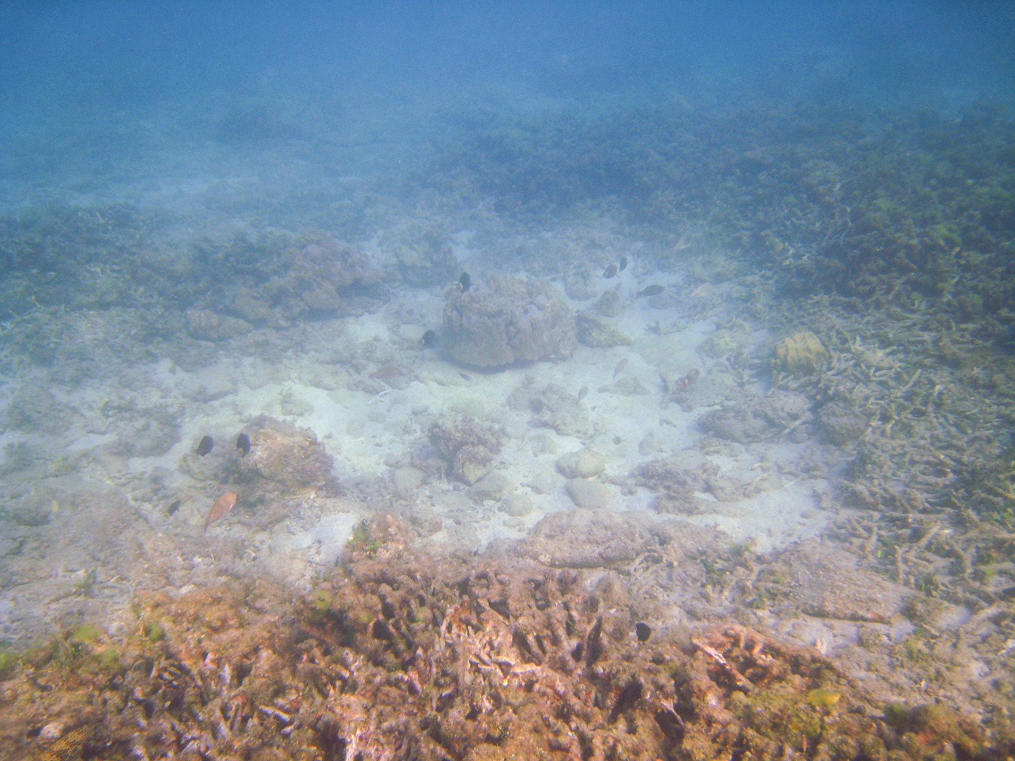 すでに海の中に入る日差しが弱くなっていた。それにしても、ここも珊瑚が死滅している。事前に調べていたヤドリ浜の写真では、珊瑚が綺麗だったんだが…