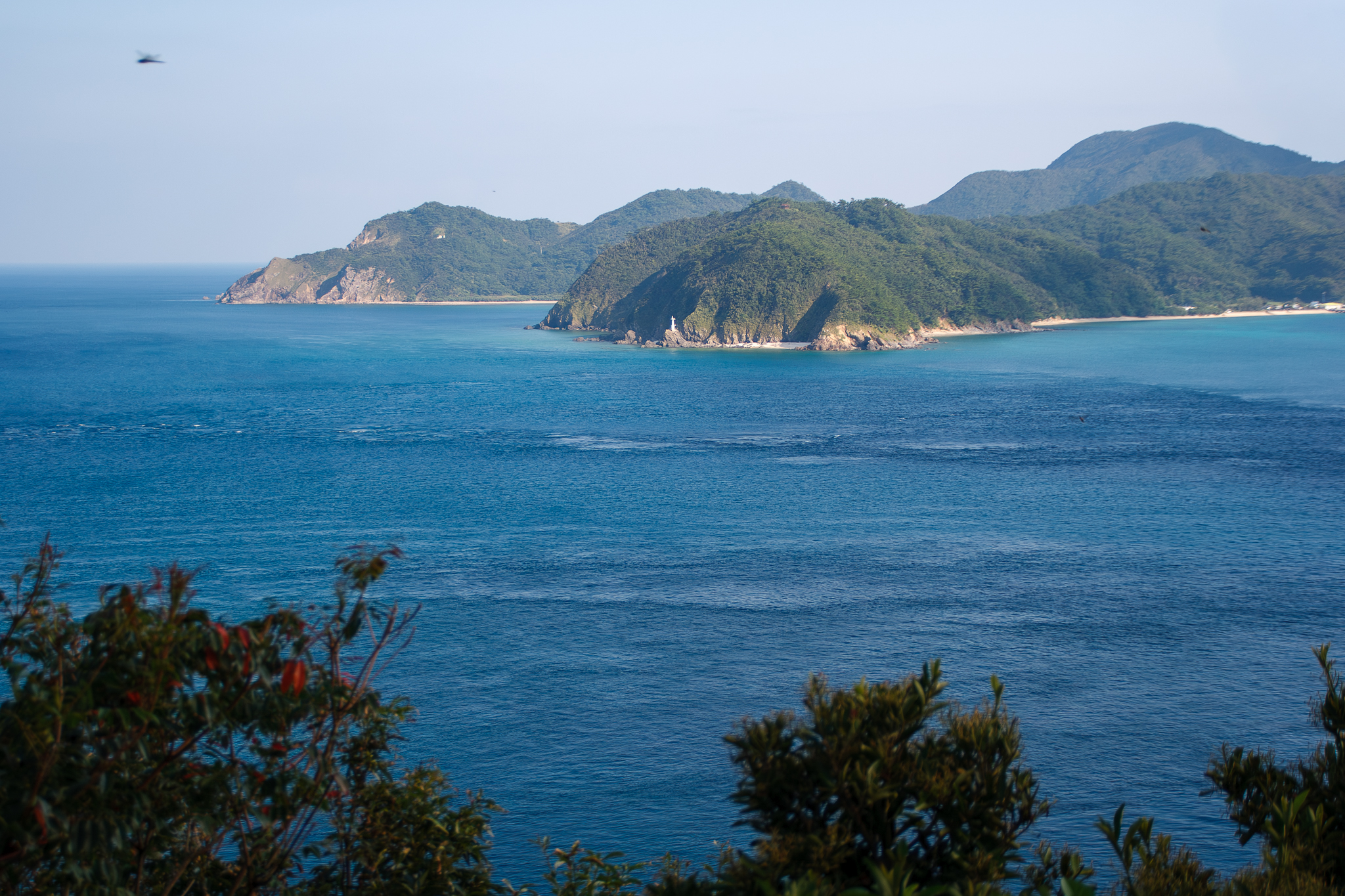 山道をしばらく上がり続けたところで、眼下に海岸が広がり、