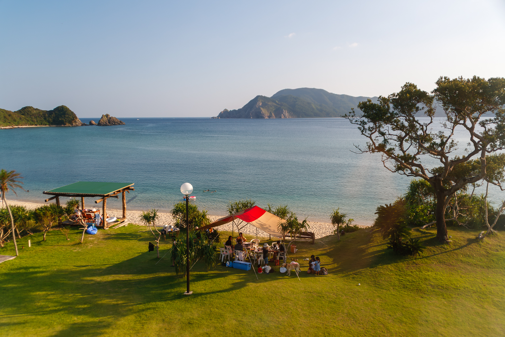 広い青々とした芝生と目の前にあるヤドリ浜がきれい。