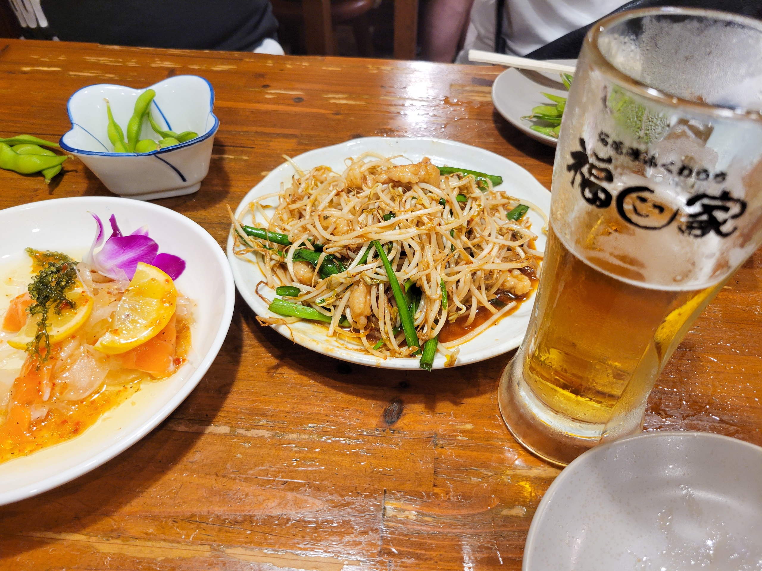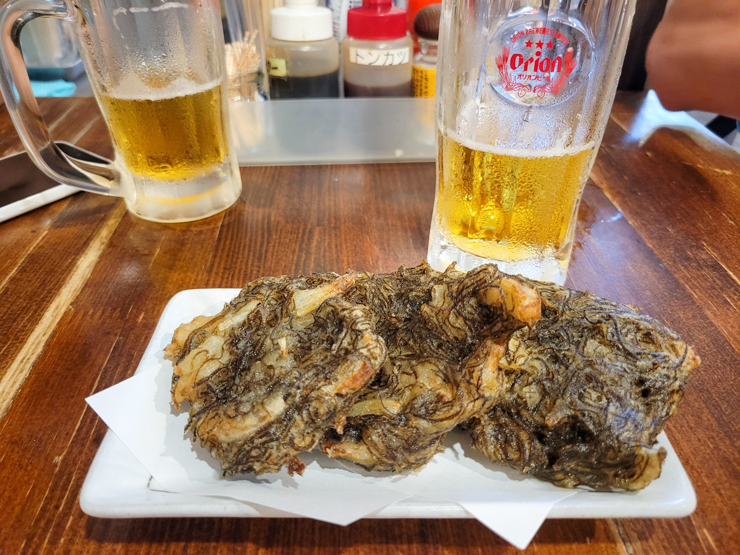 いや、ここはオリオンビールですね。旅行数日前に激辛麻婆豆腐を食べて、胃がやられてしまって、若干体調不良気味だったんですが、さすがにここでアルコールは解禁します。いやぁ、うまかった。