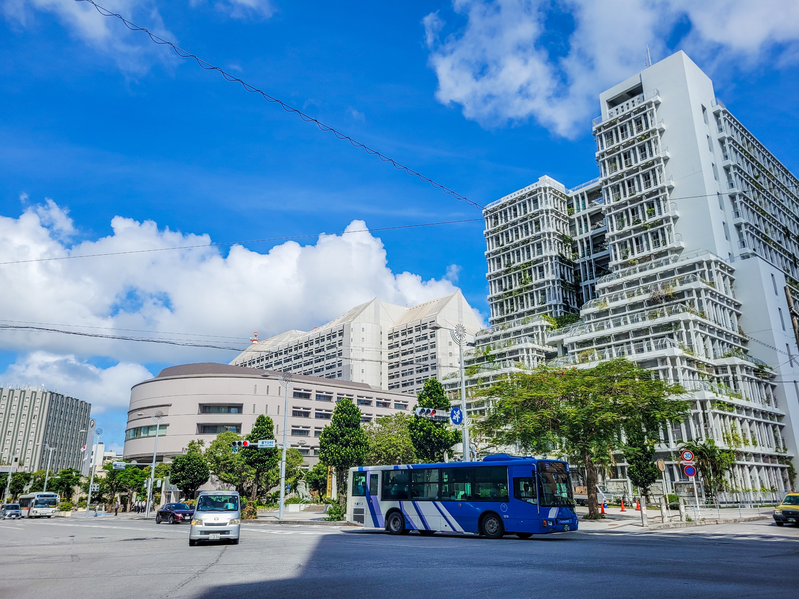 白と青のコントラストが素晴らしいです。そこに偶然通りかかる白と青の路線バス、グッジョブ!右が那覇市役所、左が沖縄県庁です。