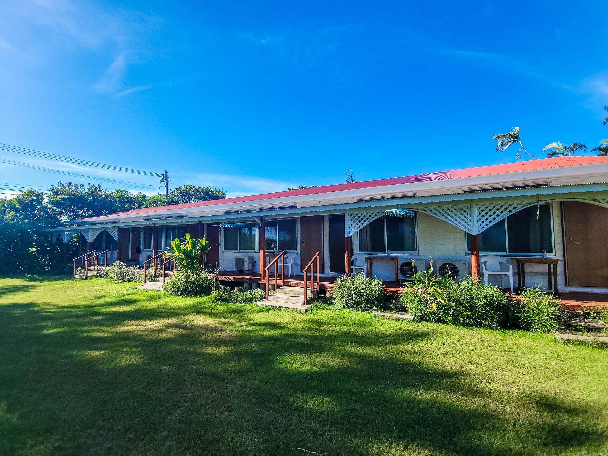 宿泊棟。庭の反対側にも部屋はありますが、嬉しいことに全員庭側の部屋でした。直接車も庭に入れるので、アメリカのモーテルのようで便利でした。