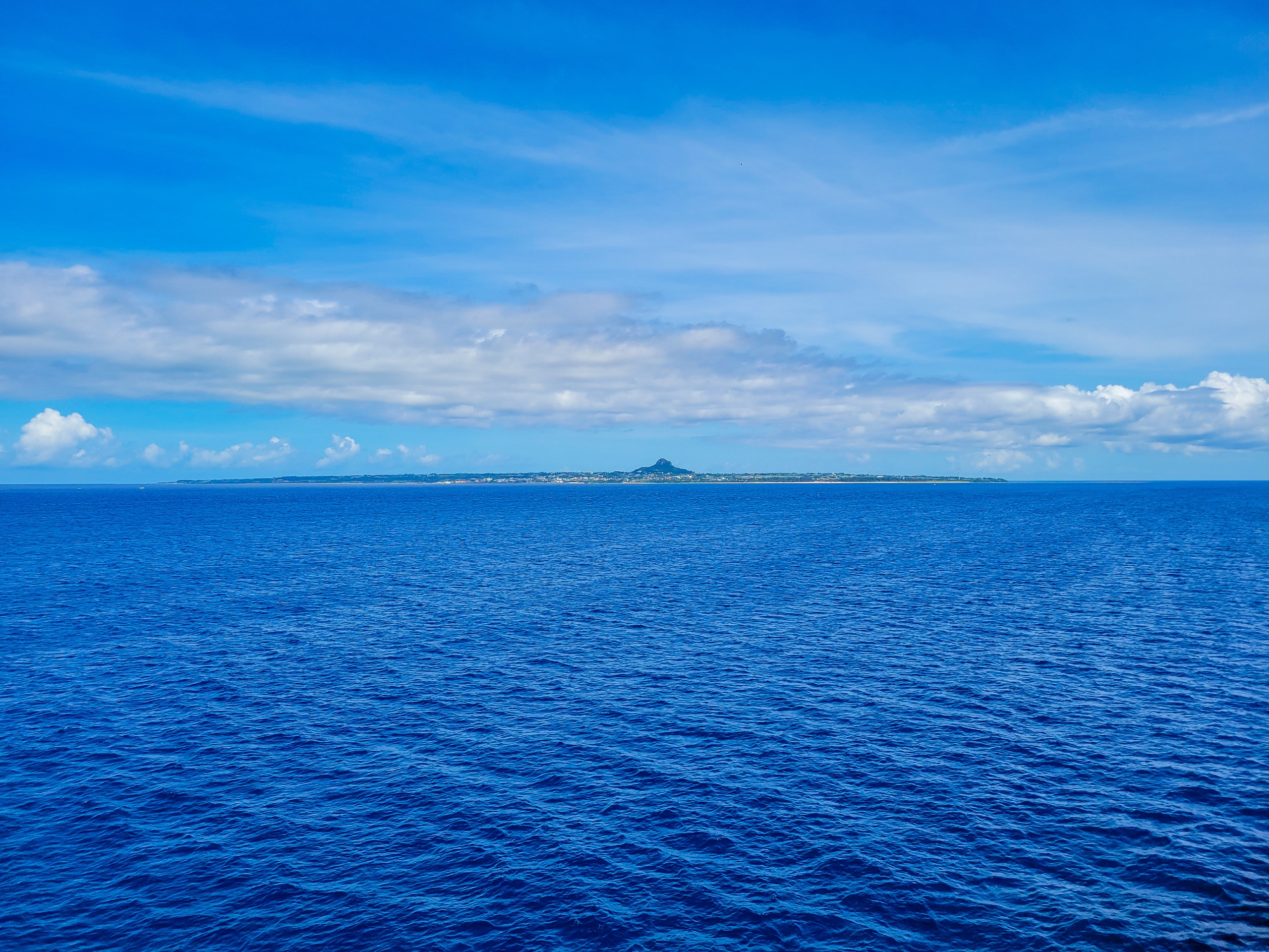 まっ平らな島の中央に、タッチューの相性で親しまれている172mの城山があるので、伊江島と判別しやすい。
