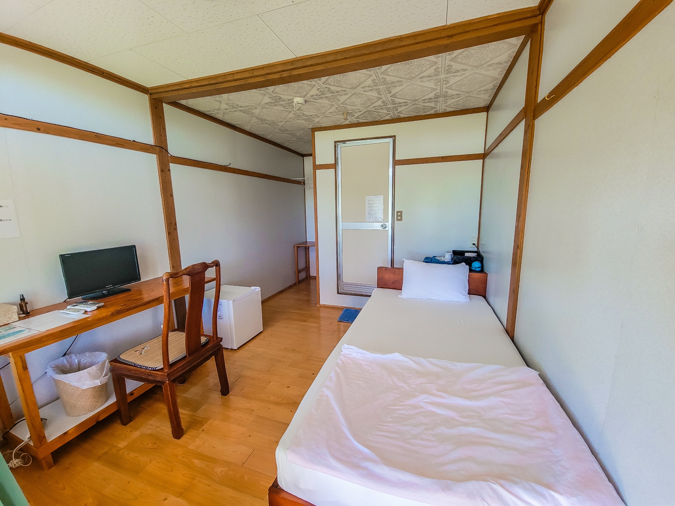 一泊だけお世話になる宿は、島の南東にあるマリナデルレイさん。昨年お世話になった宿から近く、島の中心エリアの茶花からは車で10分ほど離れています。平日で余裕かと思ったんですが、与論島の宿が混んでたんですよね。中心から離れているけど、ひとりで部屋が使えて、バストイレ付きだったのでこの宿にしました。