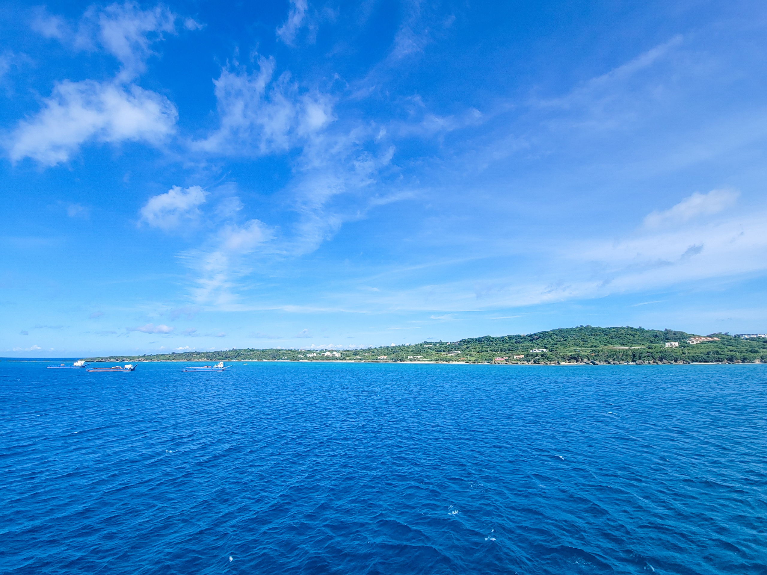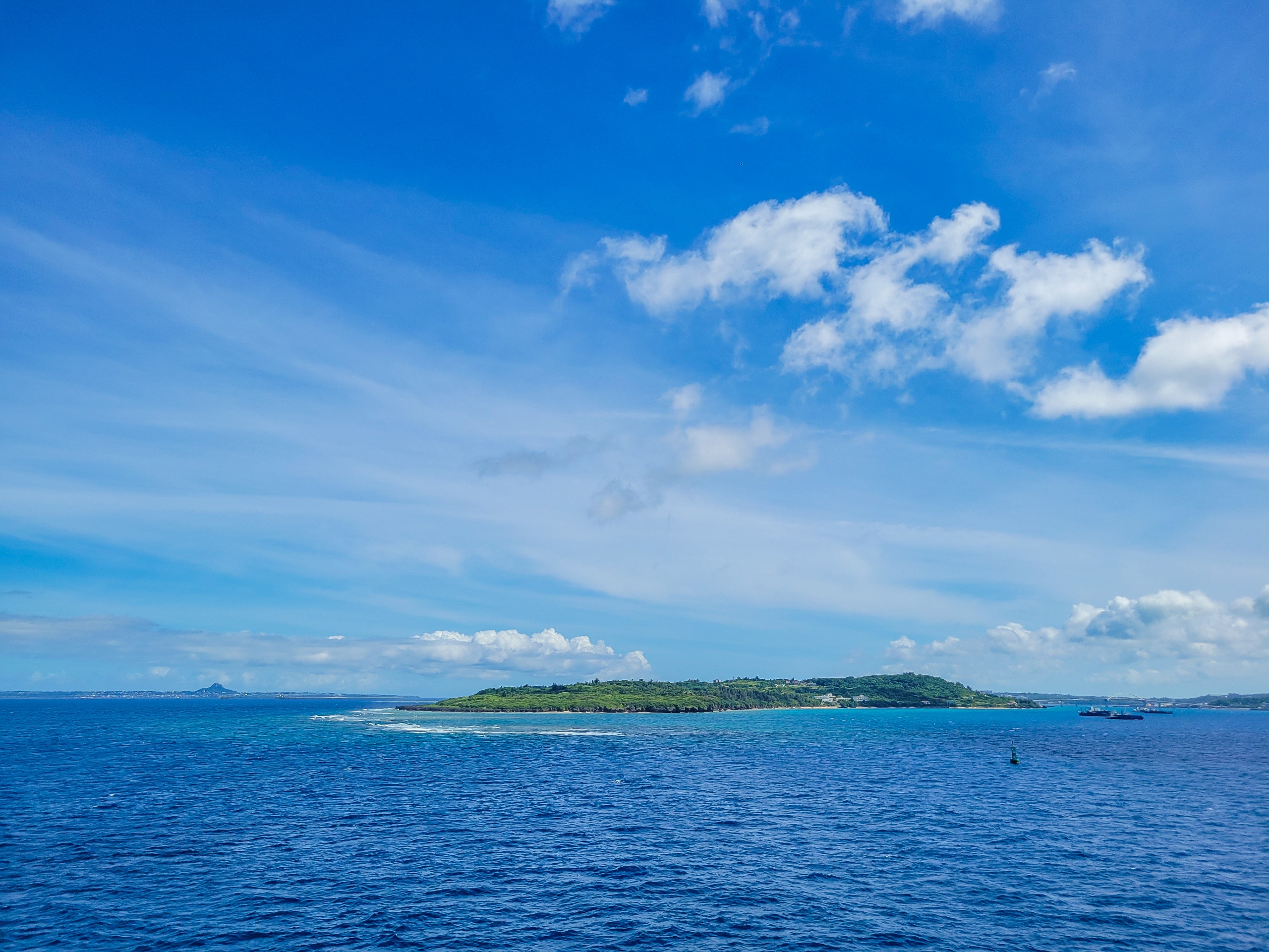 沖縄本島と橋でつながる瀬底島。周囲を珊瑚に囲まれて、スノーケルスポットが点在しているらしい。そのぶん船も島から距離を大きく取りながら進んでいく。
