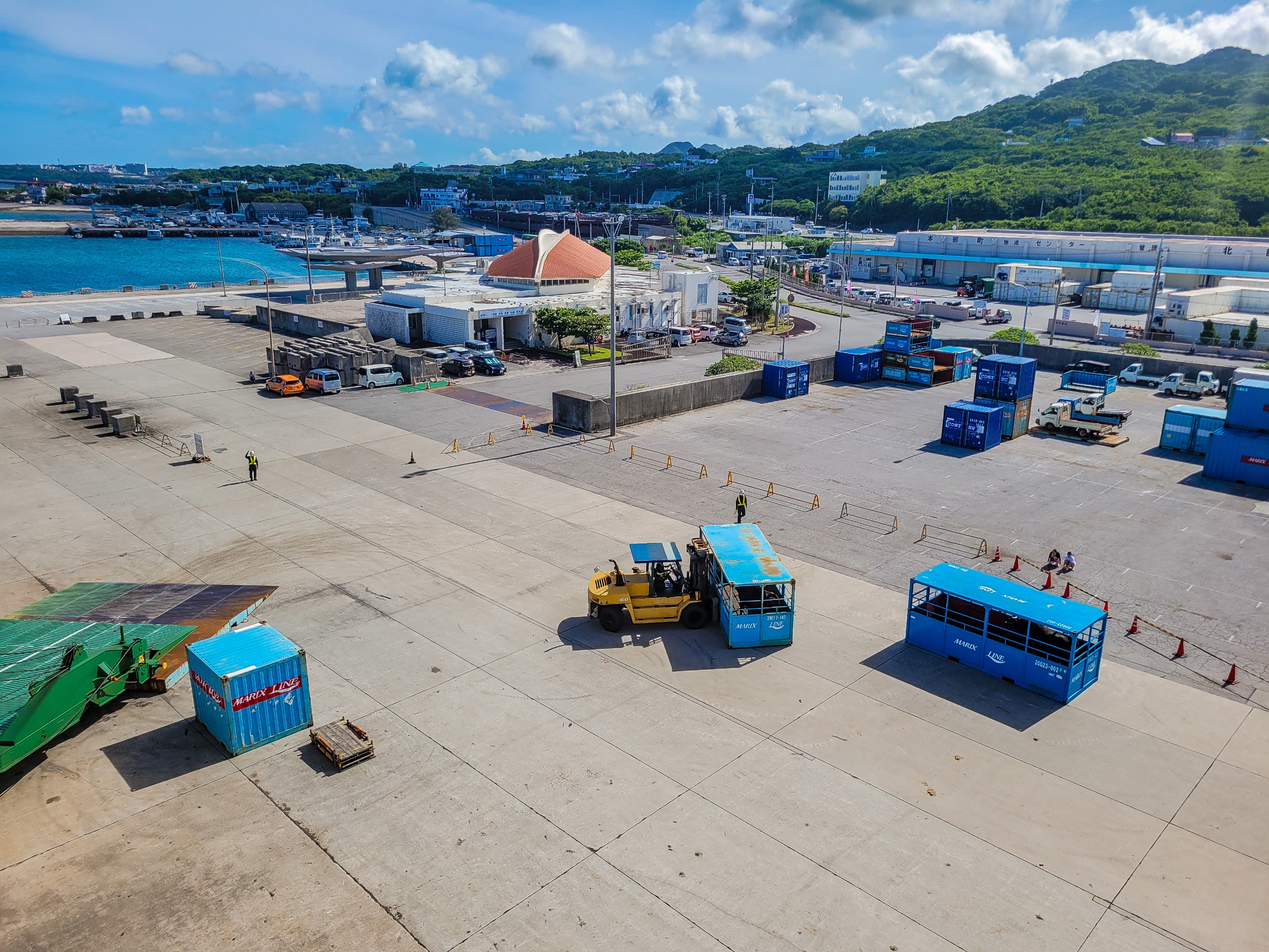 本部港で貨物を積み込む。3台のフォークリフトの仕事っぷりを見ていると、ほんと飽きない。最後に牛が積まれていくのも昨年同様だった。