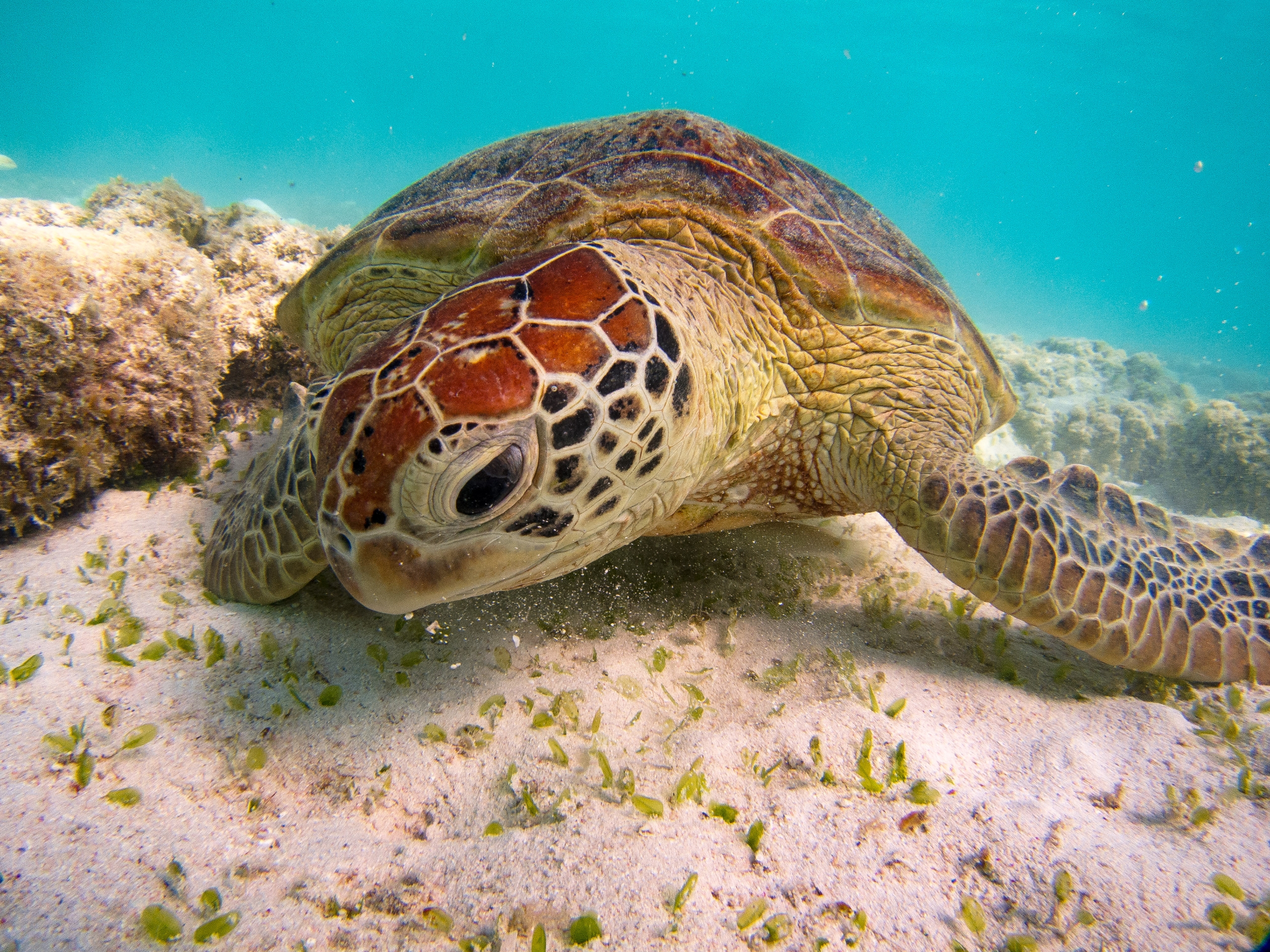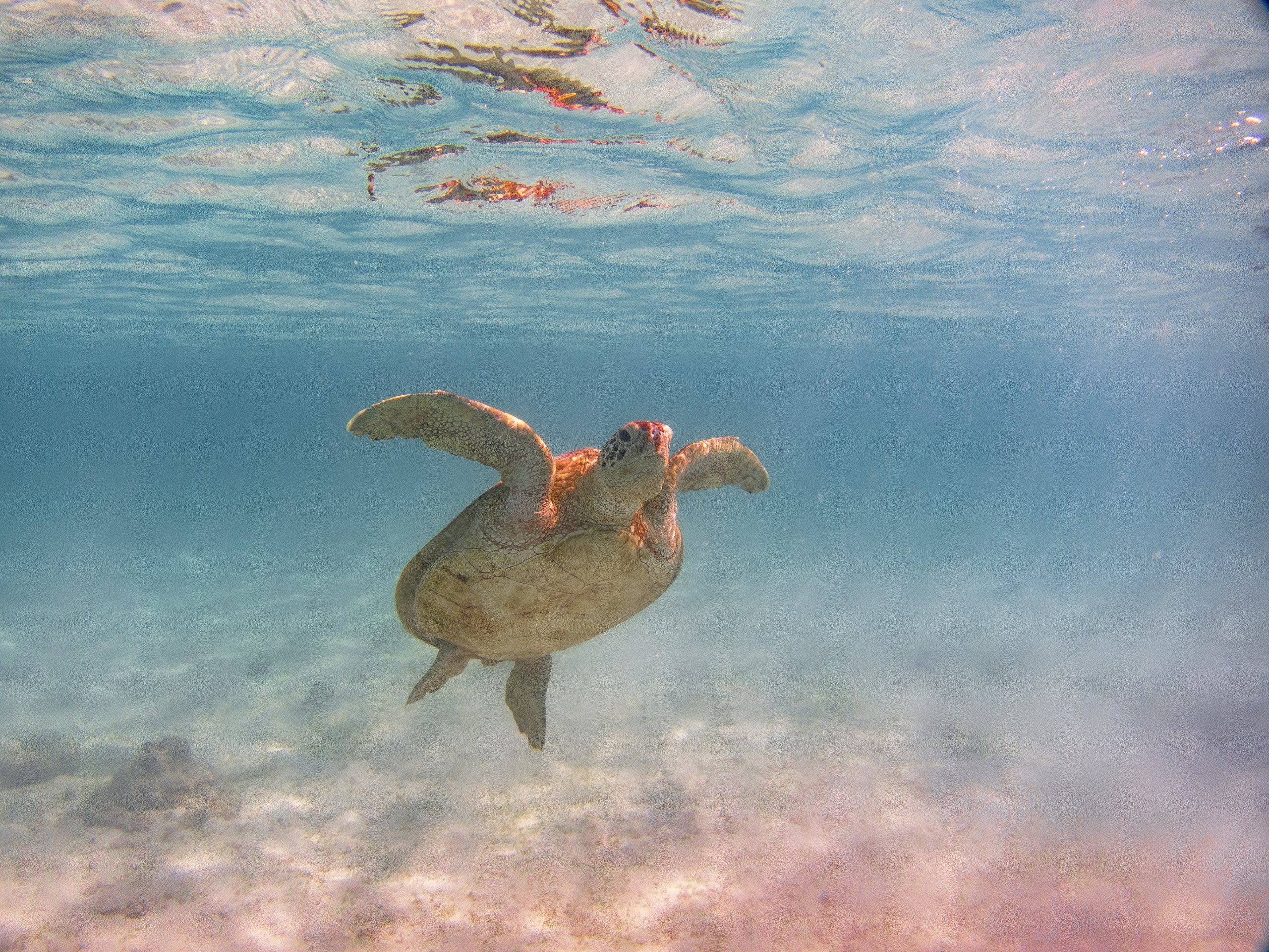 ウミガメが息継ぎするタイミングで何度もチャレンジ。