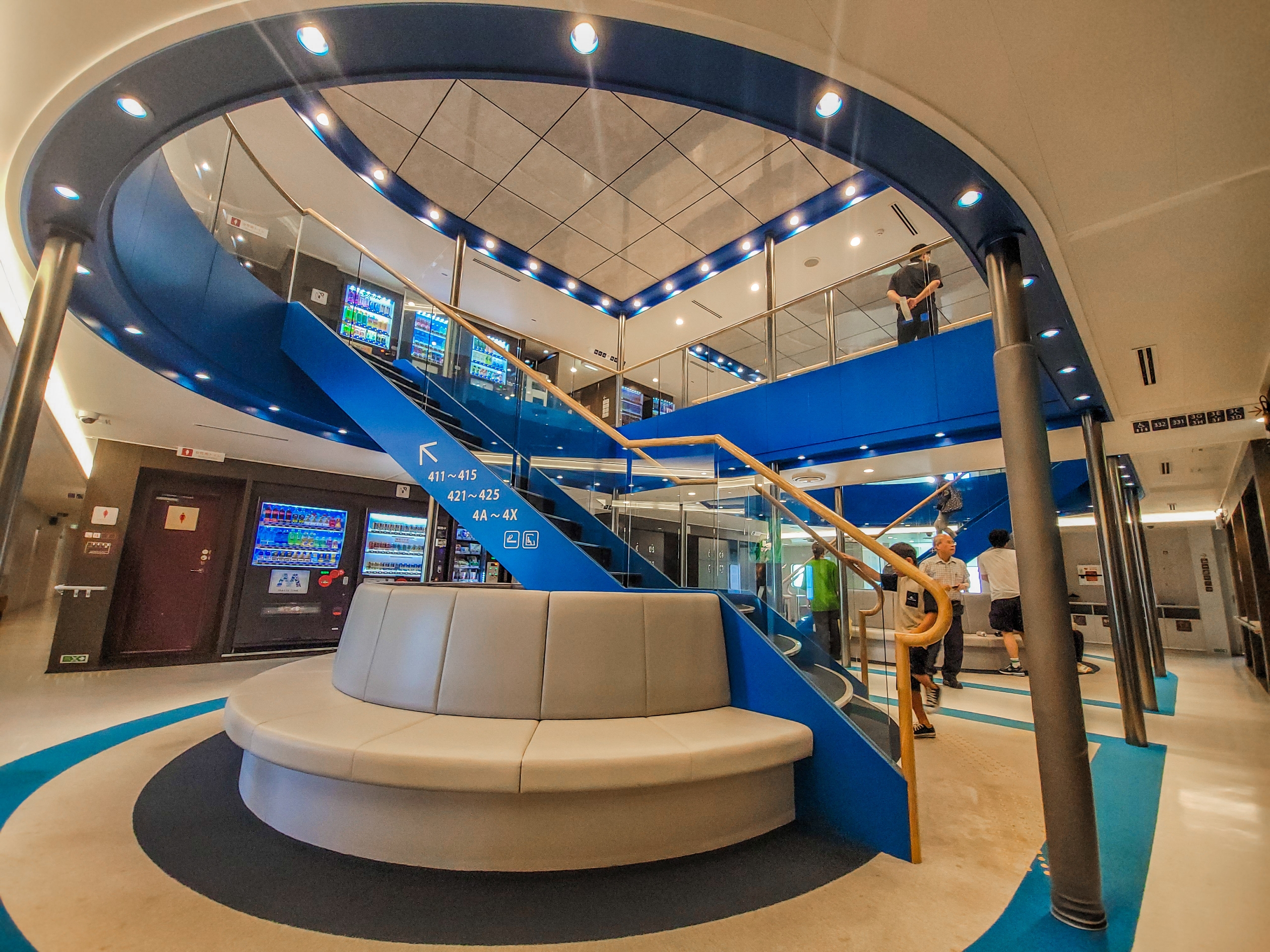 白と青を基調としたロビー。