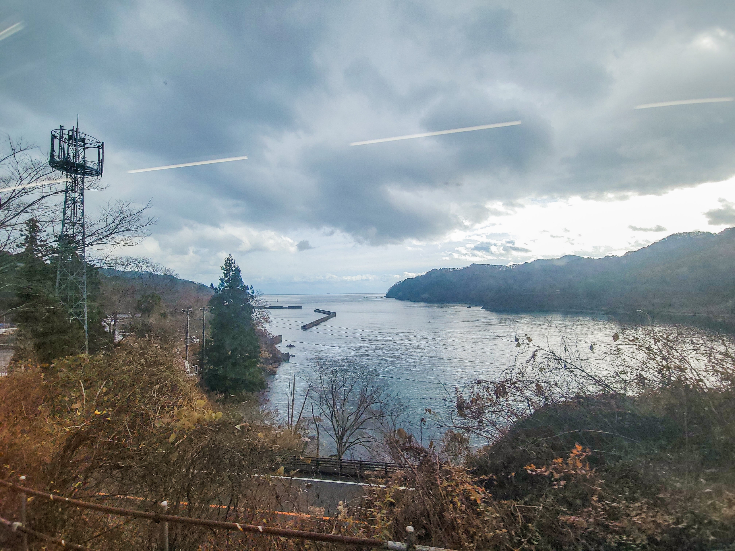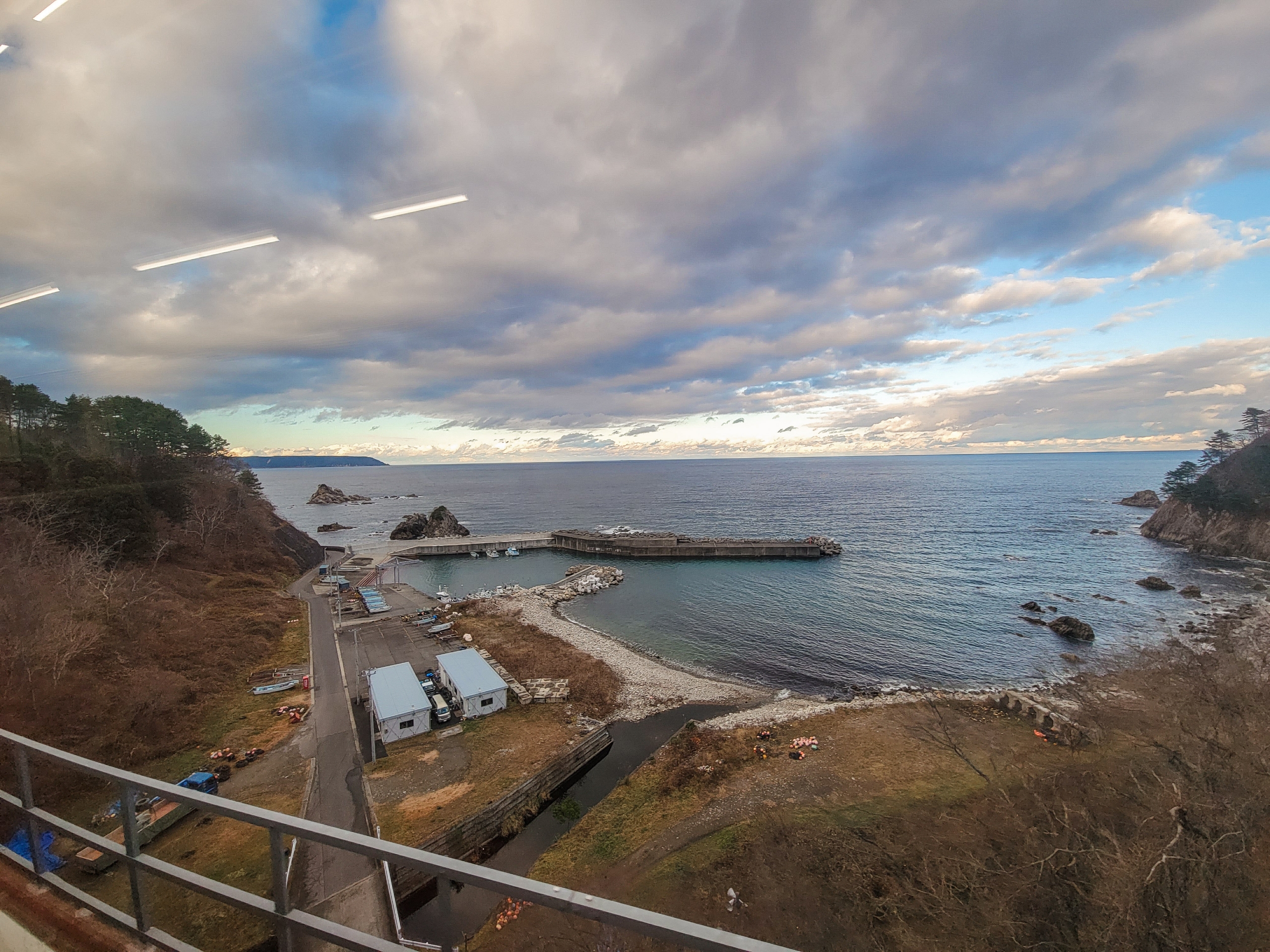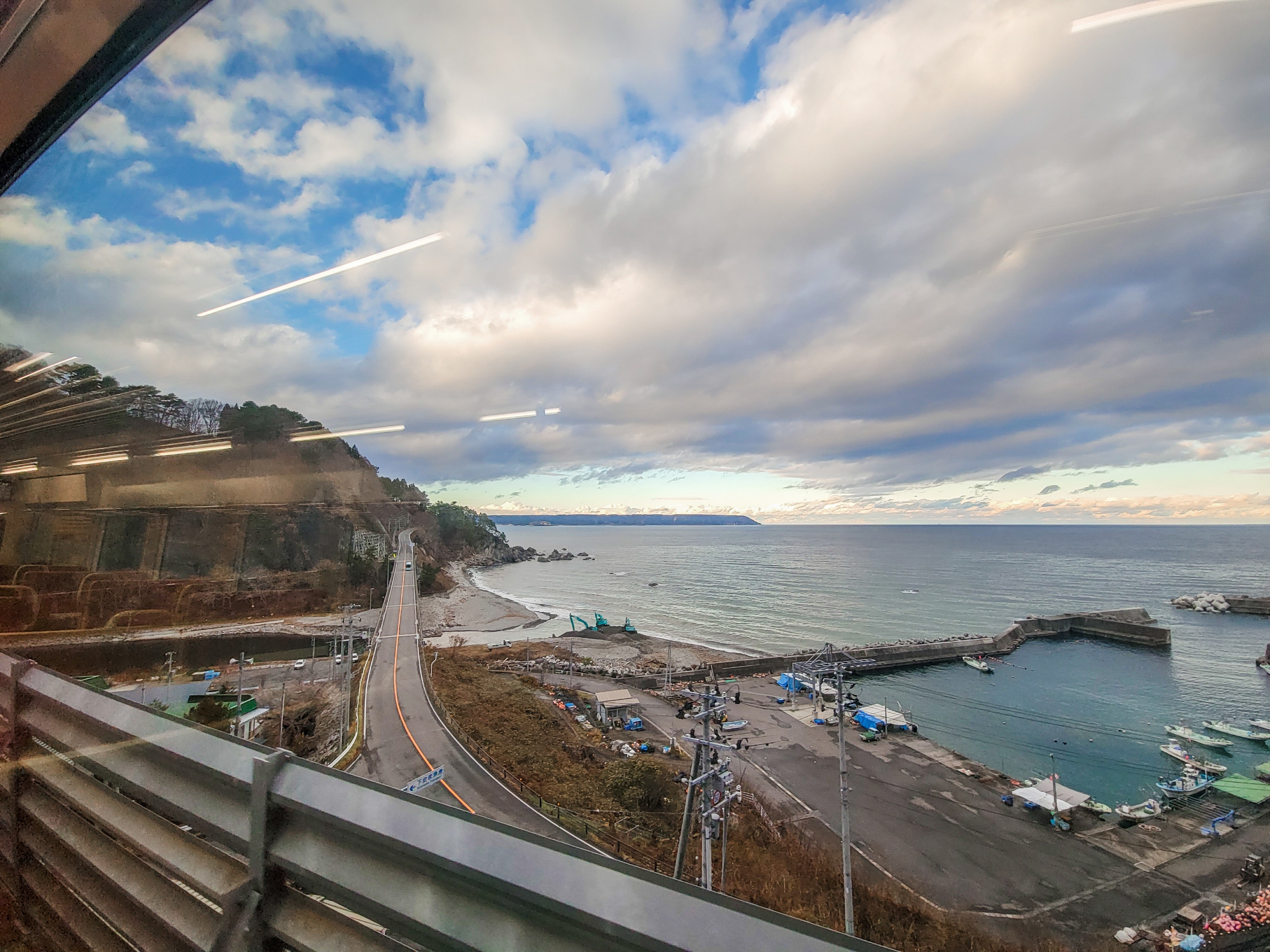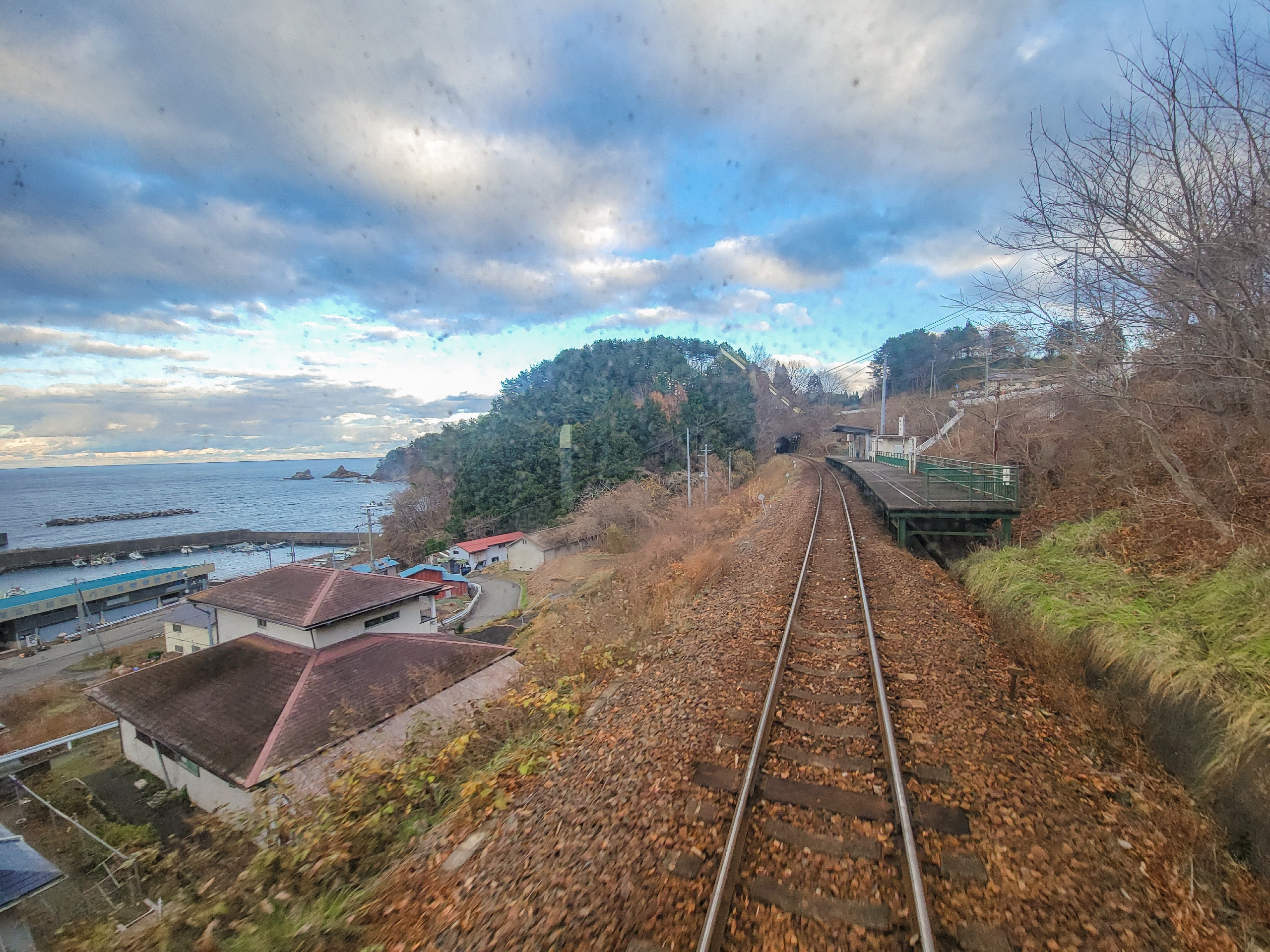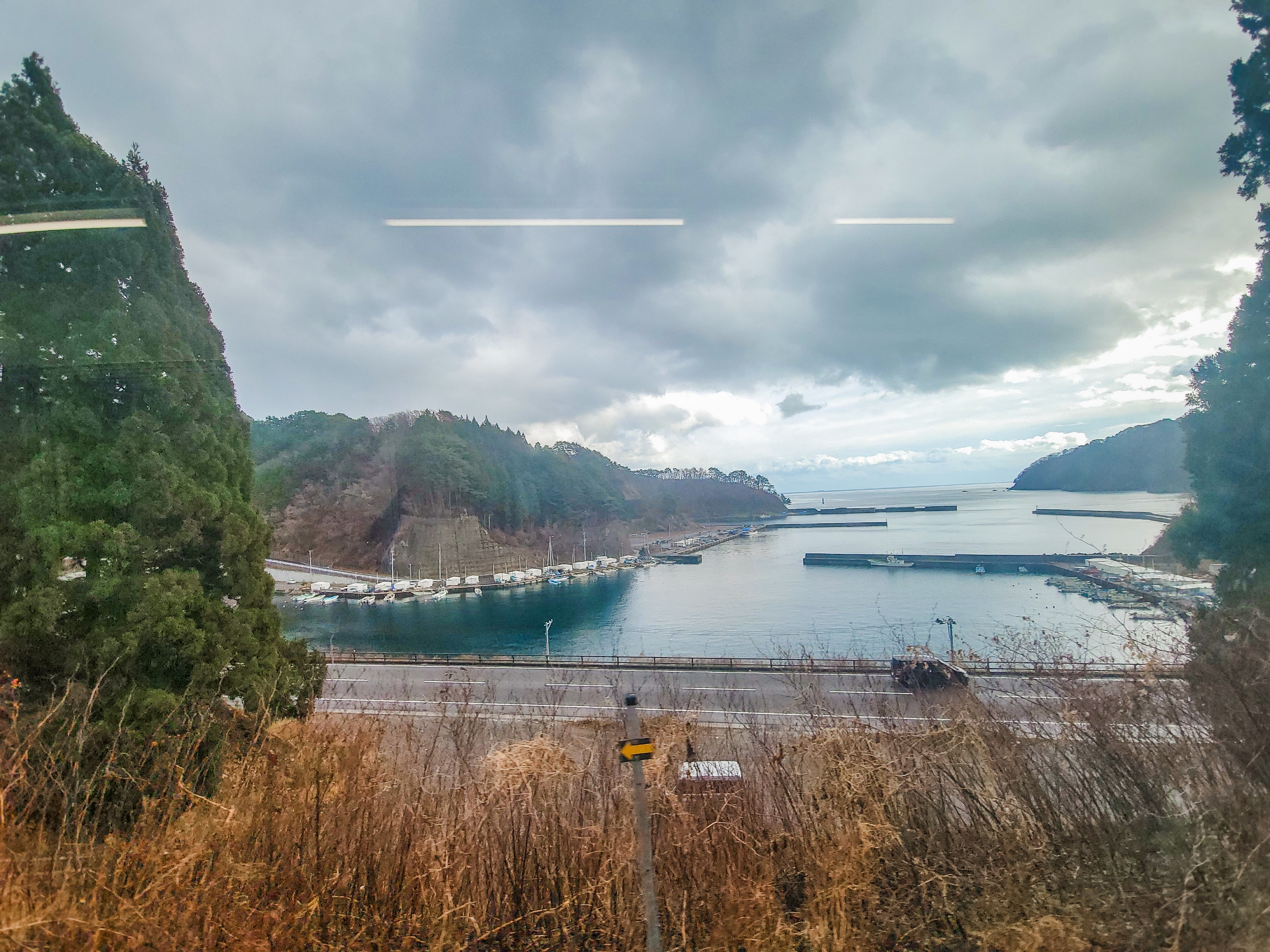 大沢橋梁では、橋の上で列車が速度を落としてくれるので、ゆっくり景色を眺めることができます。一番晴れてほしいタイミングで曇ってきてますが、すでに太陽が西の空低い位置にあるので、日差しが入ってこないのかもしれません。見えているのは沢漁港です。