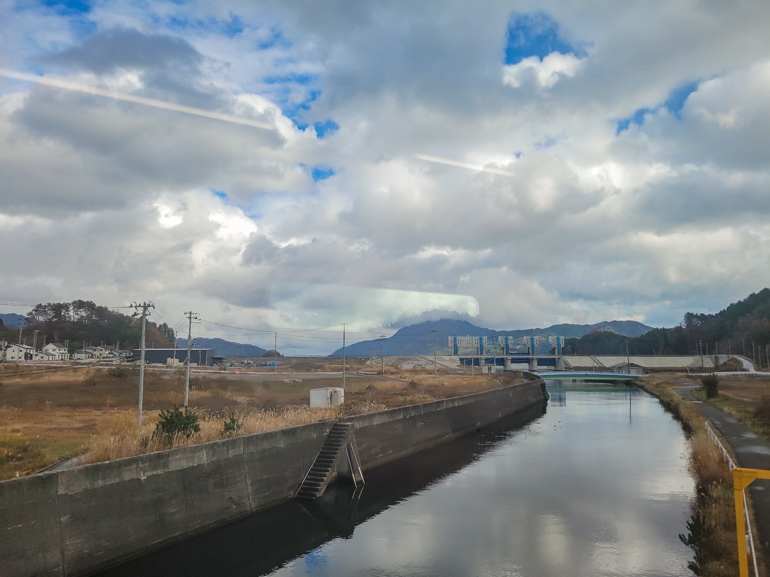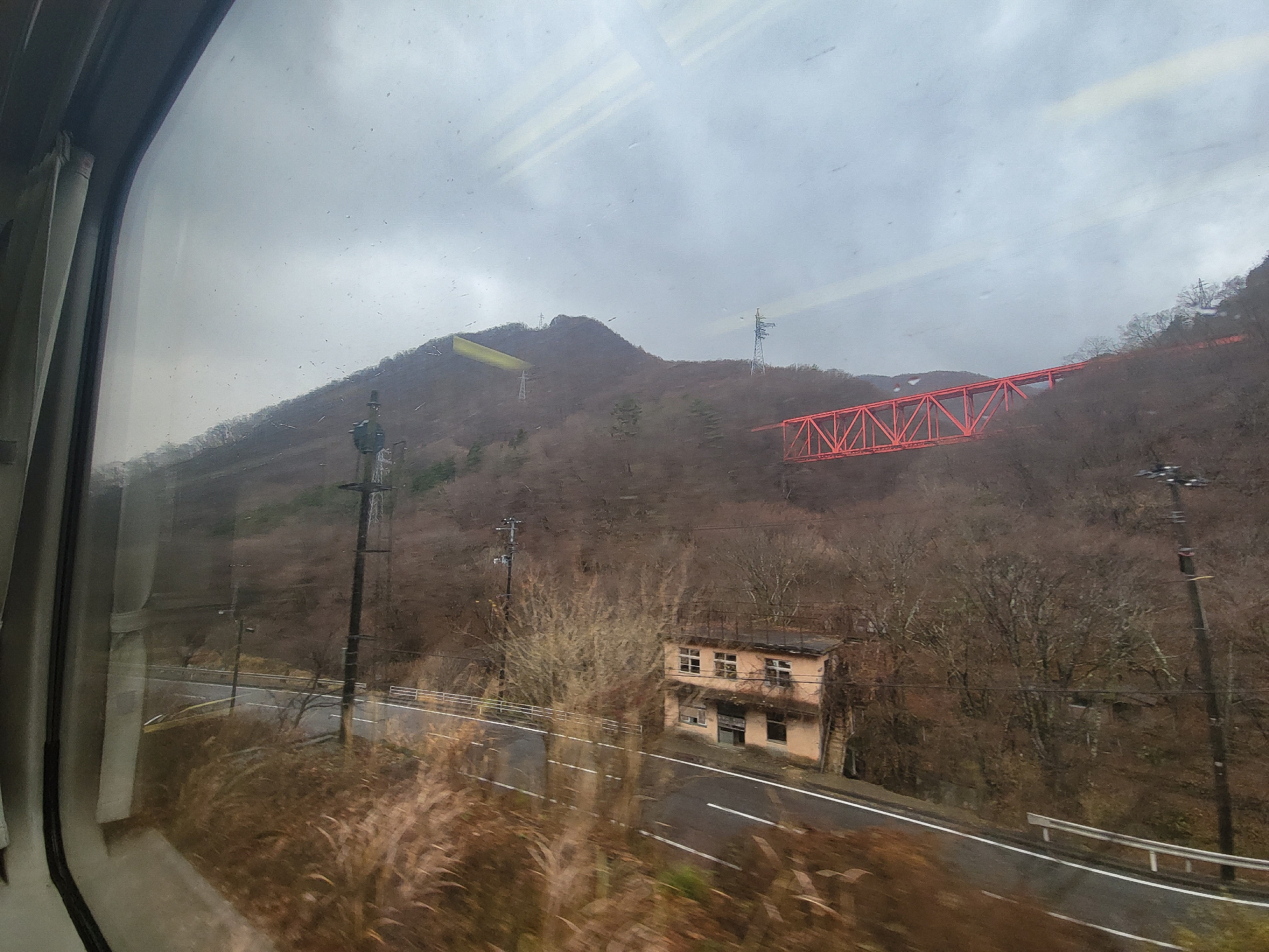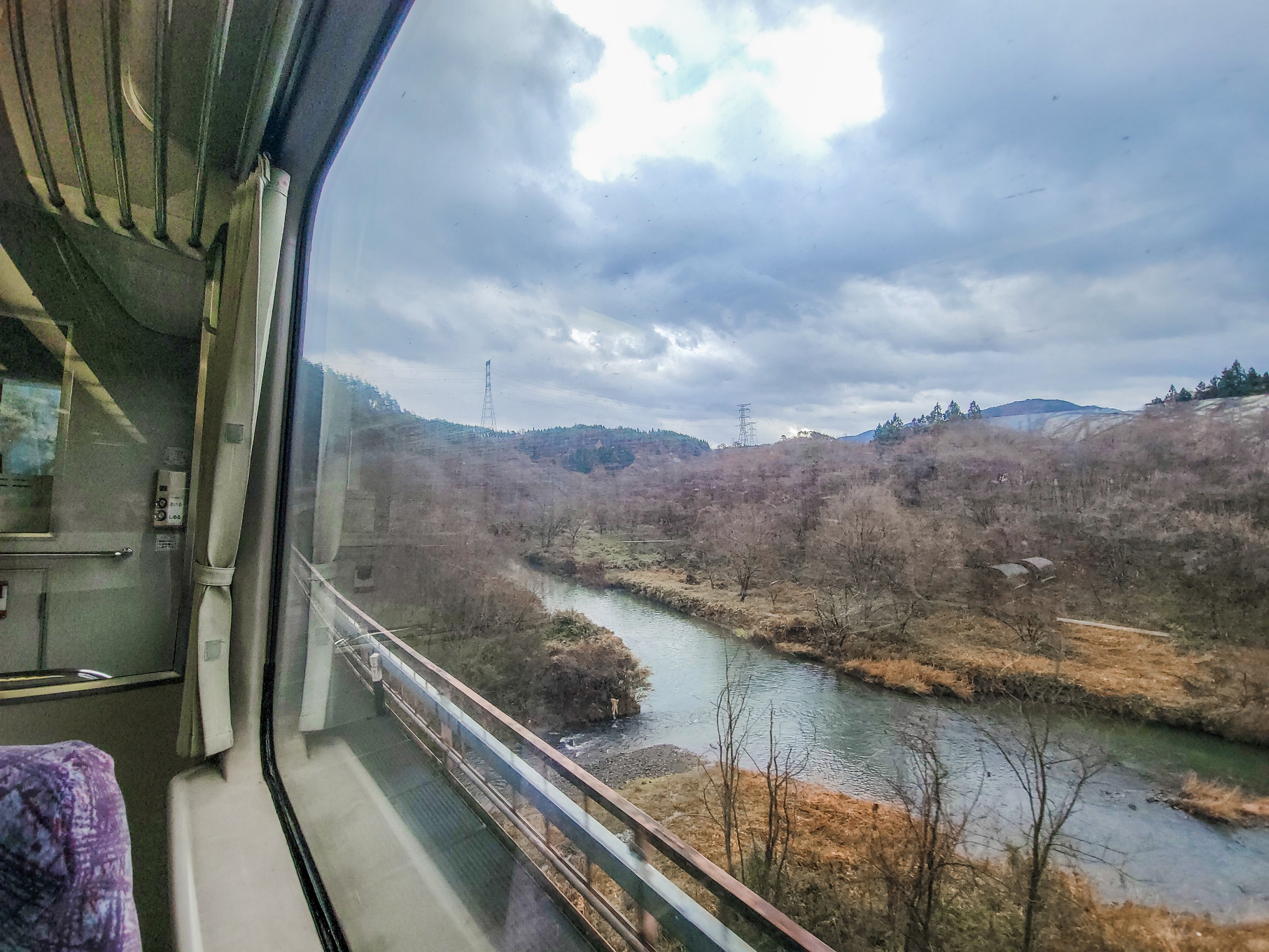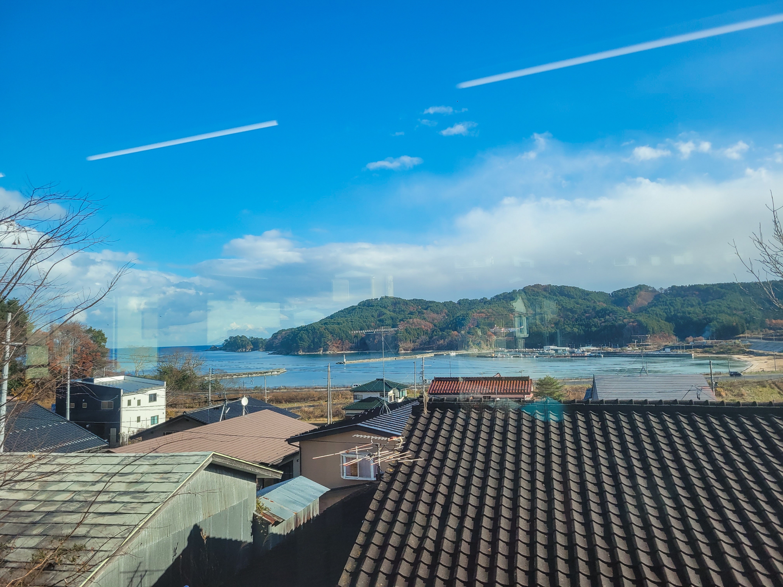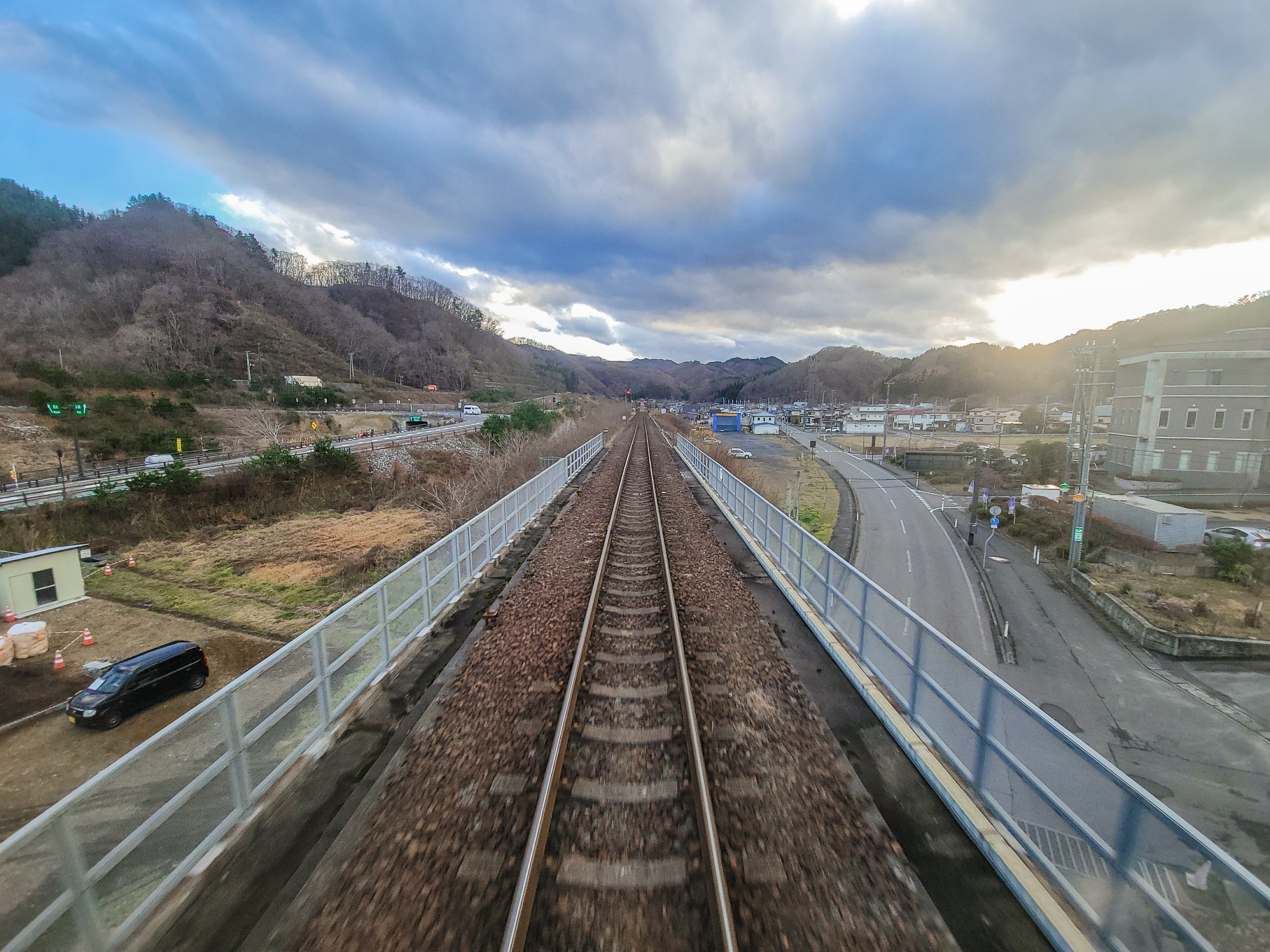 大沢橋梁では、橋の上で列車が速度を落としてくれるので、ゆっくり景色を眺めることができます。一番晴れてほしいタイミングで曇ってきてますが、すでに太陽が西の空低い位置にあるので、日差しが入ってこないのかもしれません。見えているのは沢漁港です。