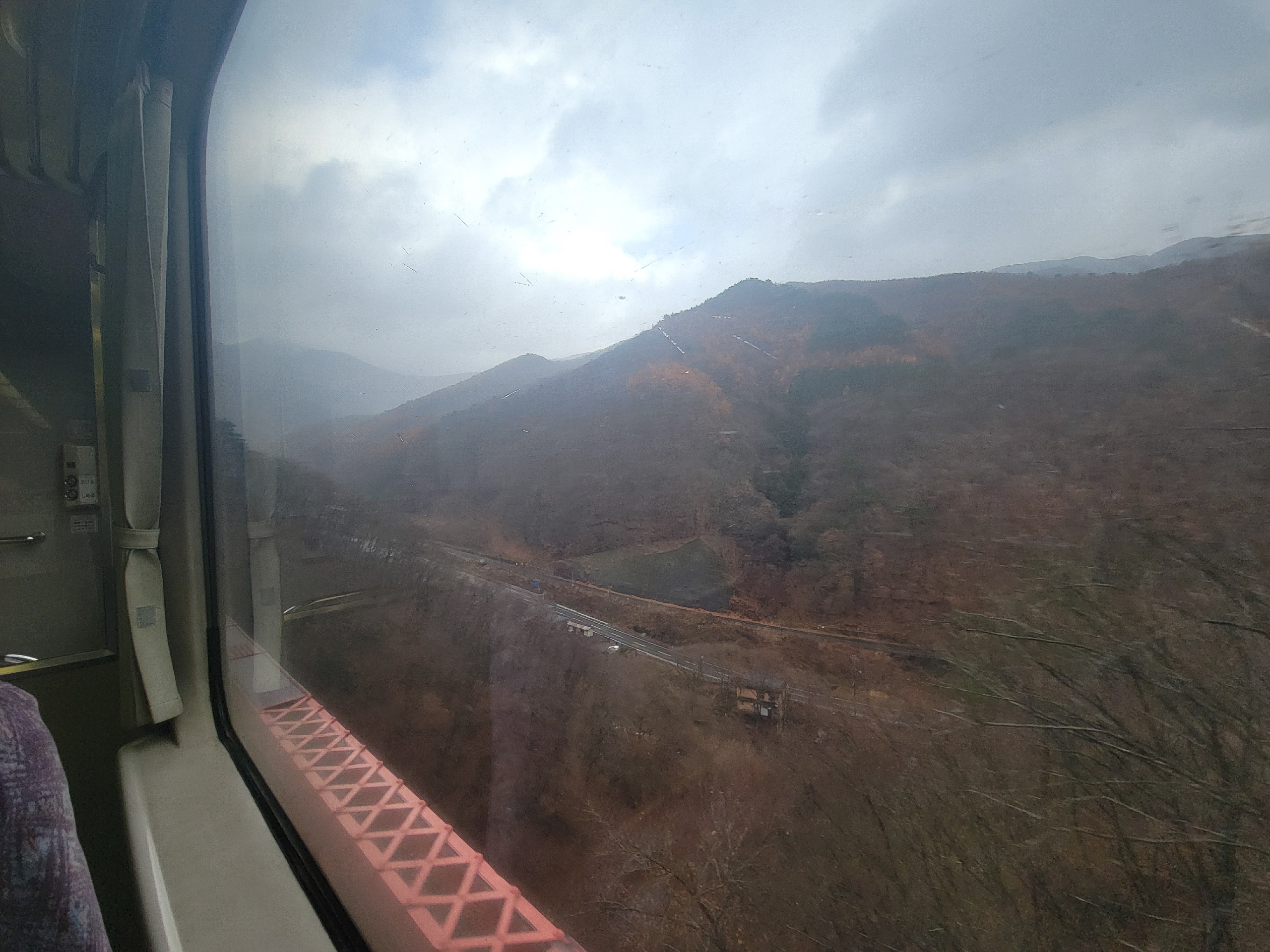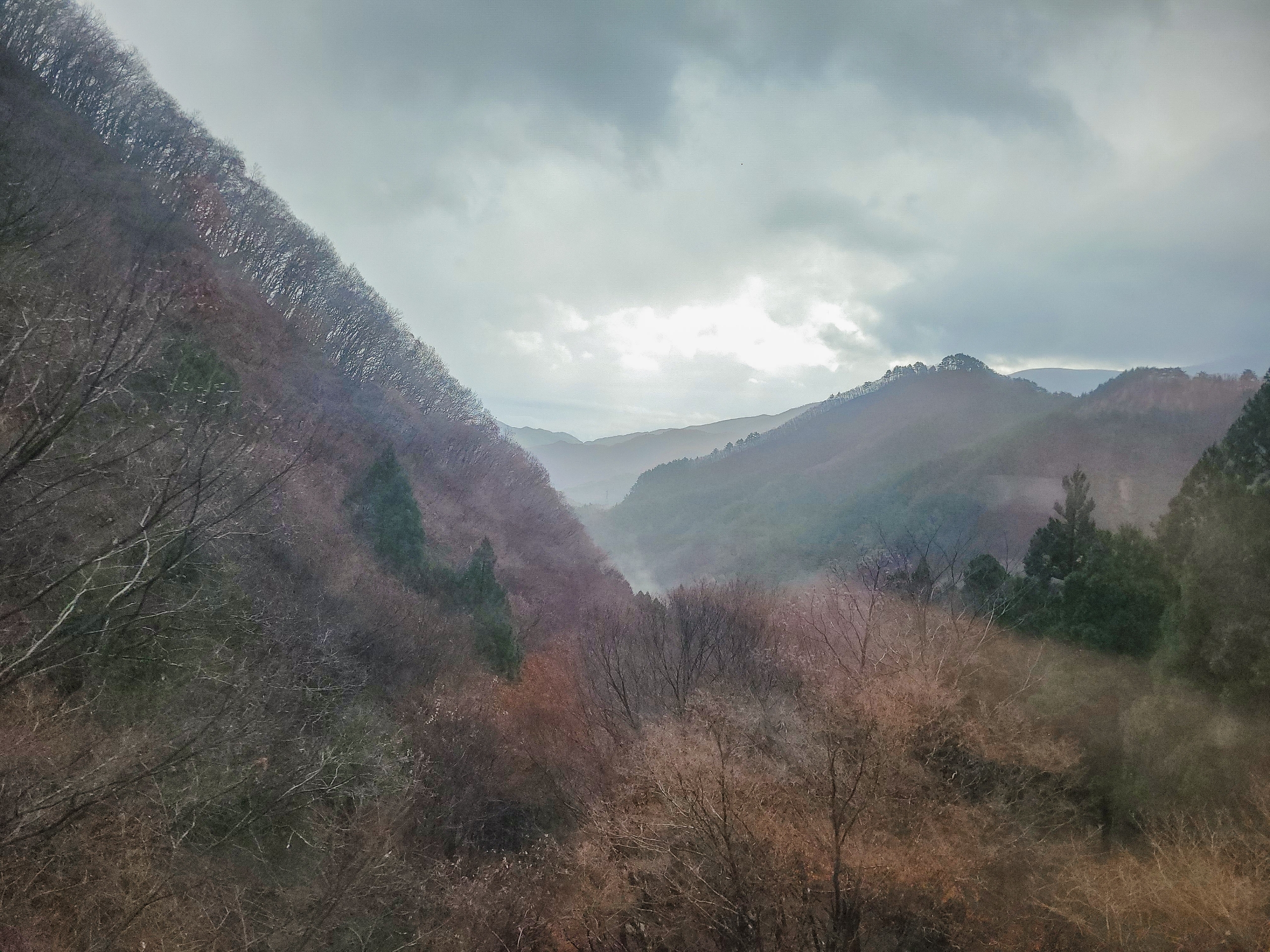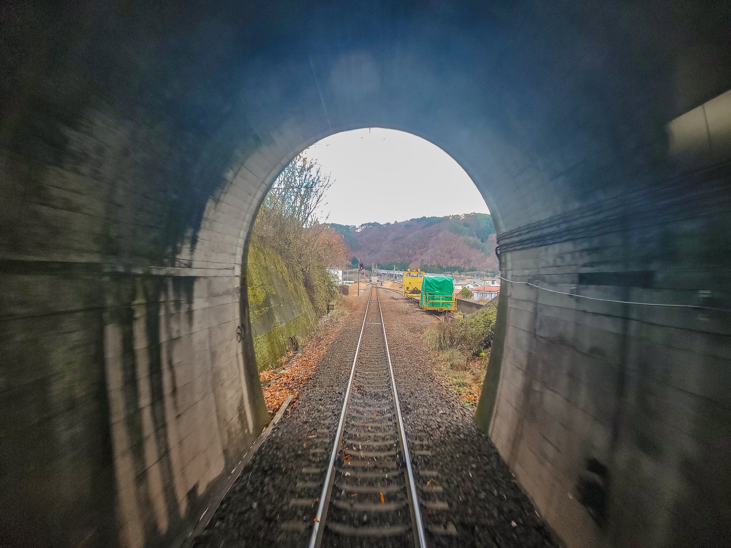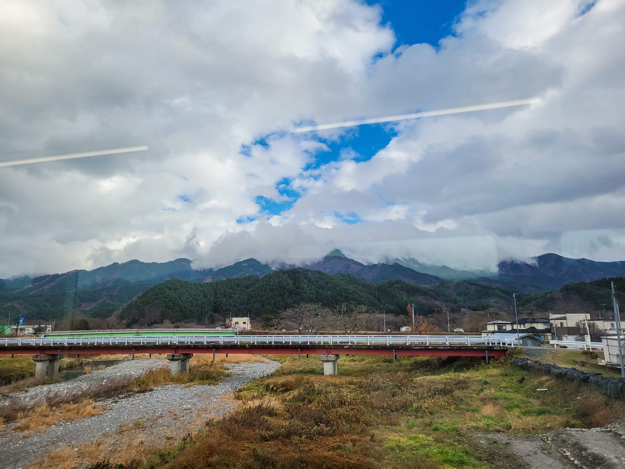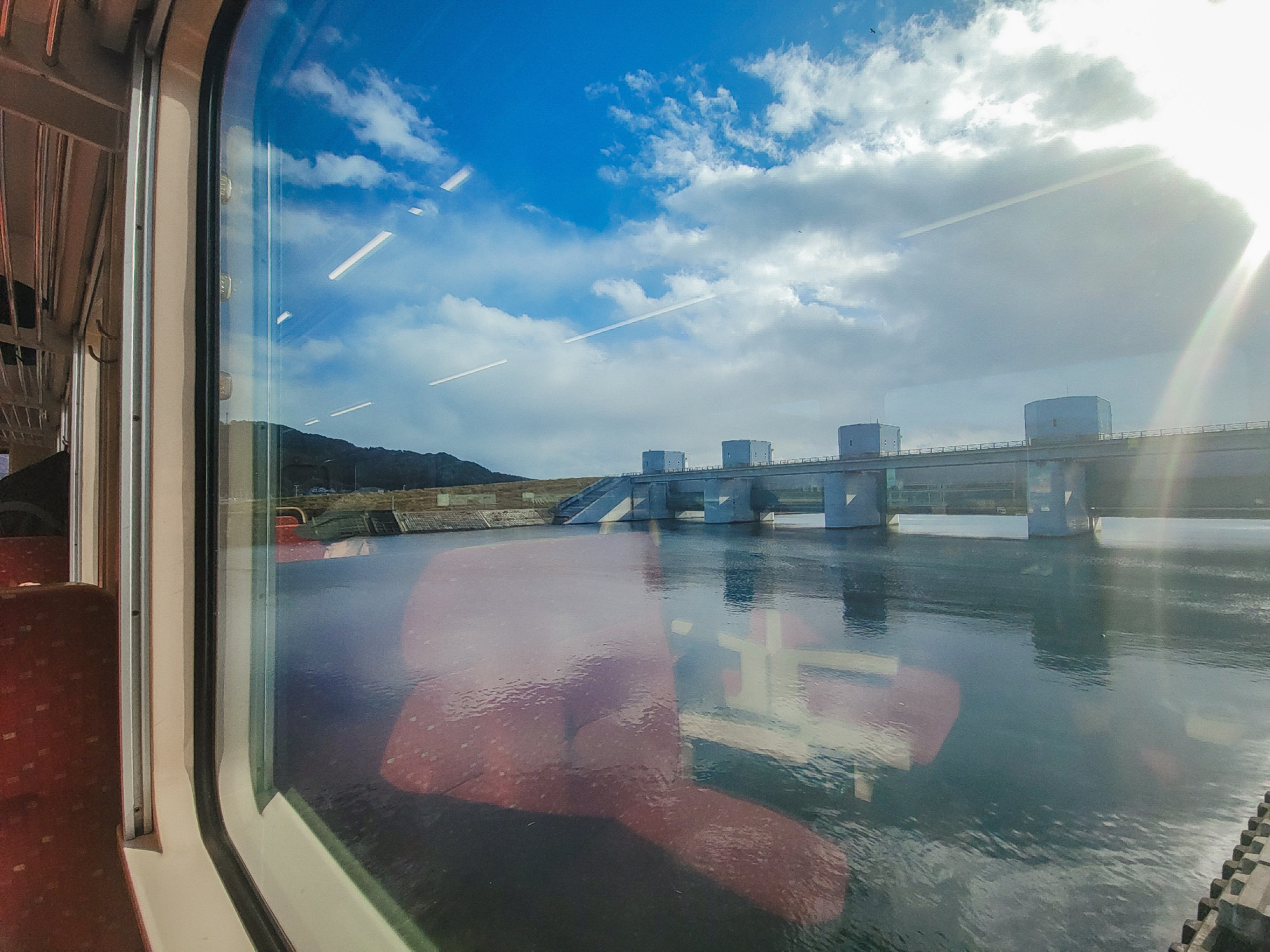 大沢橋梁では、橋の上で列車が速度を落としてくれるので、ゆっくり景色を眺めることができます。一番晴れてほしいタイミングで曇ってきてますが、すでに太陽が西の空低い位置にあるので、日差しが入ってこないのかもしれません。見えているのは沢漁港です。