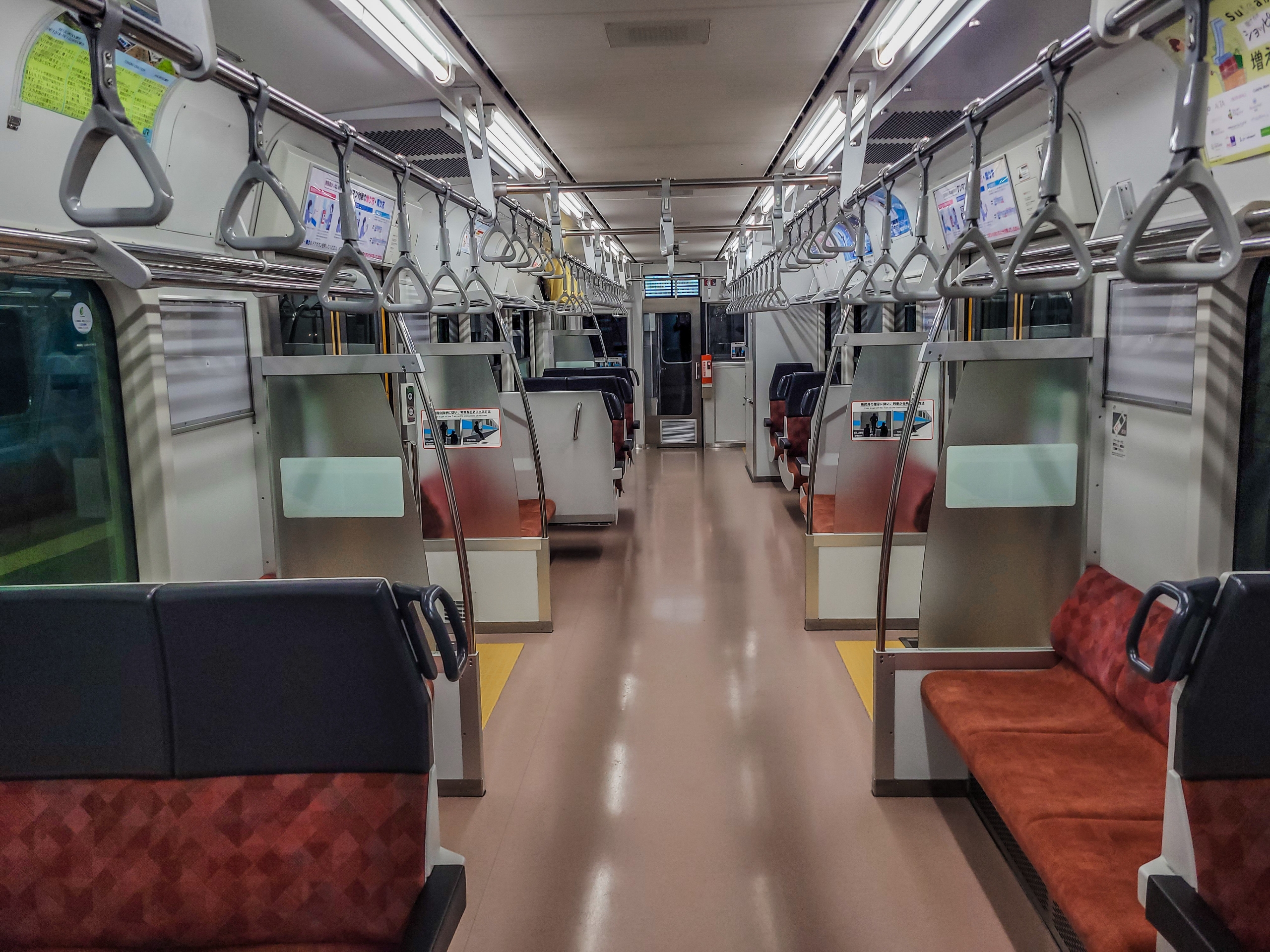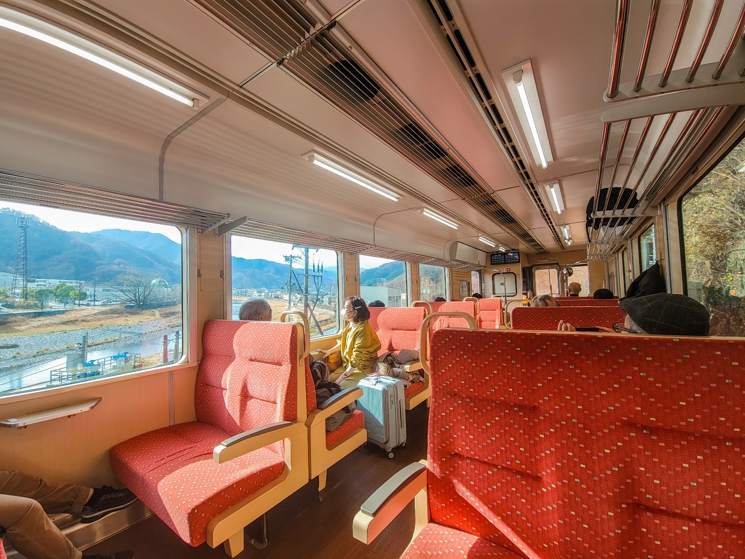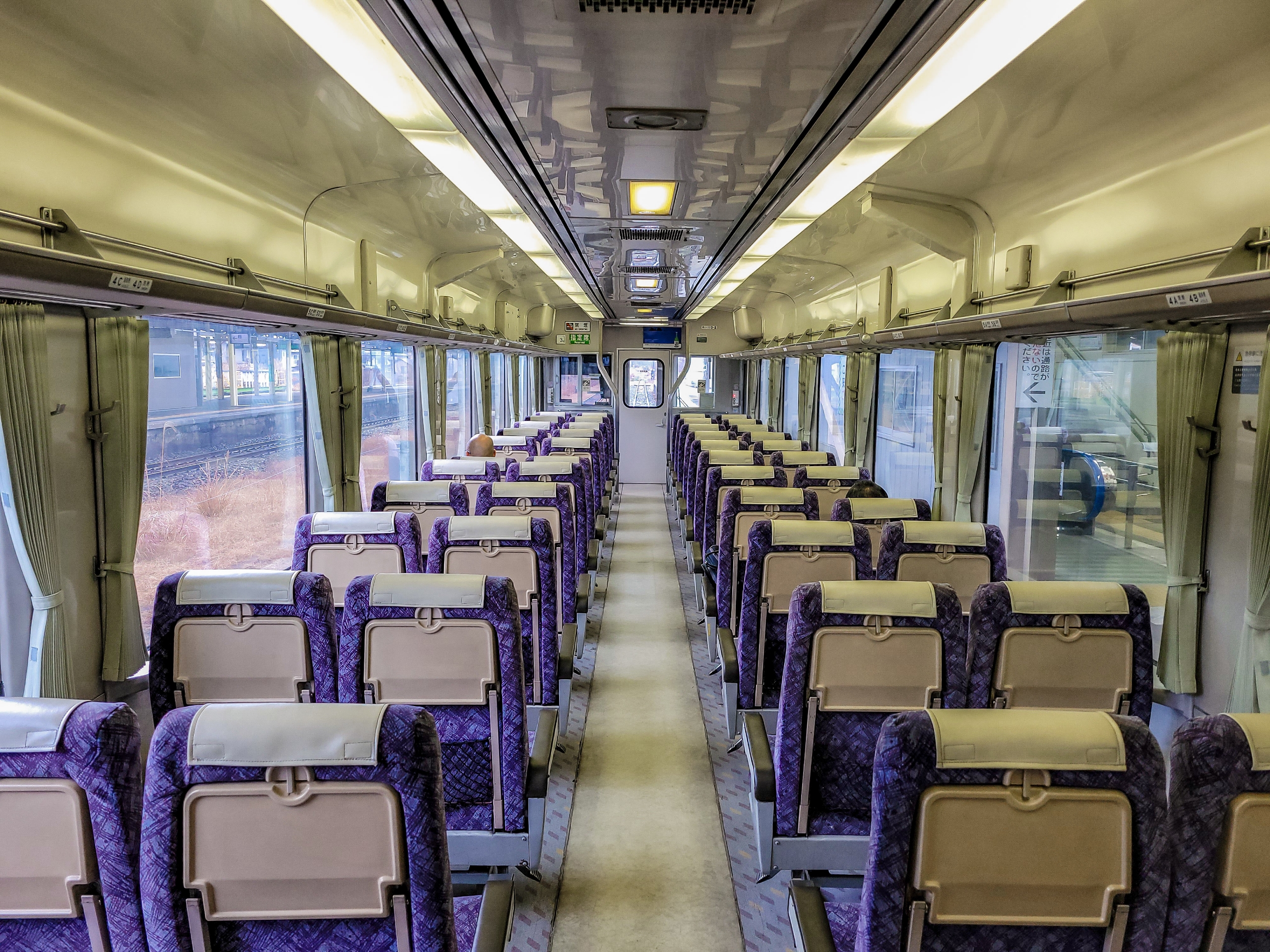 無事海側の座席ゲット。新車のように綺麗な車内 窓はピカピカでとても 外の景色がよく見えそう。オールボックスシートでしたが無事乗客全員がまんべんなく座ることができたようです。
